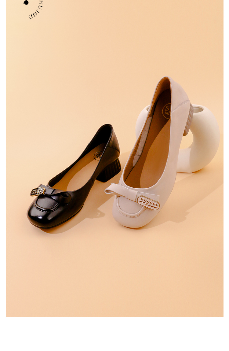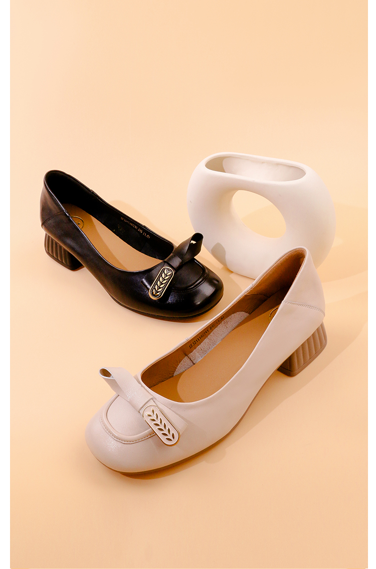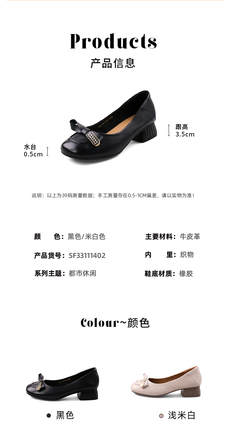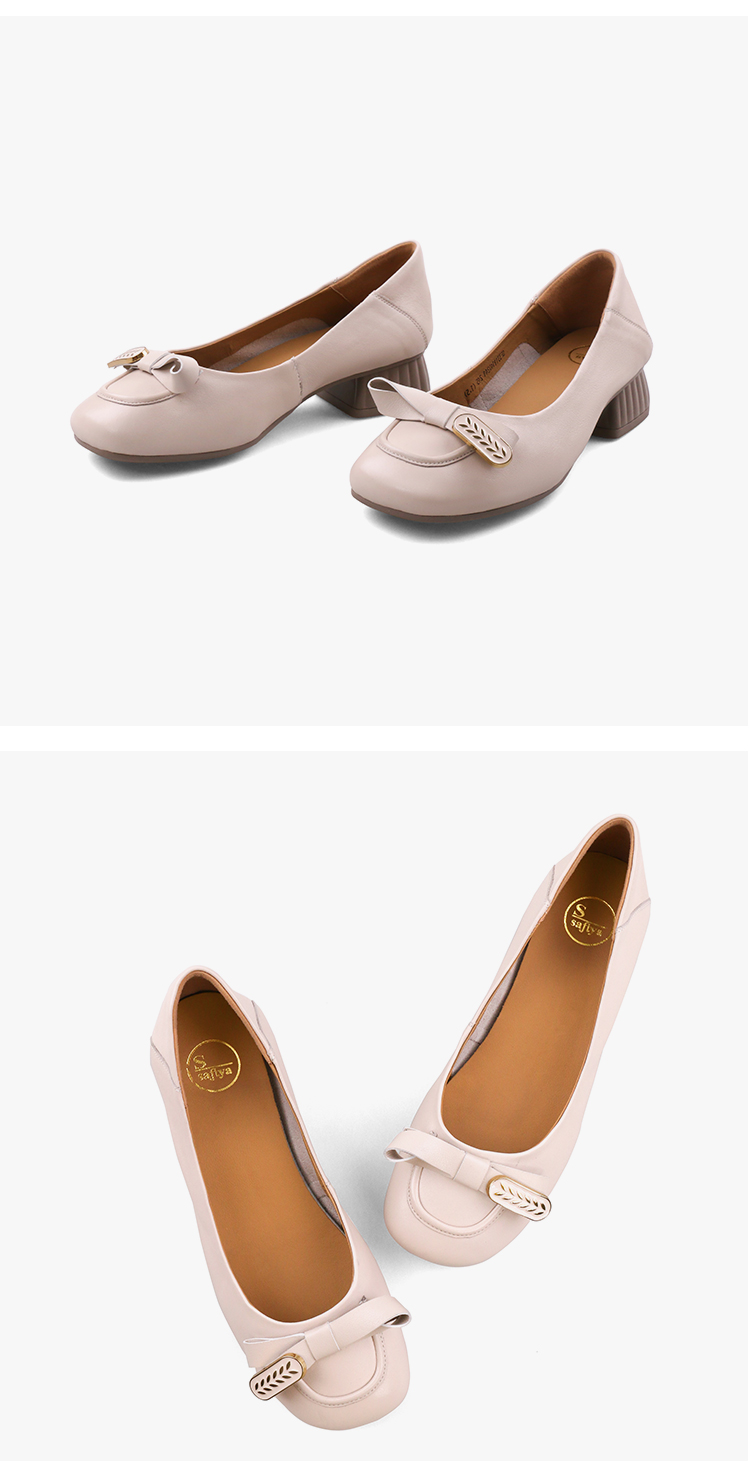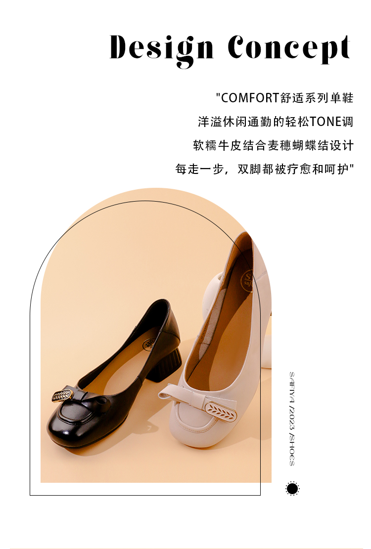 Safiya/索菲娅2023秋季新款真皮粗跟休闲麦穗蝴蝶结软底粗跟浅口单鞋SF33111402