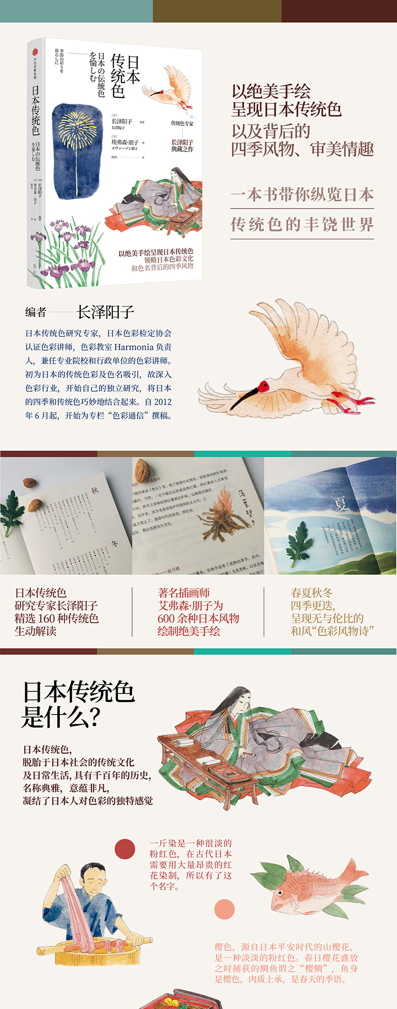 日本传统色约有1100种,传统色研究专家长泽阳子从中精选了160种具代表性的颜色,配以优美文字和精致手绘,成就了这本色彩美学赏鉴之作——《日本传统色》。