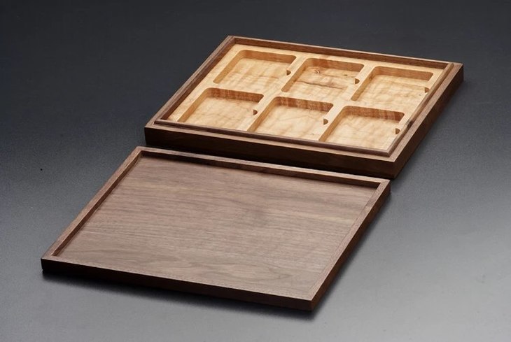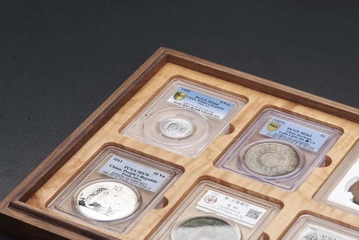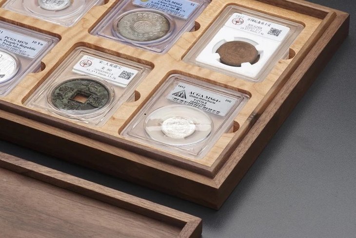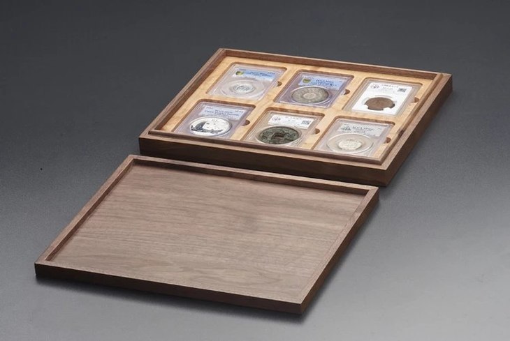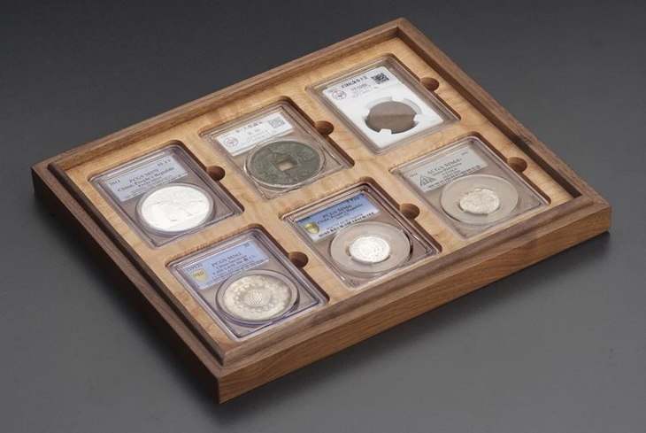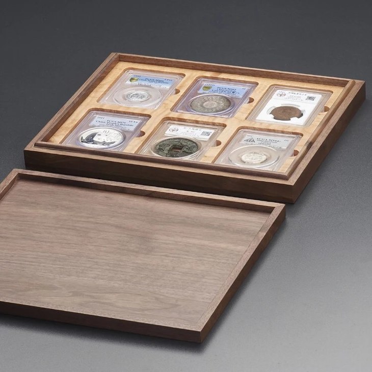 黑胡桃(枫木)单层实木托盘(6枚装PCGS型),外盒尺寸:264*220*35mm,适用于市场上常见的各种PCGS型评级币!如:PCGS各时期盒,ACCA,PCCB第1代盒,ACGA,公博透明盒等,为了加强盒子的更安全性,避免温差与天气干湿带来的盒子变型与开裂脱胶,主盒与盖四边采用黑胡桃实木,盒盖上面二个面用DMF贴厚黑胡桃实木;里面全枫木CNC缕槽,四边嵌边工艺制作,以力保整体美观,精细,安全,耐用!
