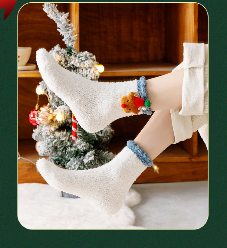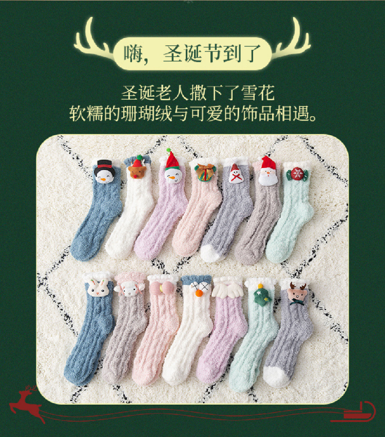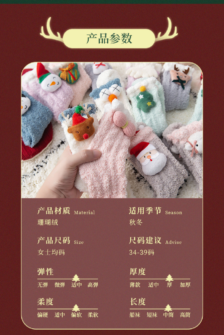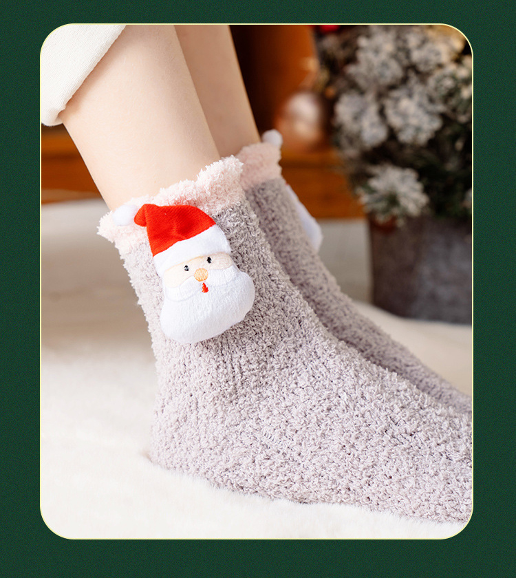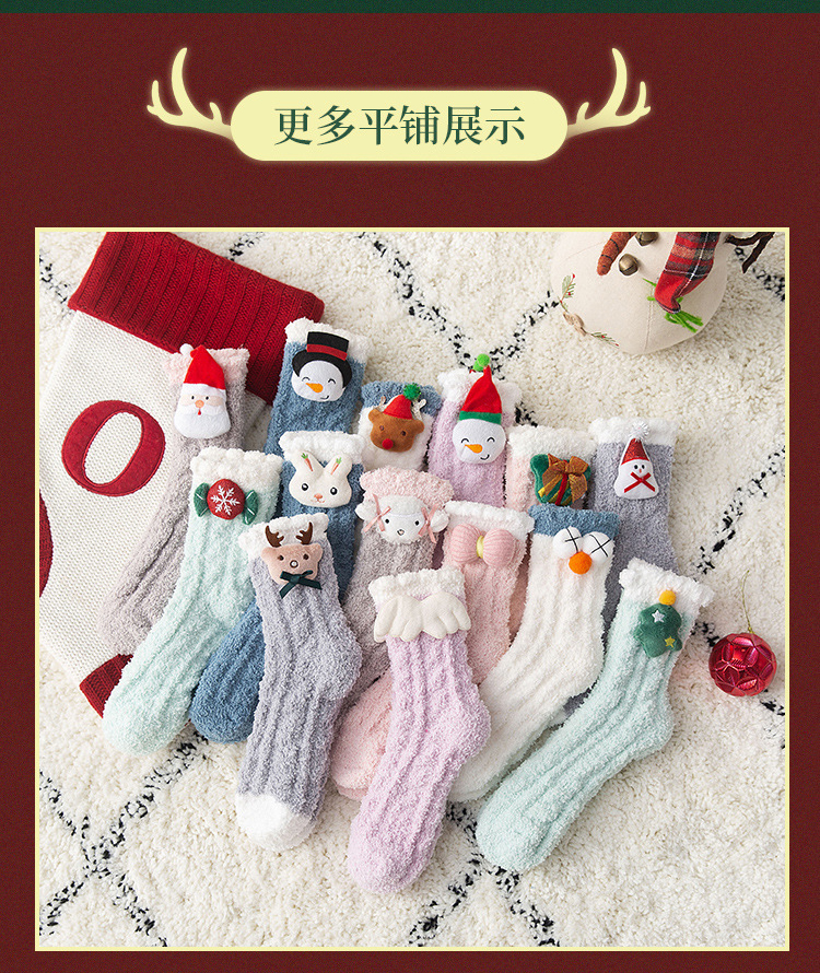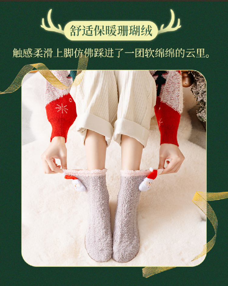 【圣诞礼物】秋冬3双加厚珊瑚绒立体公仔袜 可爱卡通中筒袜圣诞袜居家地板袜