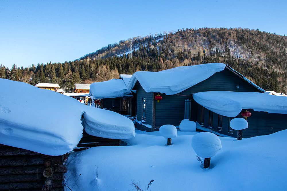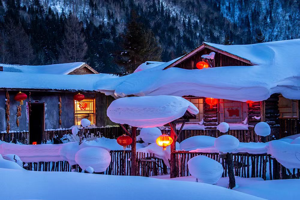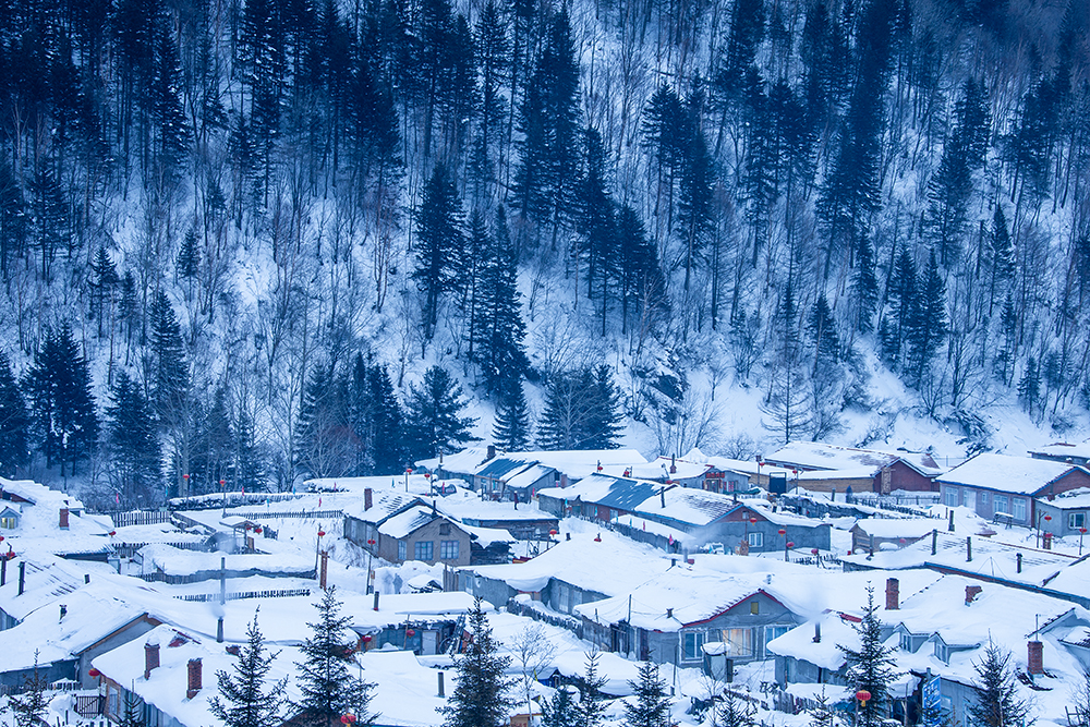 这里的木屋错落有致,绵密的积雪覆盖房顶,形成独特的“蘑菇屋”。由于大山深处地形山貌,积雪之大,气温特殊使这里形成了神奇的冰雪奇观的童话世界,傍晚时分蓝蓝的天空,高挂的红灯笼,袅袅炊烟,房屋上厚厚的积雪吸引着大批中外摄影家们来此寻求艺术灵感和创作。