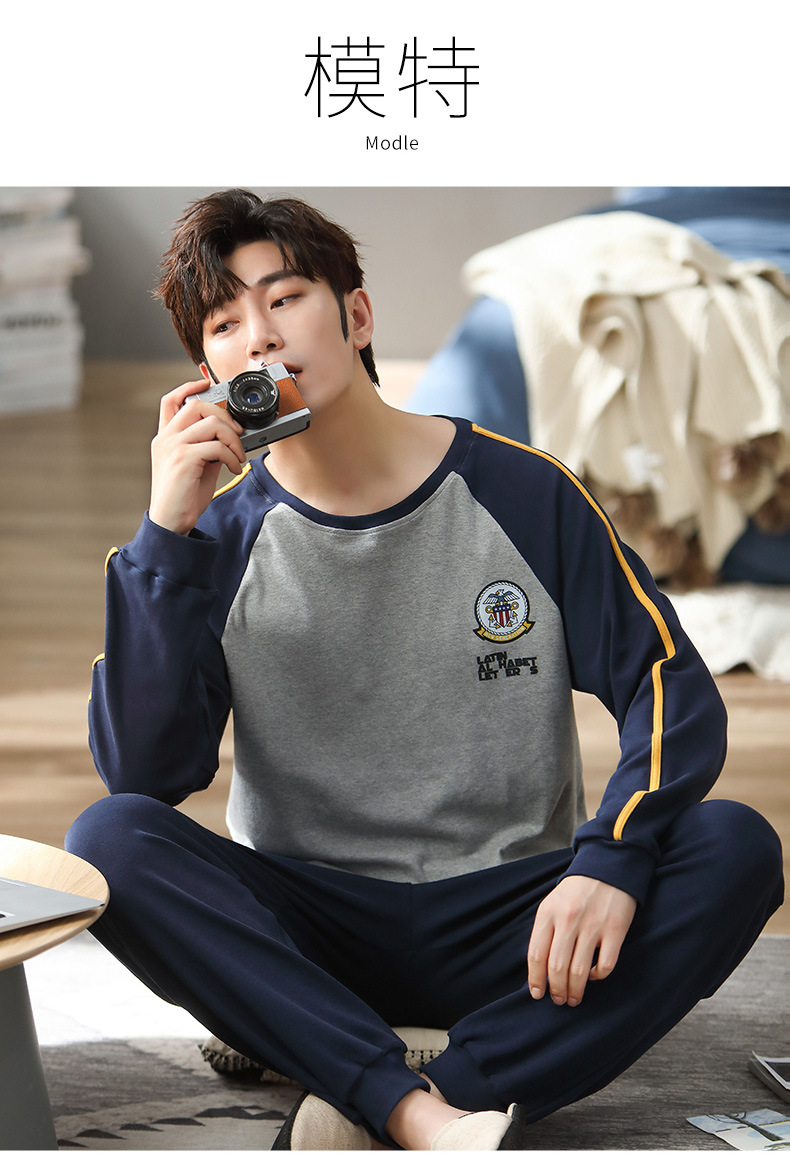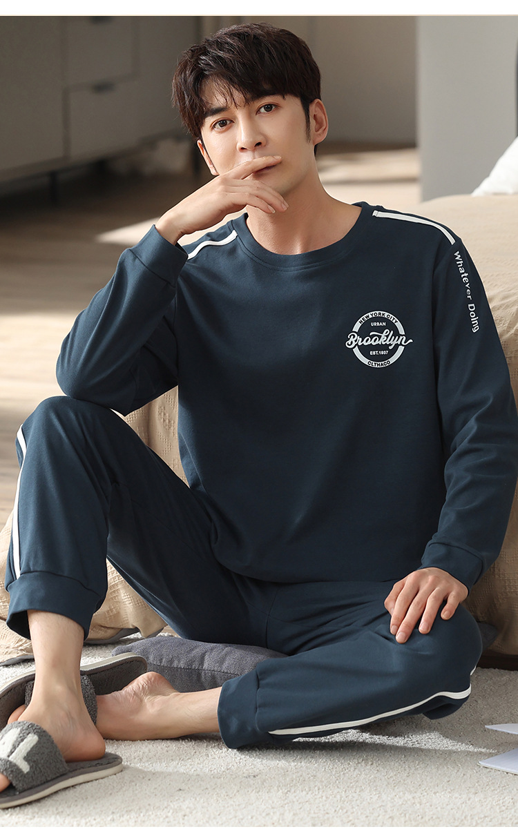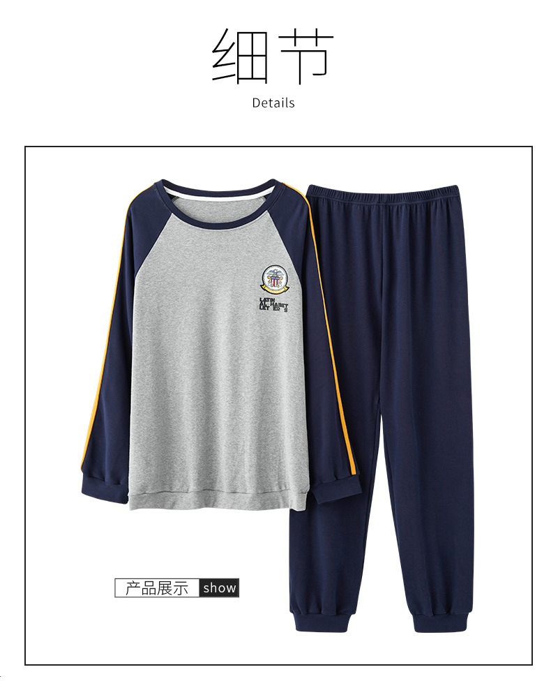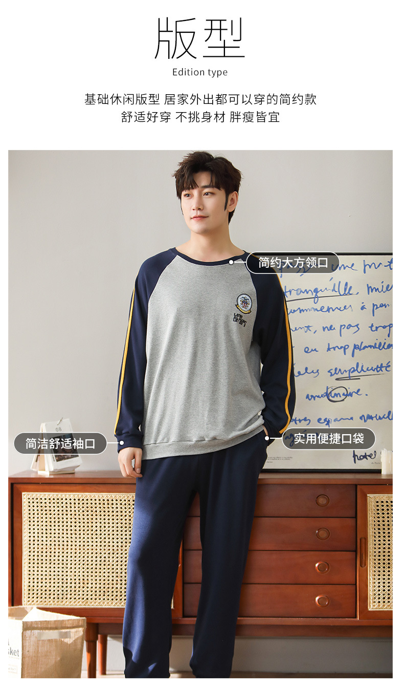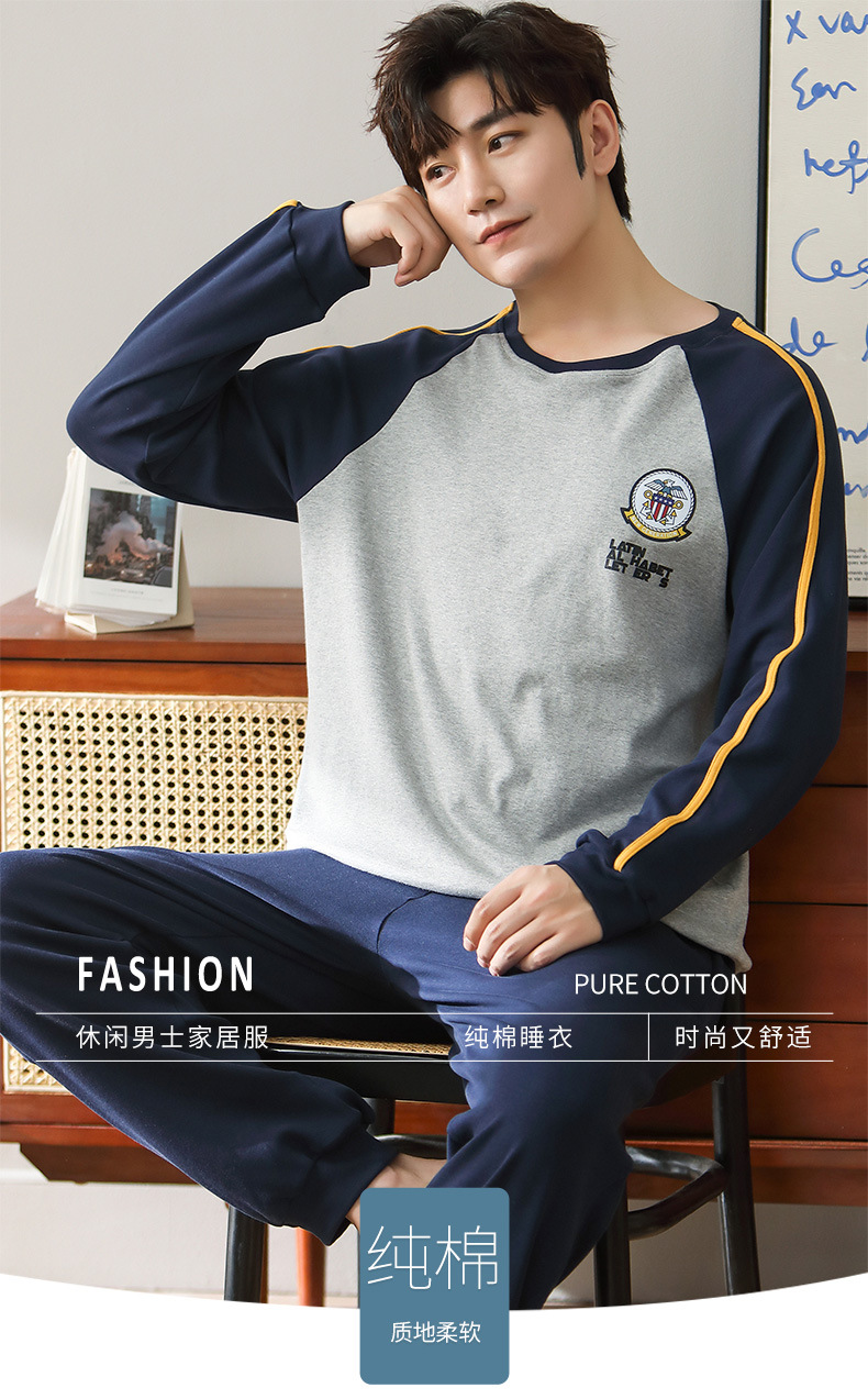 新品纯棉男士睡衣长袖长裤可外穿圆领透气两件套家居服男