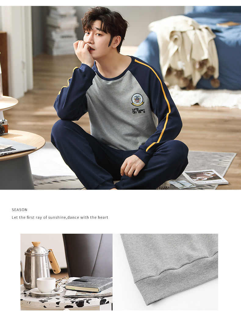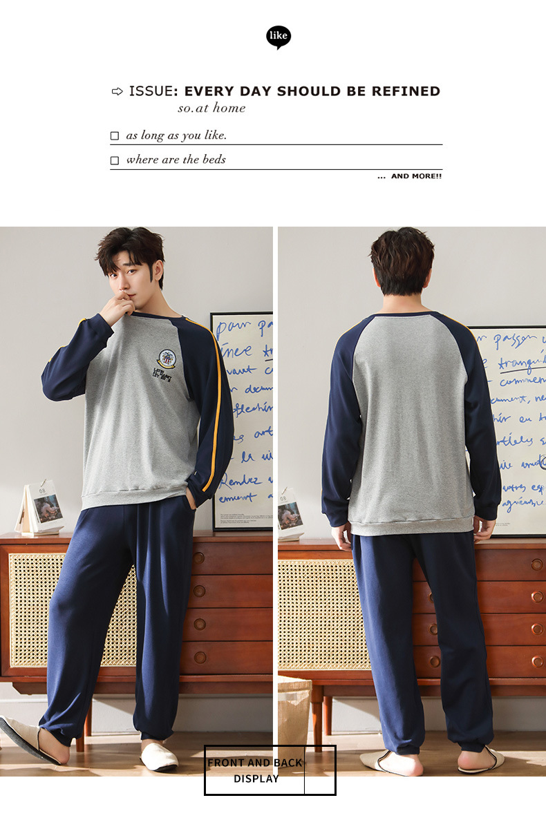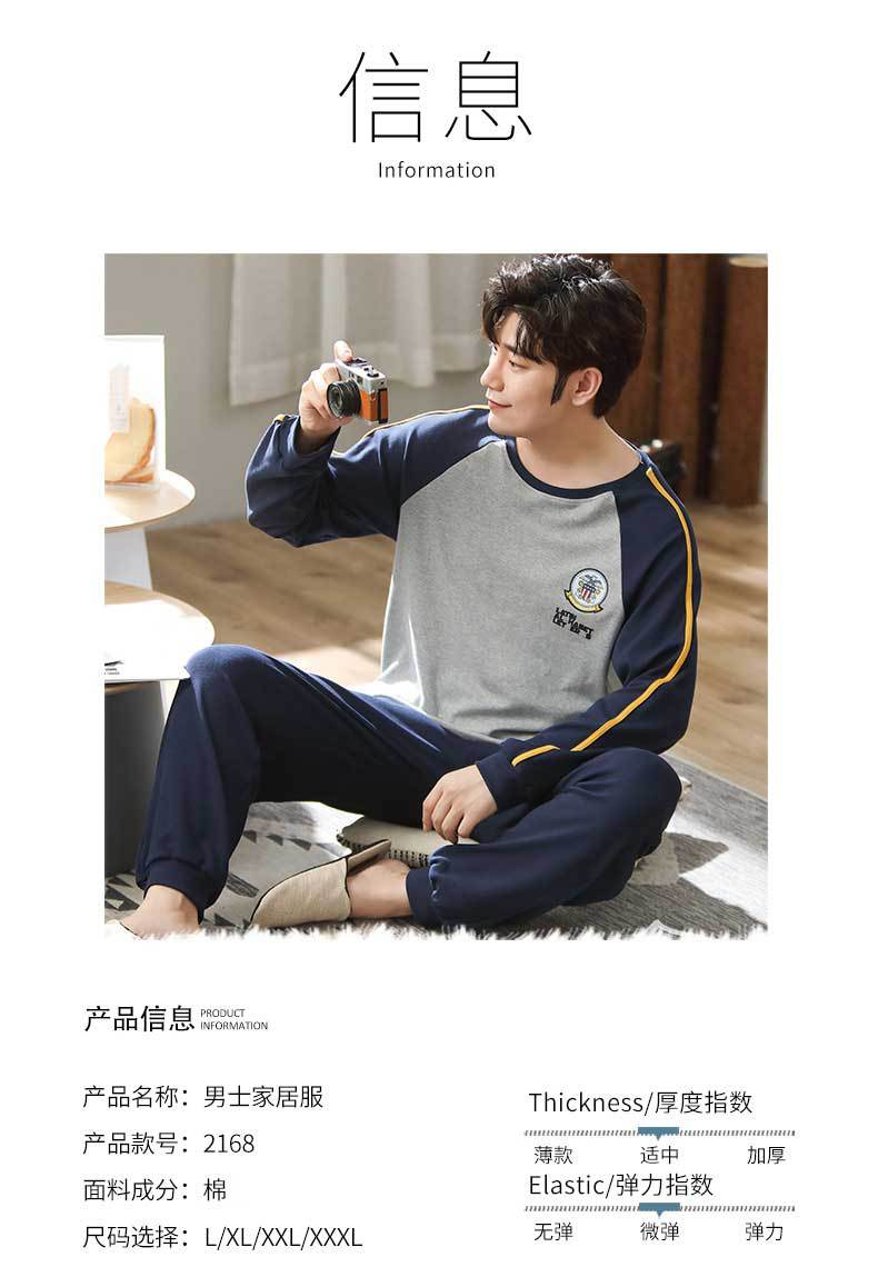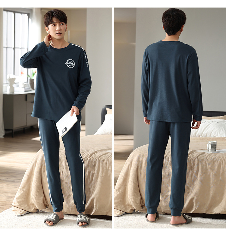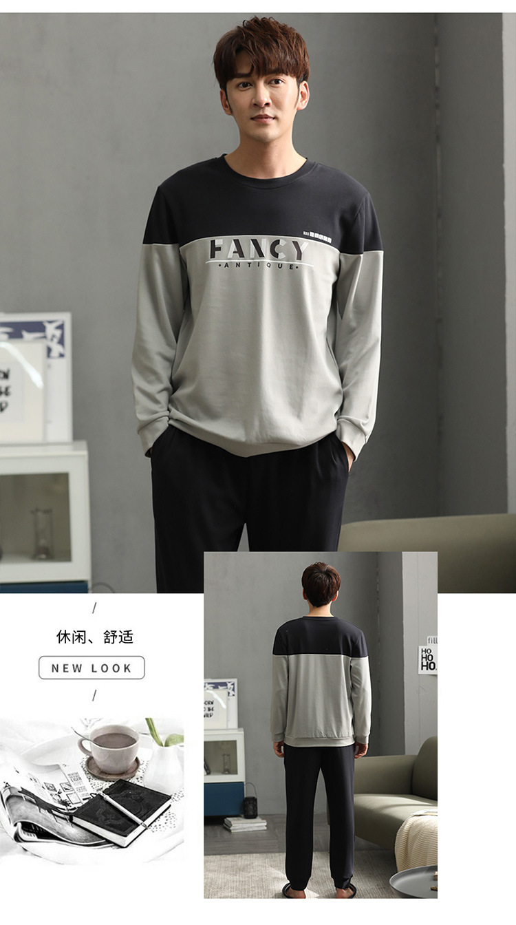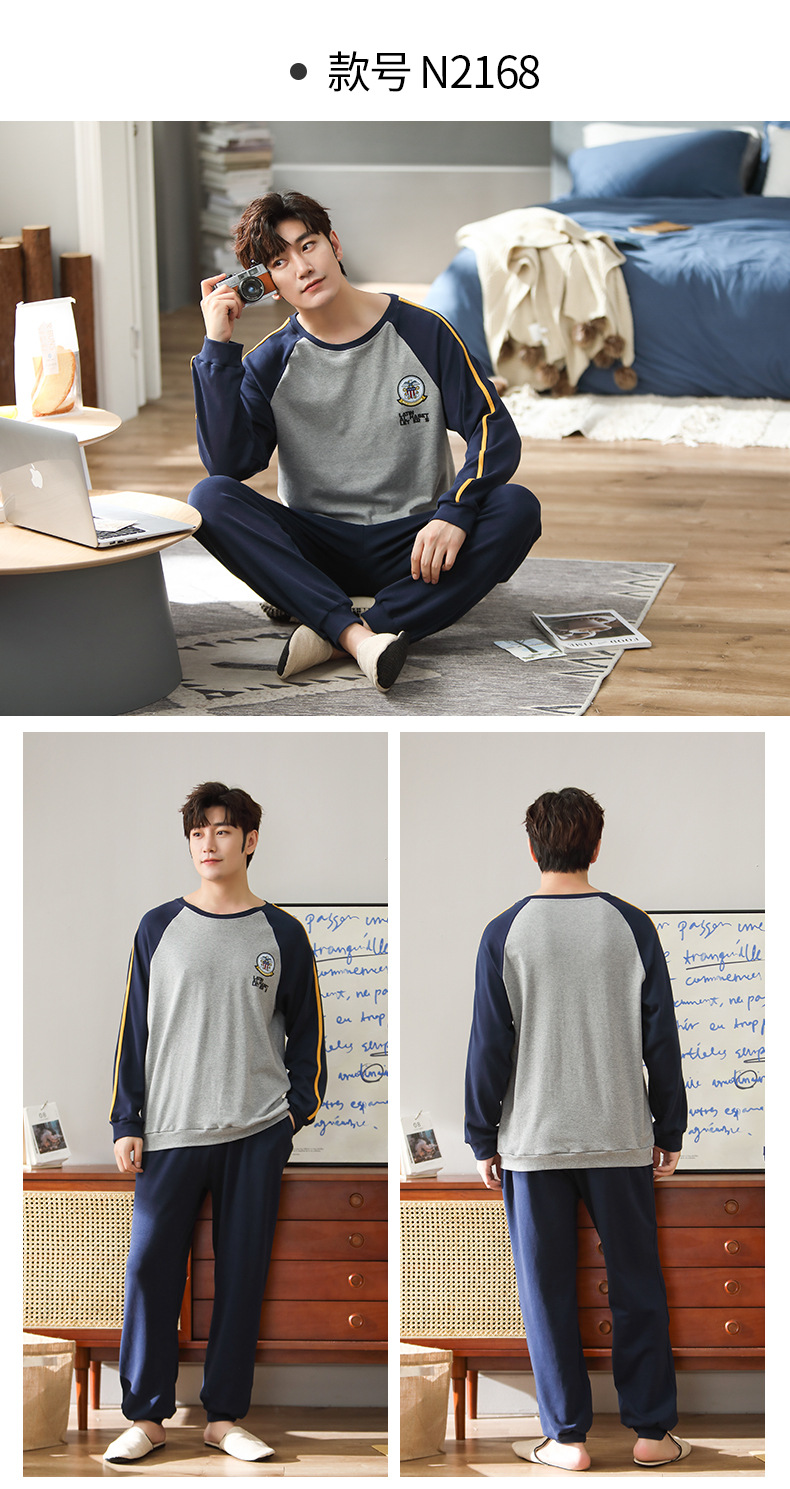 新品纯棉男士睡衣长袖长裤可外穿圆领透气两件套家居服男
