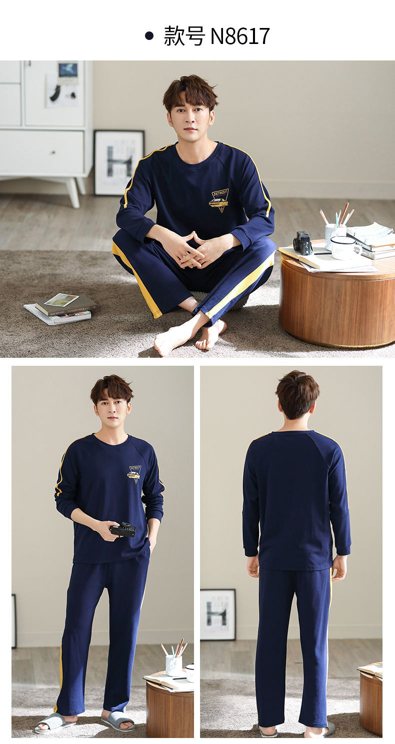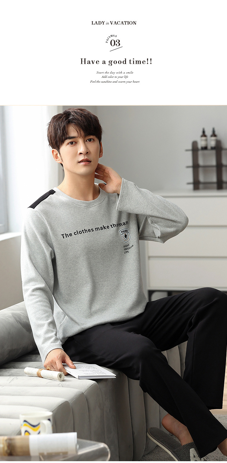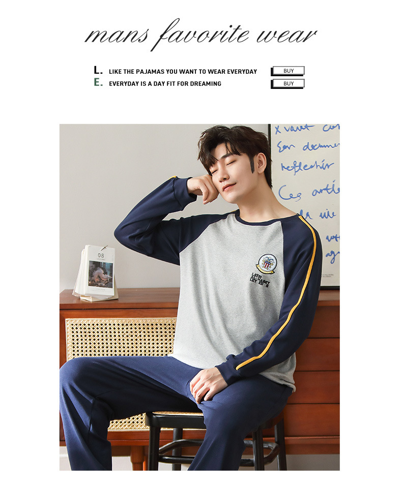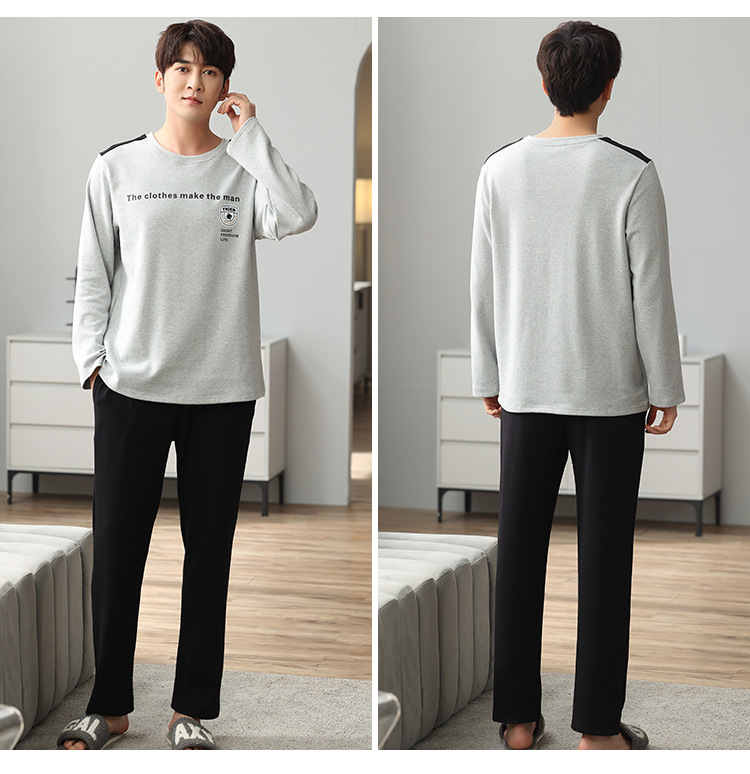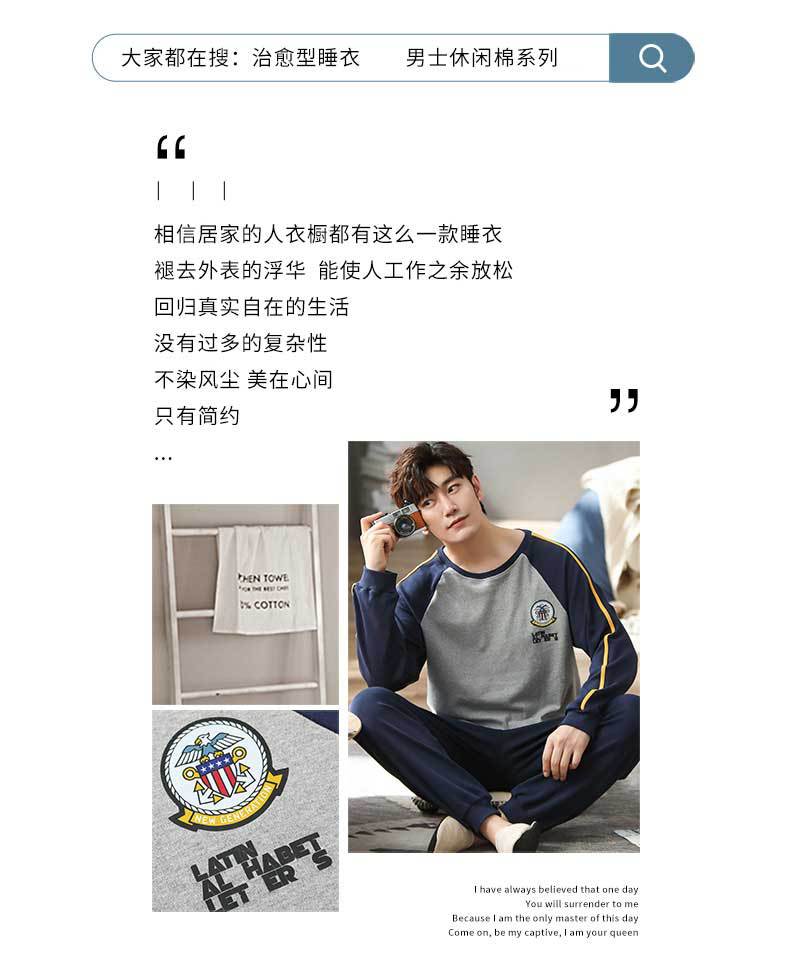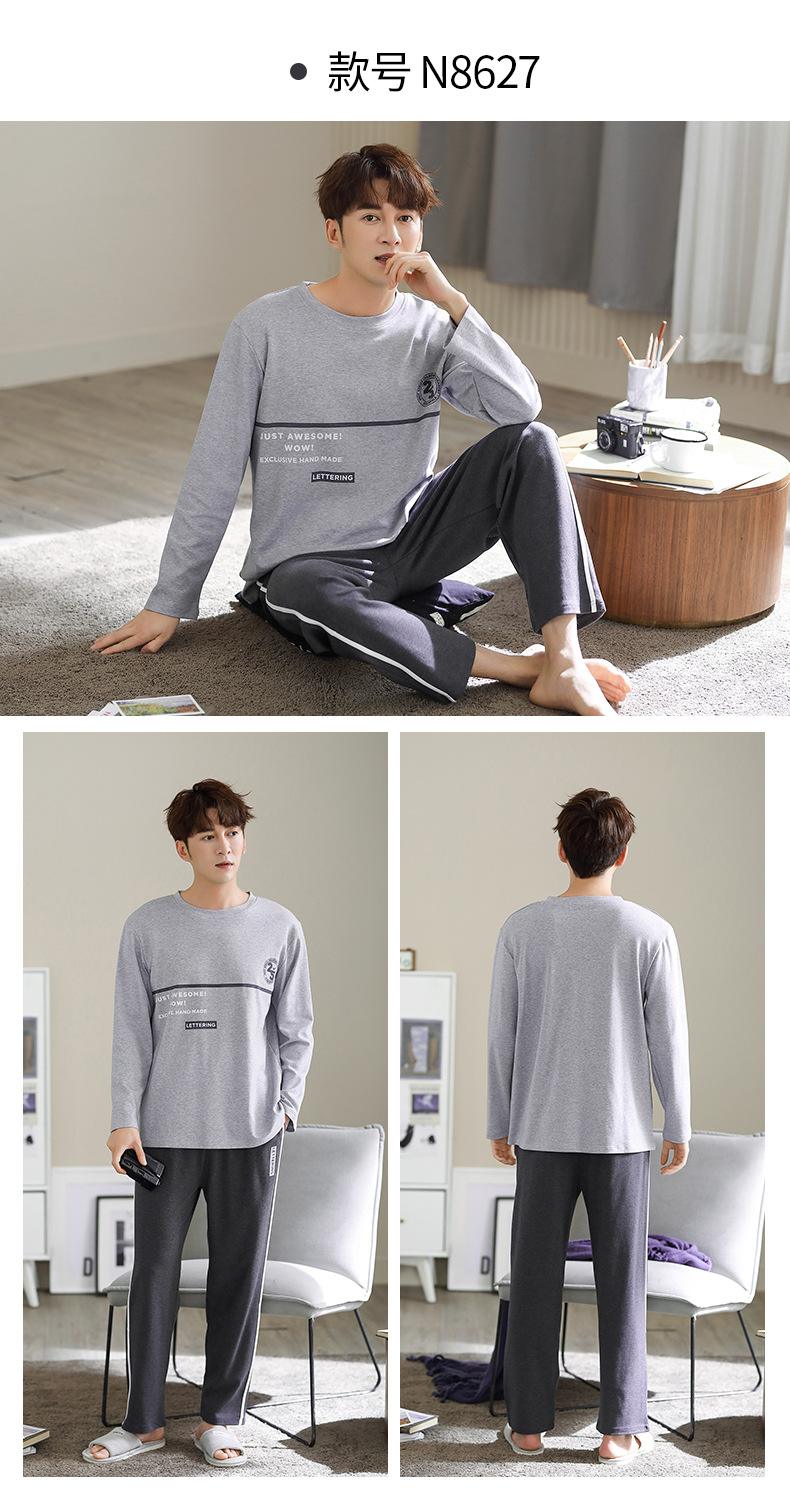 新品纯棉男士睡衣长袖长裤可外穿圆领透气两件套家居服男