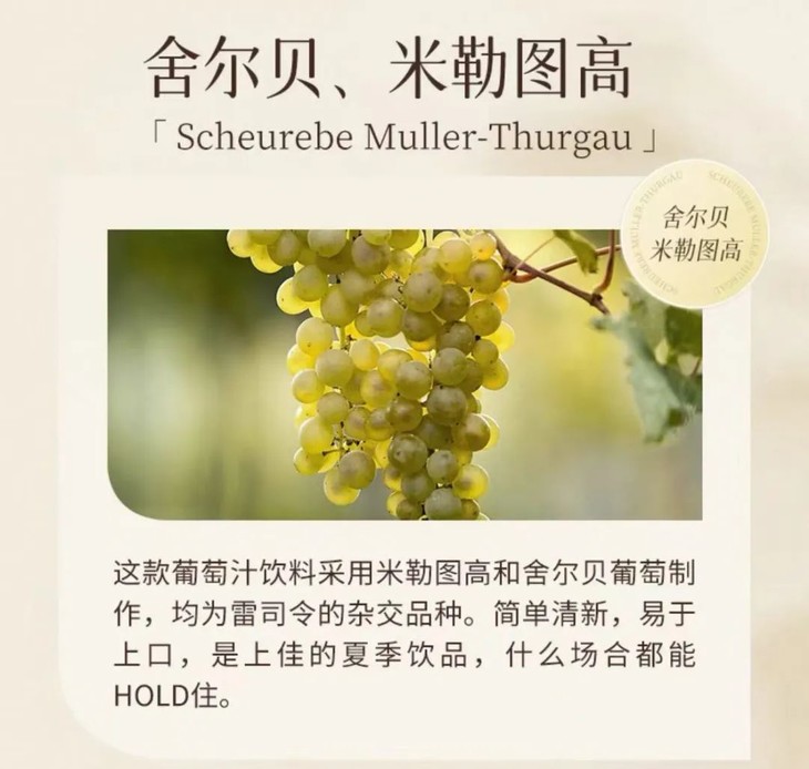 使用德国特色雷司令杂交葡萄品种舍尔贝和米勒图高打造妥妥的无酒精雷司令,而瓶子上的「TRAUBENSECC」 意为 “葡萄原萃” ,对应其 古法冷榨+橡木桶陈酿 工艺,0酒精却保留葡萄多酚,口感如香槟般绵密。