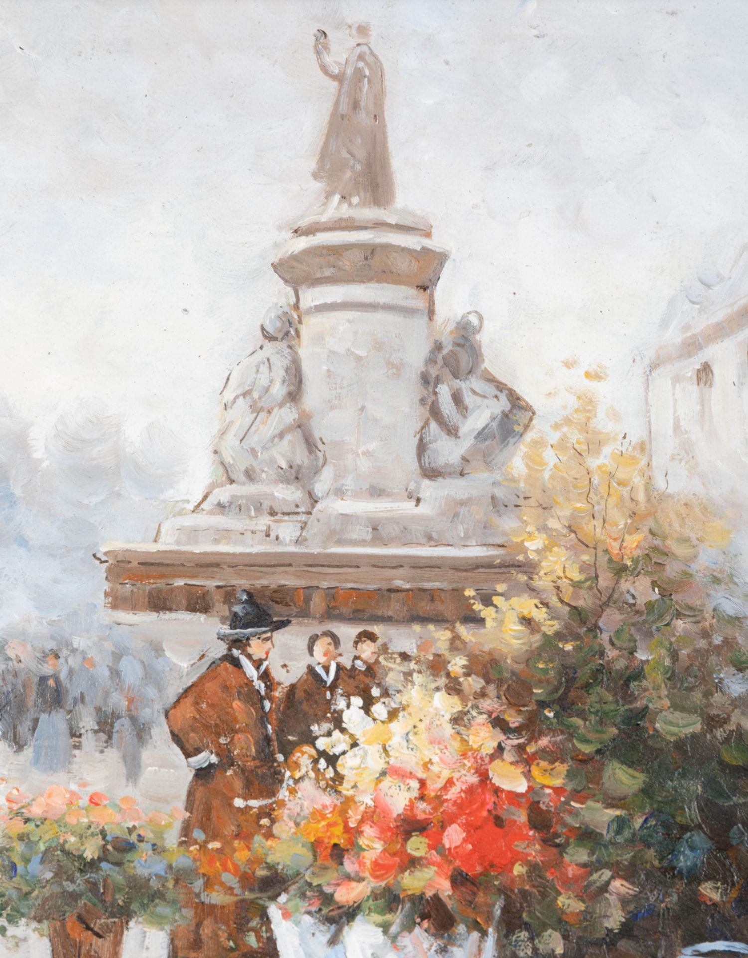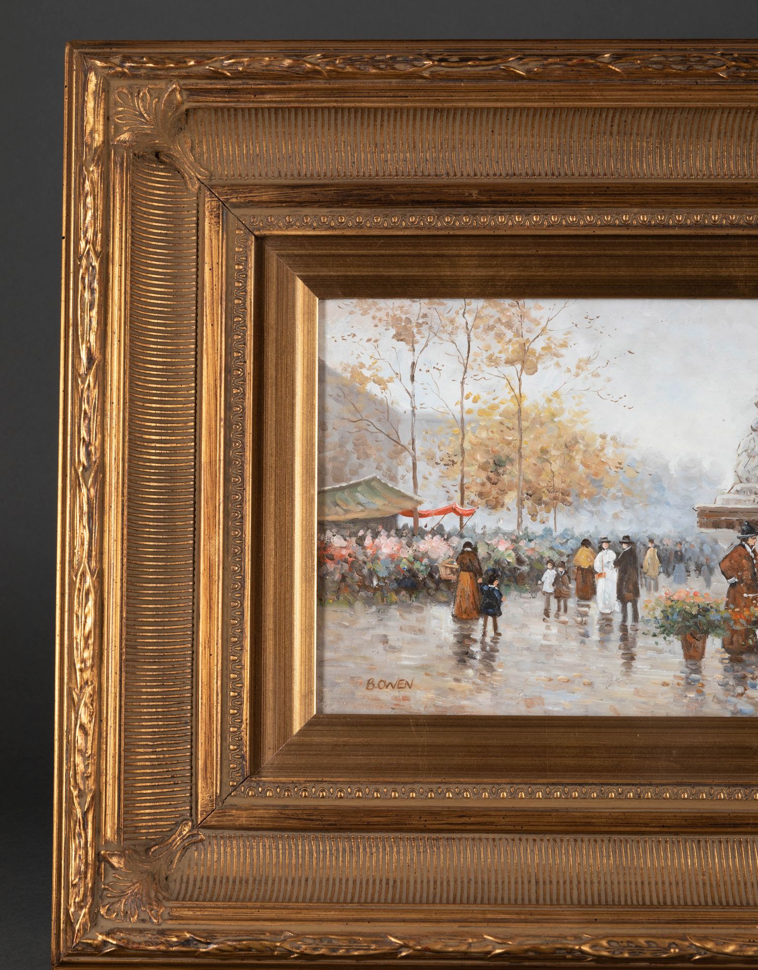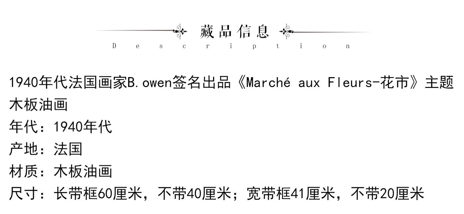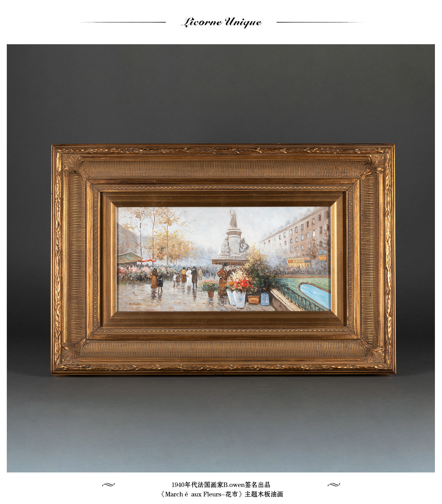 独角鹿西洋古董画家B.owen签名Marché aux Fleurs-花市主题油画