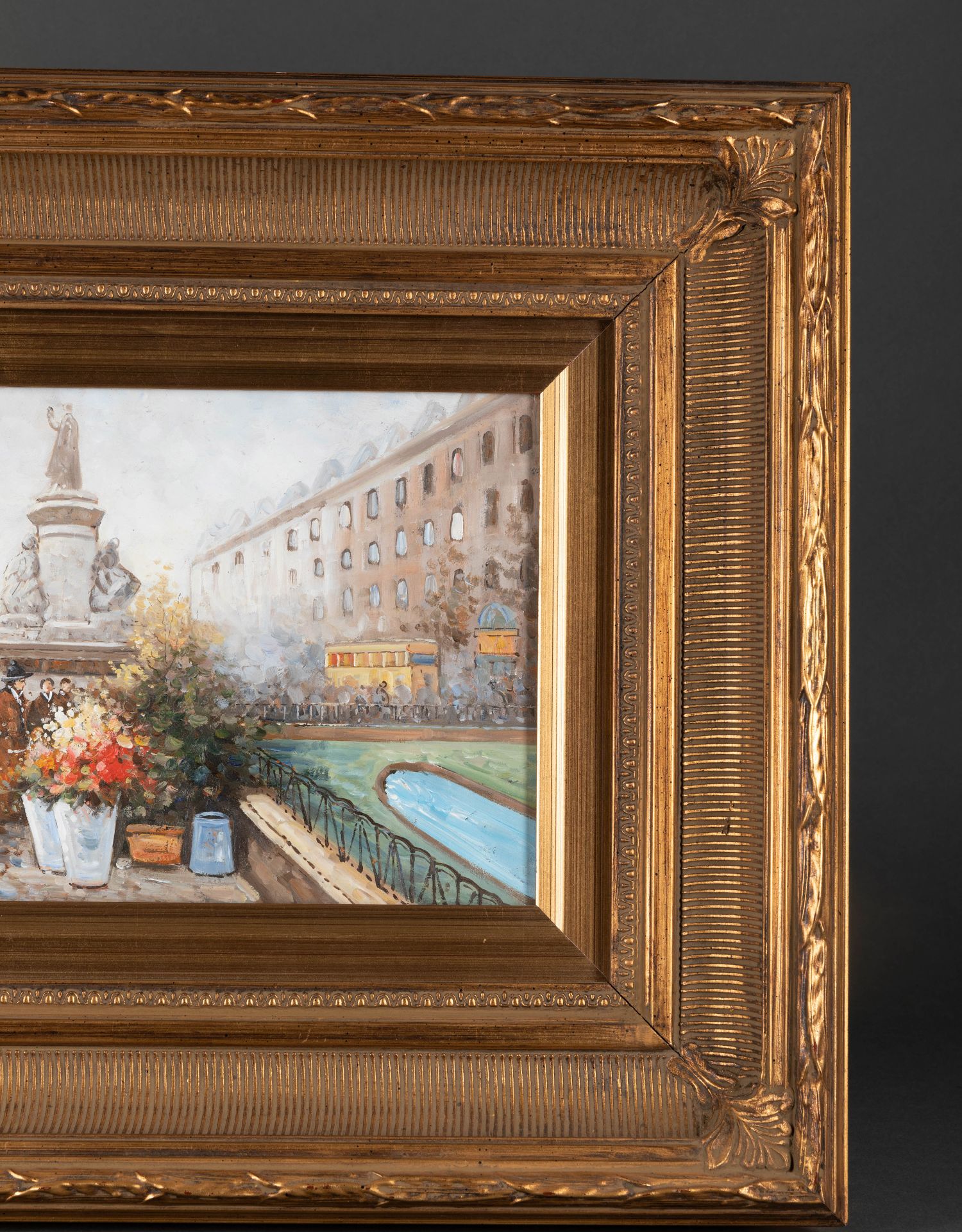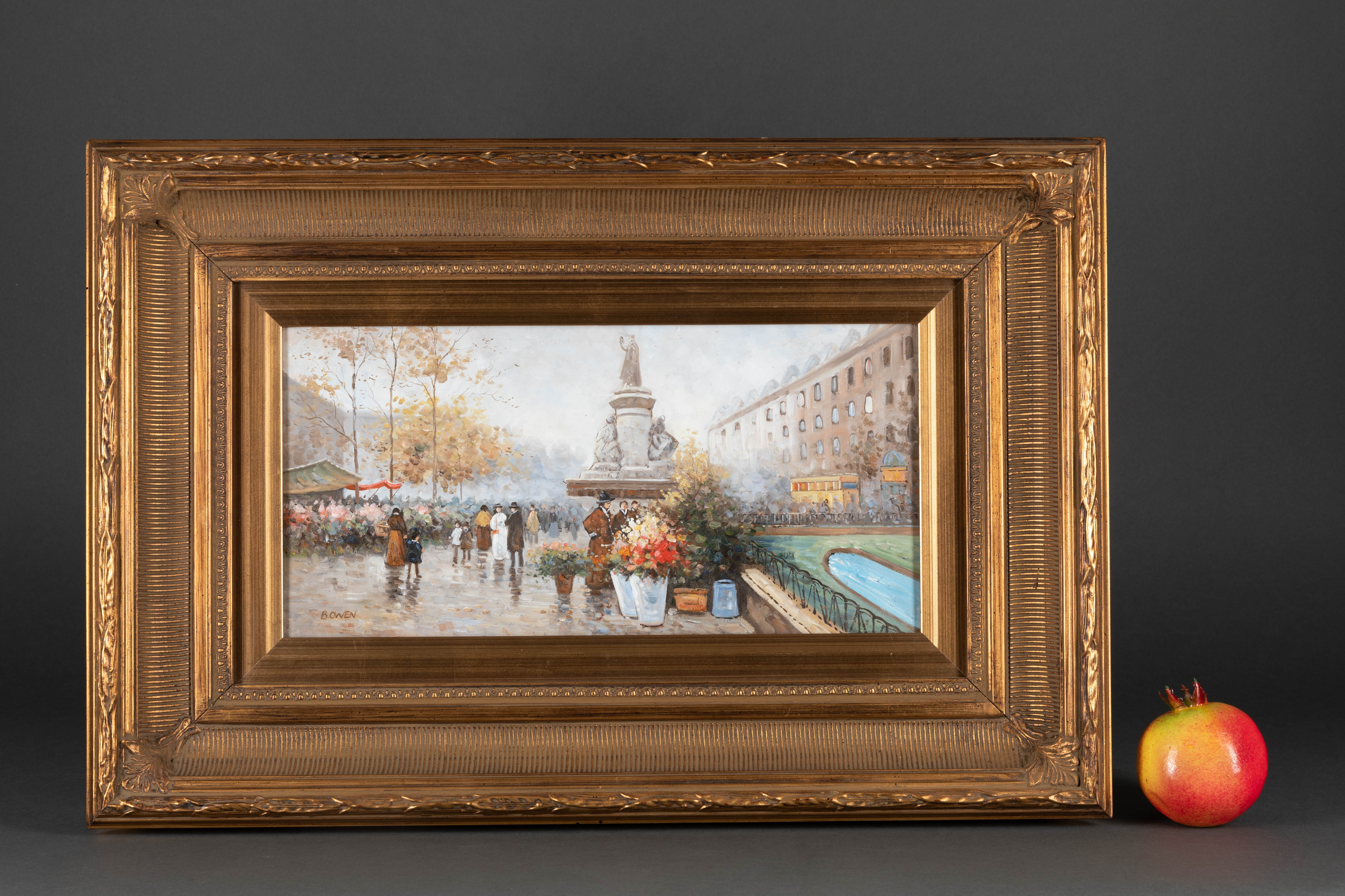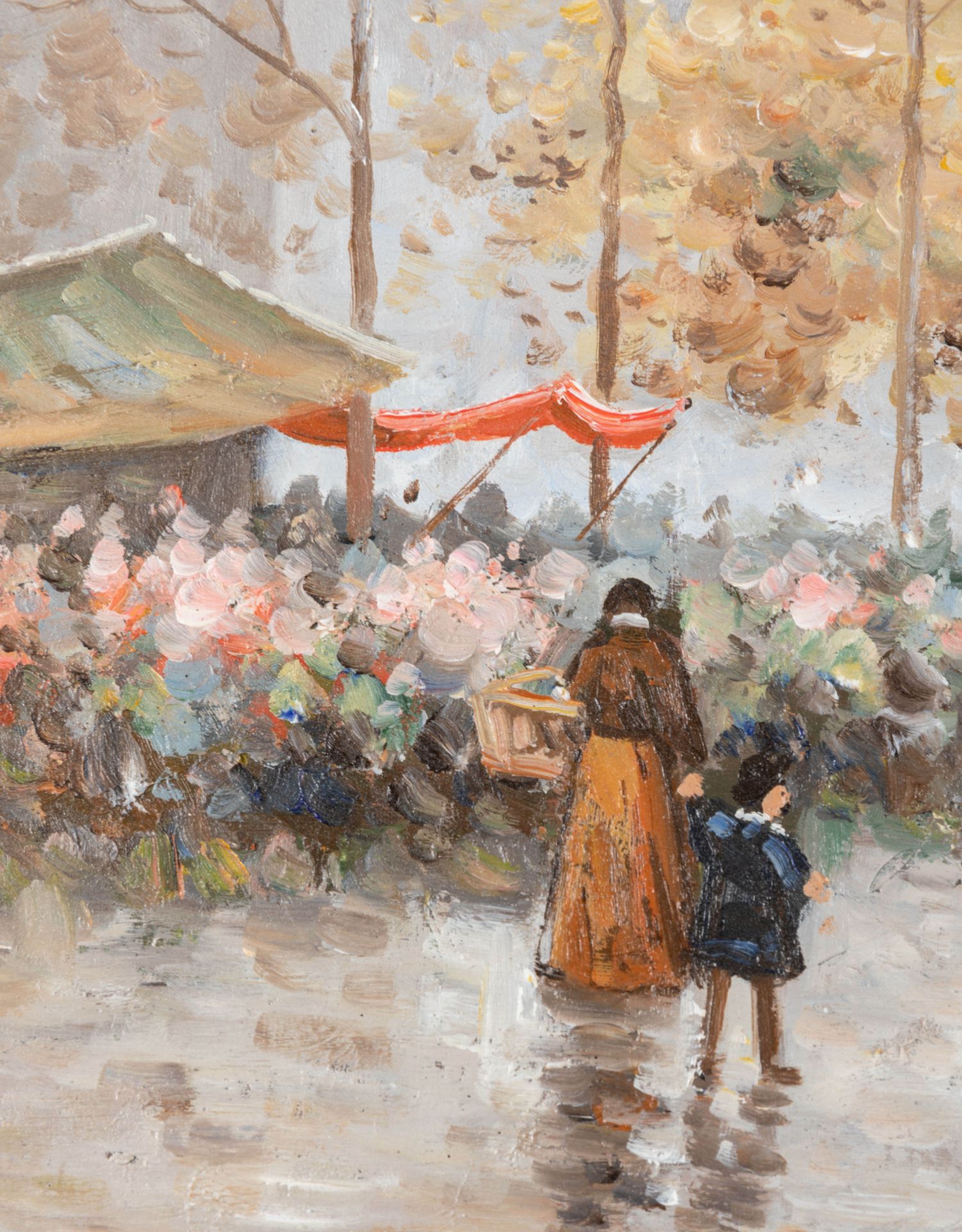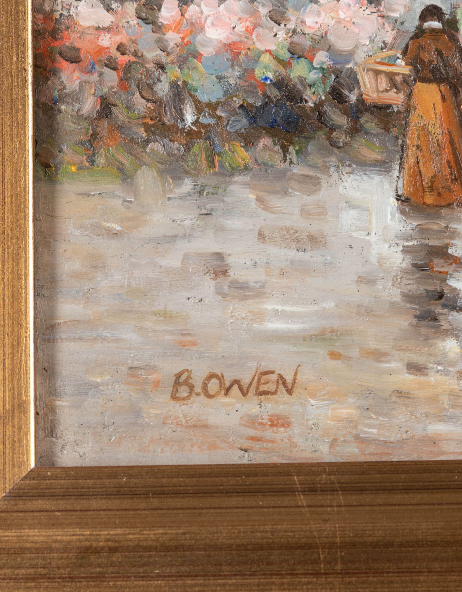 独角鹿西洋古董画家B.owen签名Marché aux Fleurs-花市主题油画