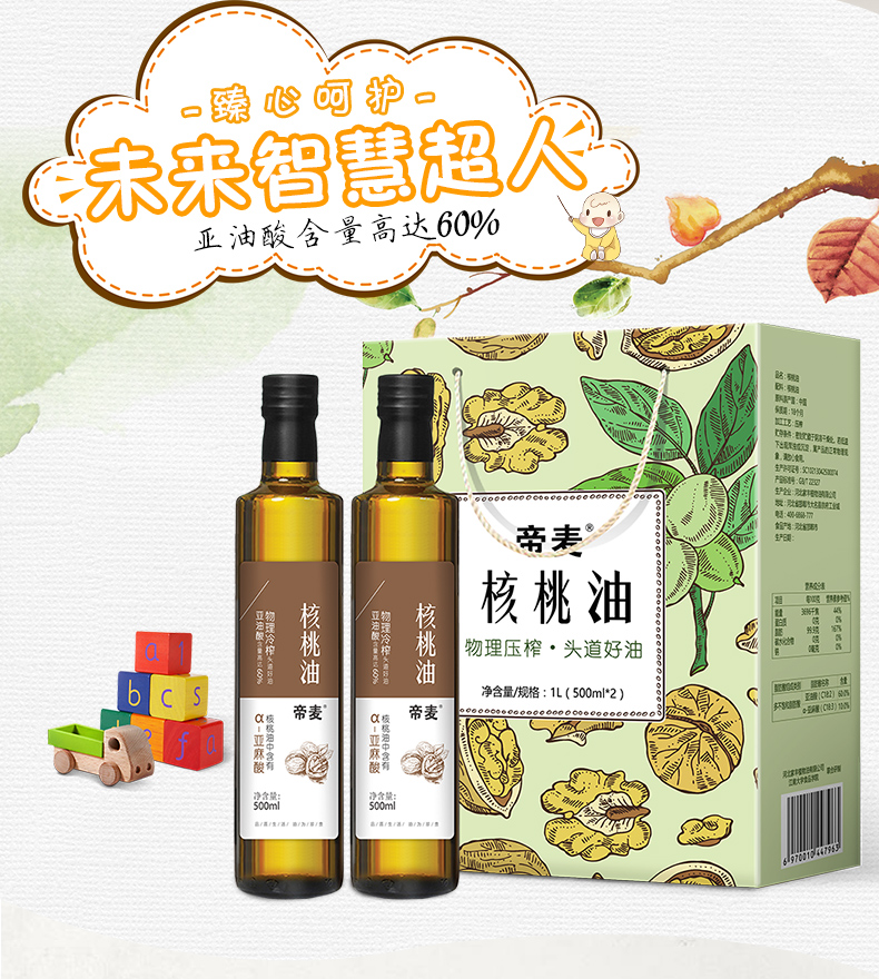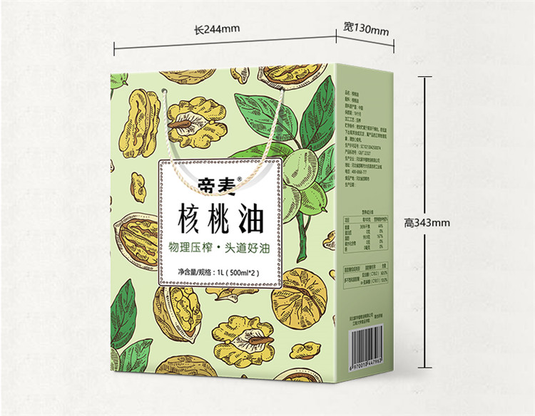 帝麦 物理冷榨核桃油500ml*2礼盒装 适用于婴幼儿宝宝孕妇食用油