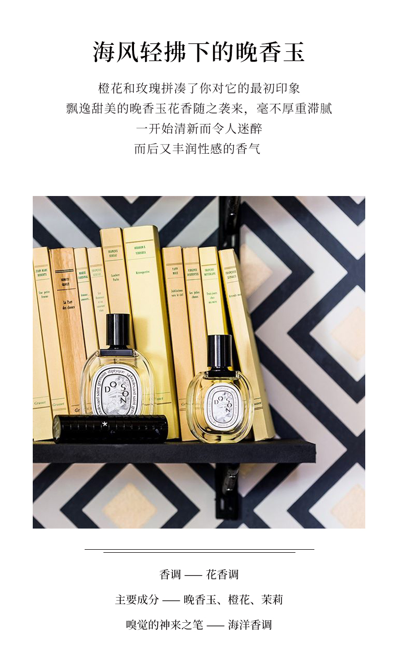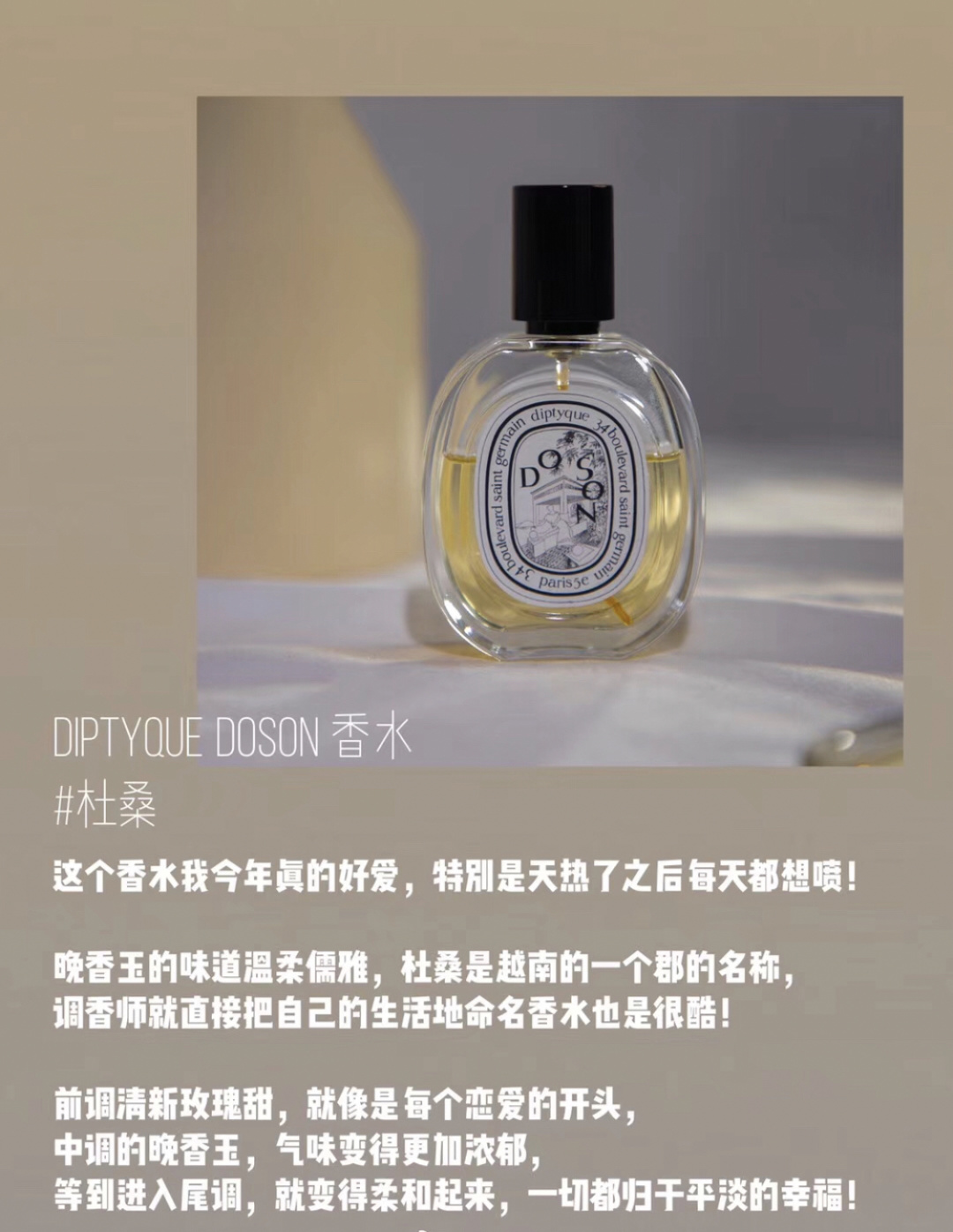 -橙花与晚香玉,大部分的吲哚都被剔除,干净又温婉。我会在出门前半小时穿上薄薄一层doson,无论遇到多糟心的事,当你嗅到自己身上的杜桑,都会不禁告诉自己:要温柔。