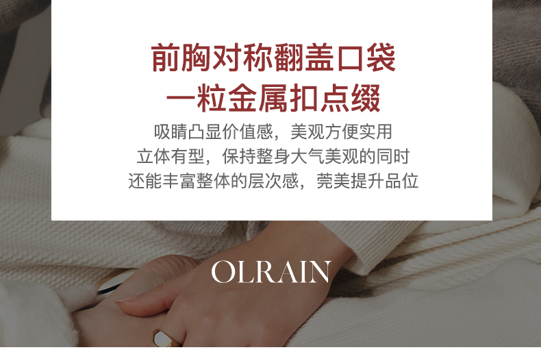 “精致”是欧芮儿olrain品牌文化的核心,欧芮儿认为,精致的女人,不但要外在动人,更要内在迷人,内外兼修,有魅力、有气质、有内涵,自信而不自傲,优雅而不矫揉,自有万种风情而不轻浮,更不故作矜持。