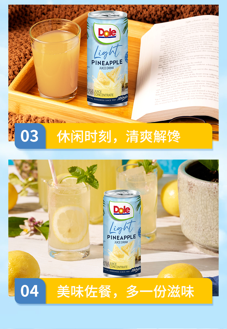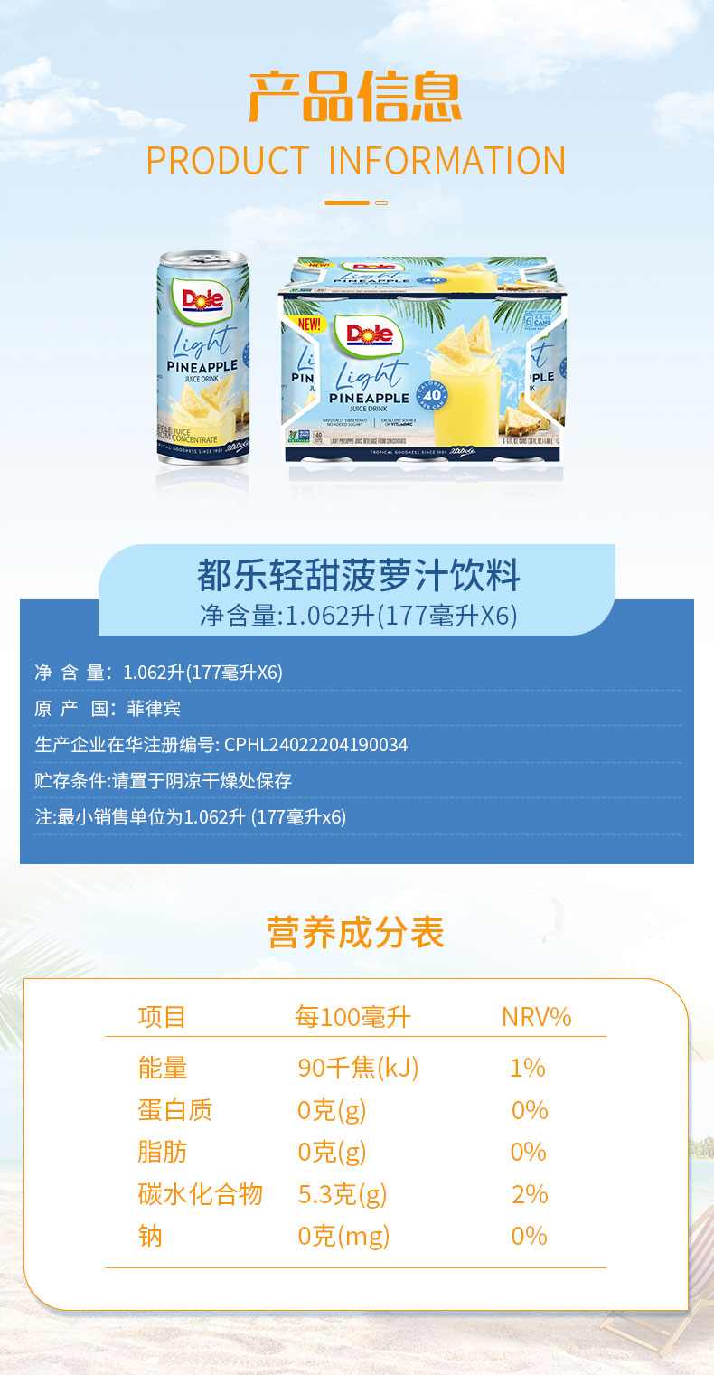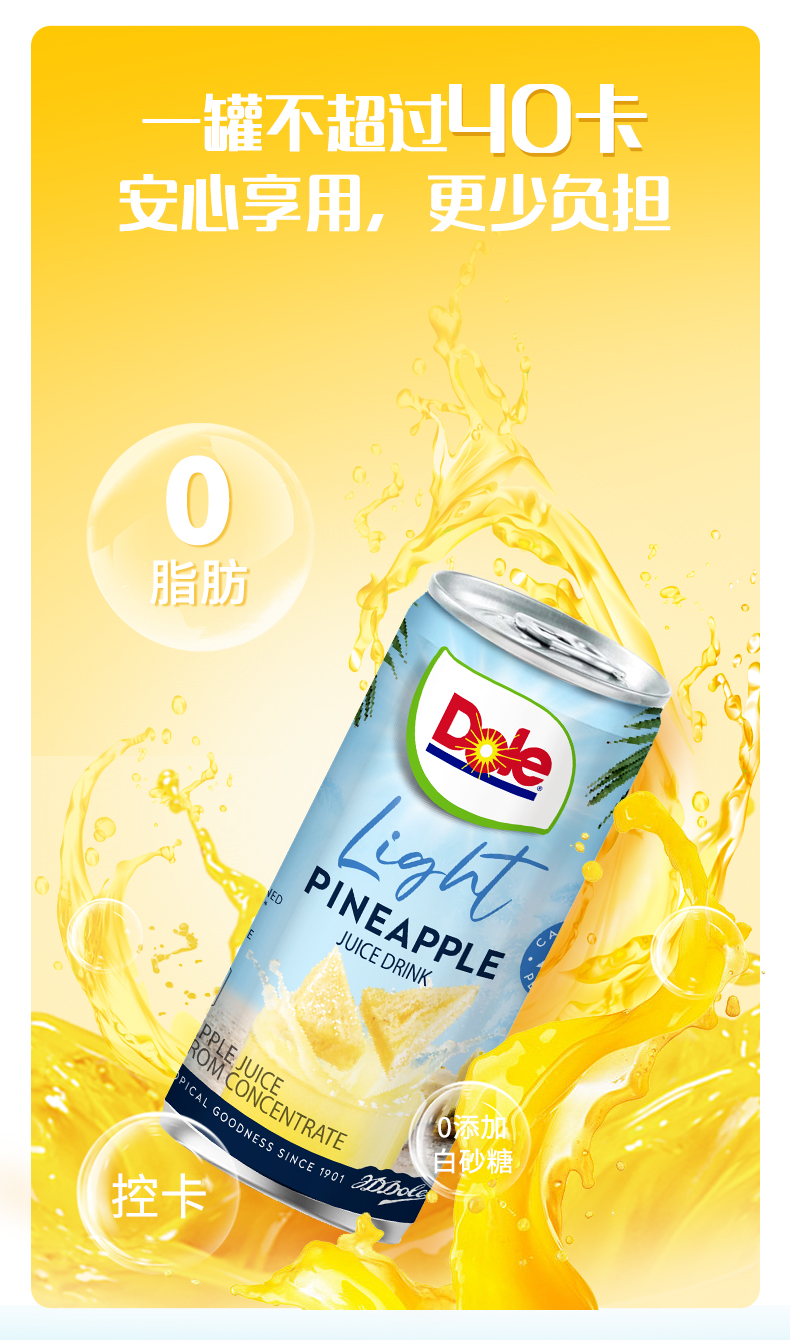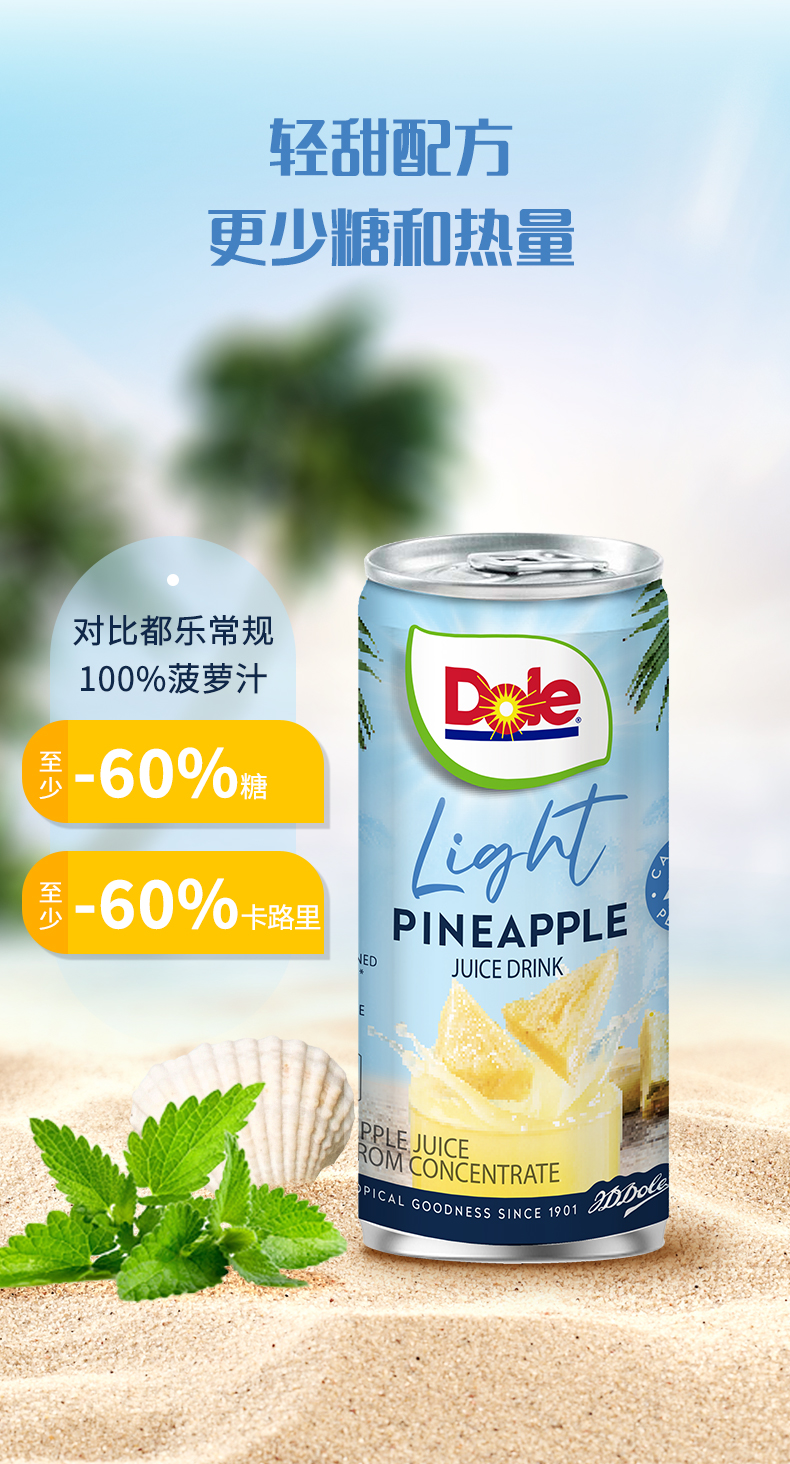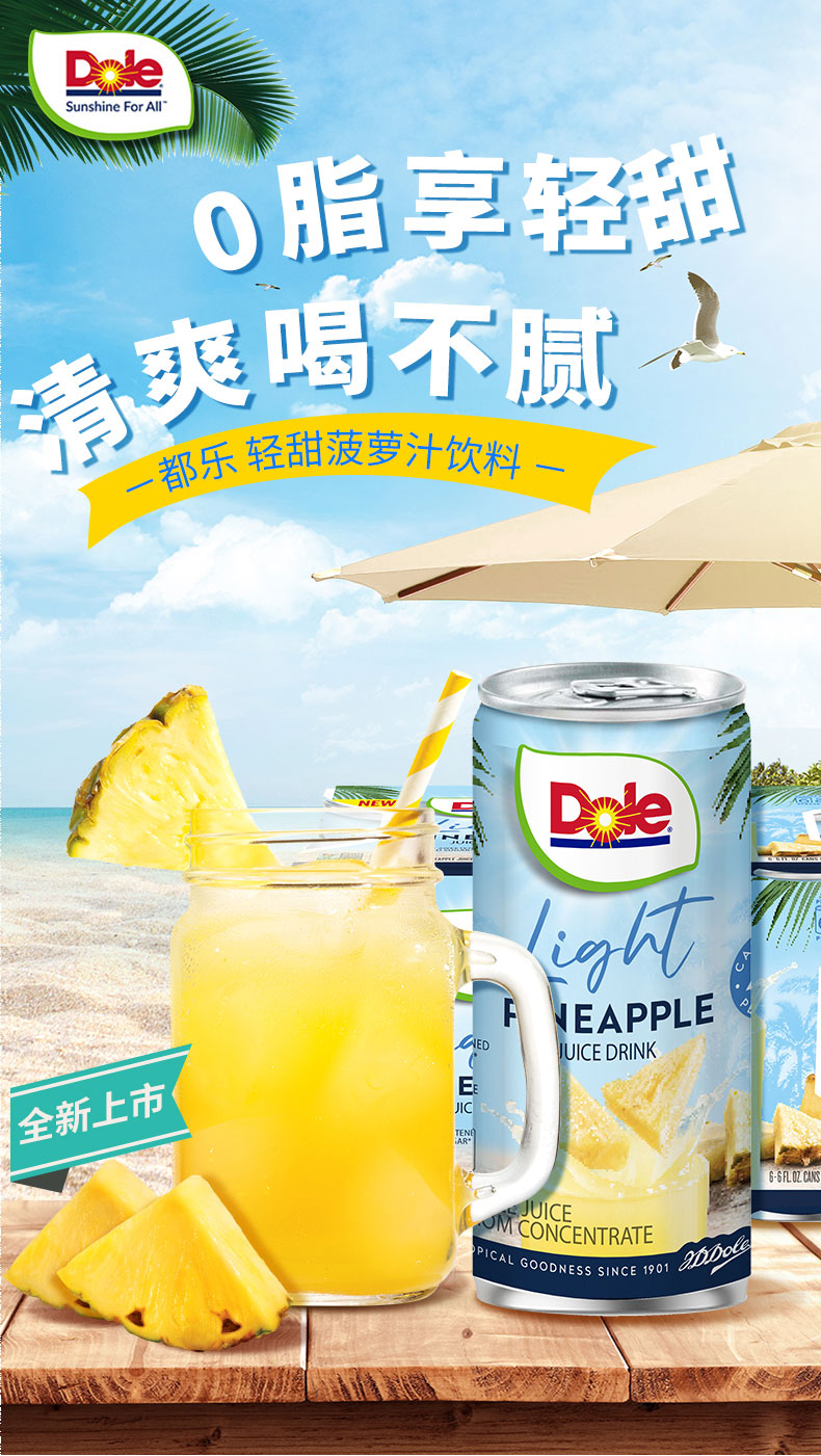 DOLE都乐 菲律宾进口 轻甜 菠萝汁 果汁 饮料 无添加 白砂糖 177ml*6罐 包邮