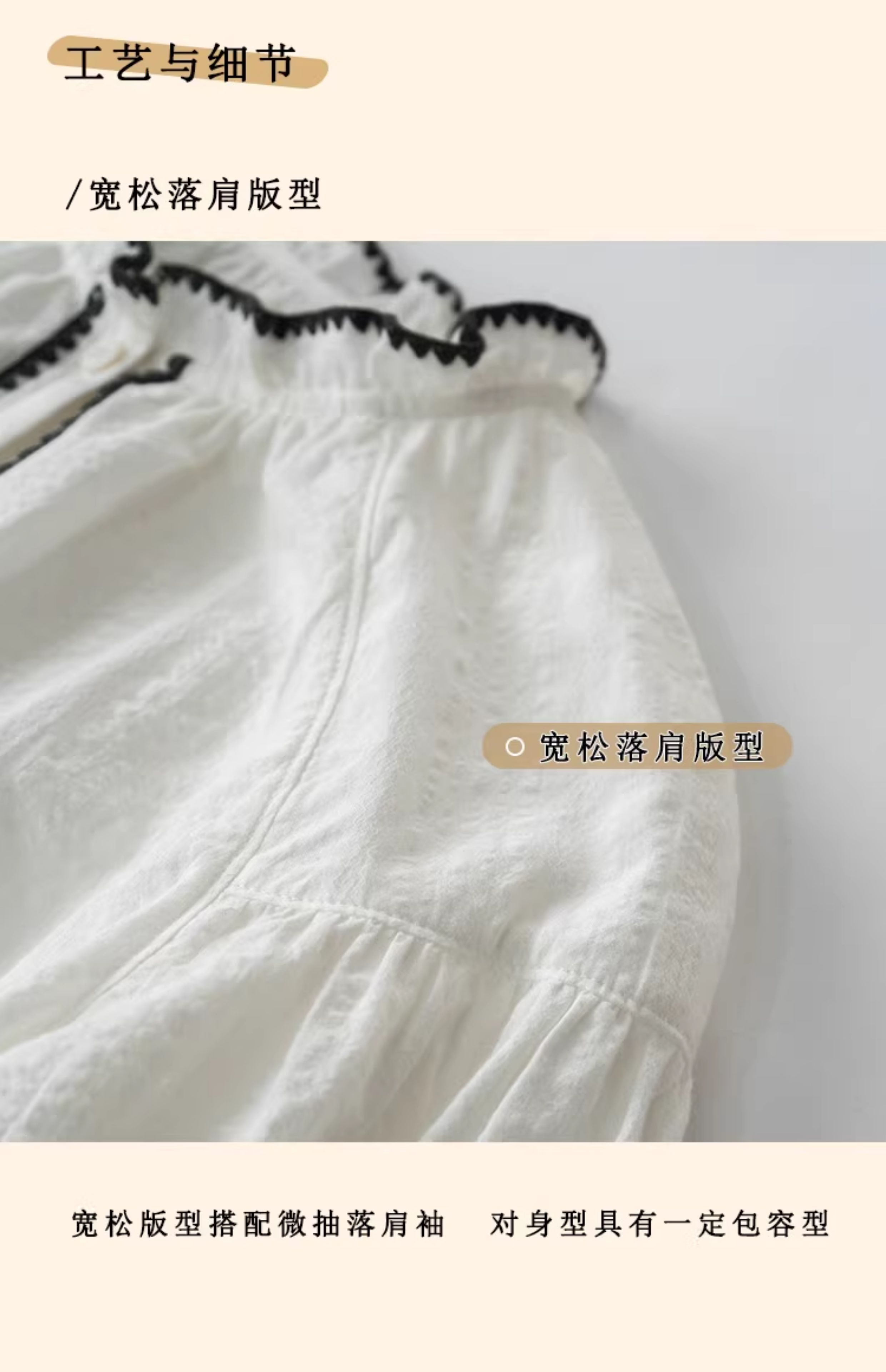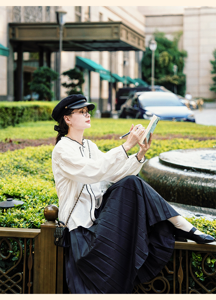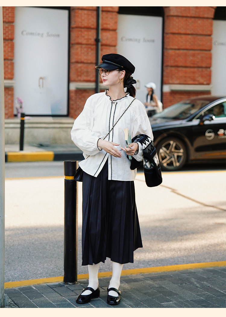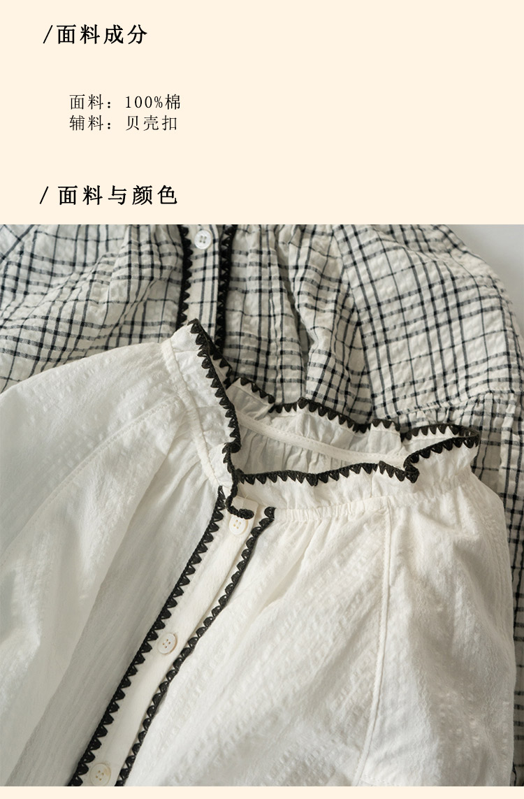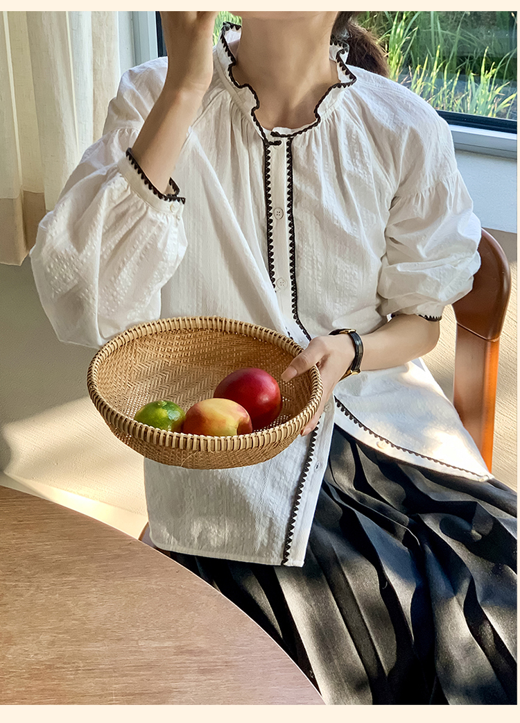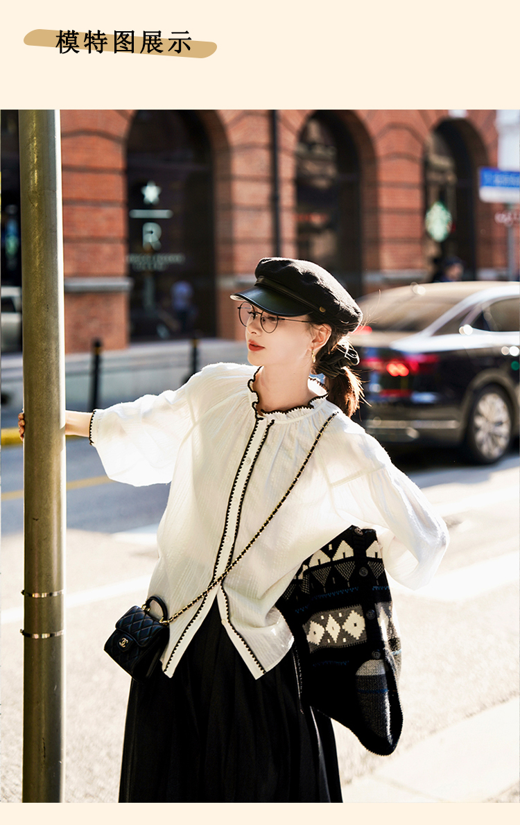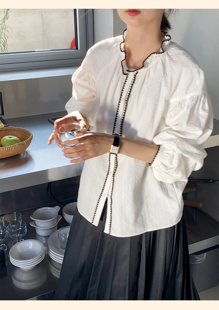 浮生八记/24B079/复古撞色贝壳绣抽褶木耳领插肩灯笼袖衬衣