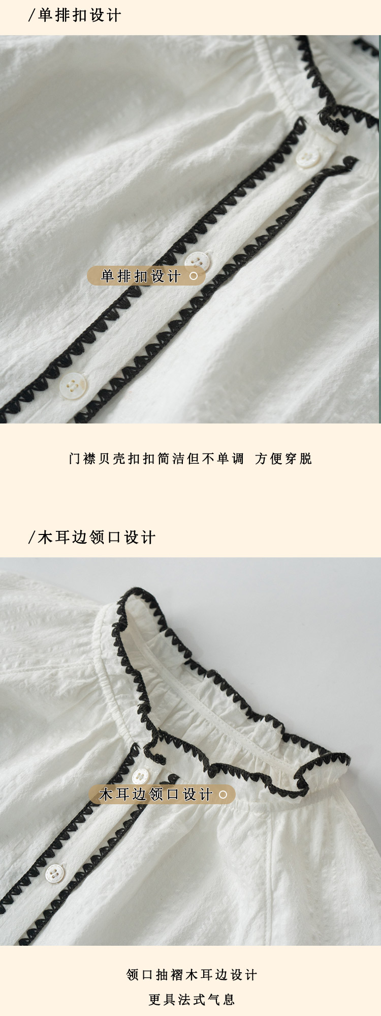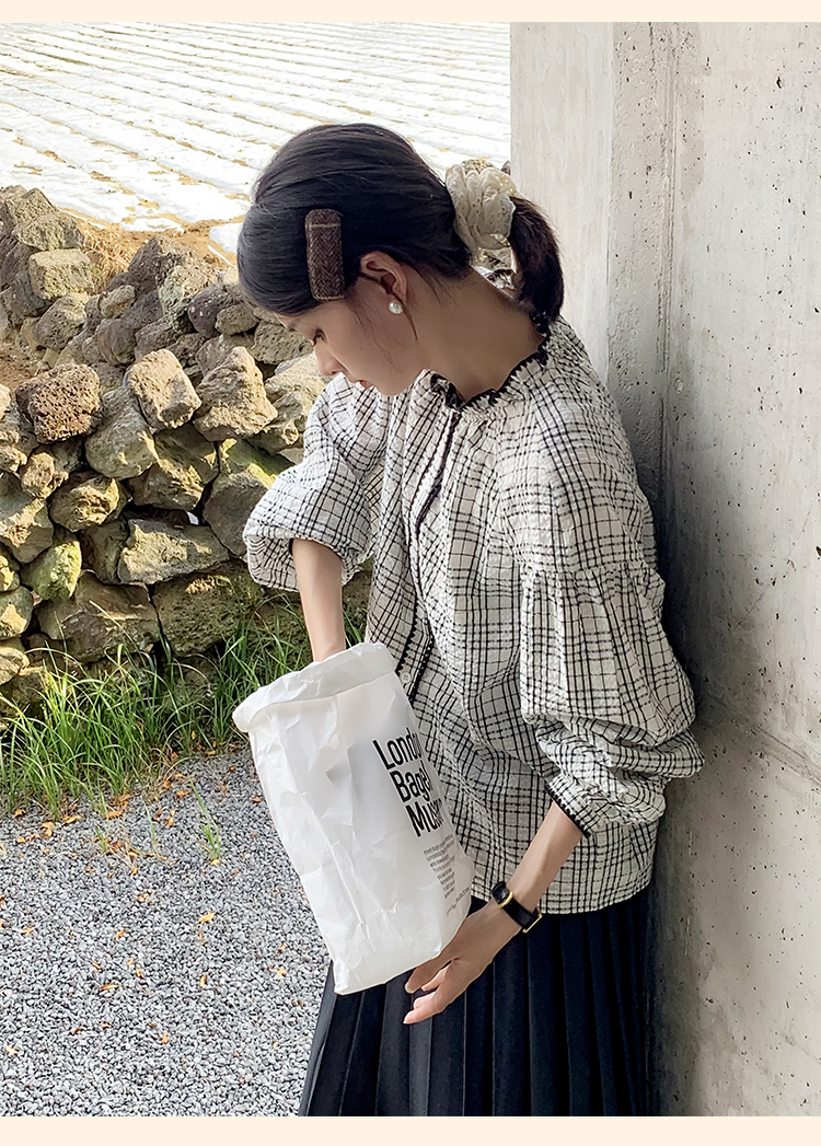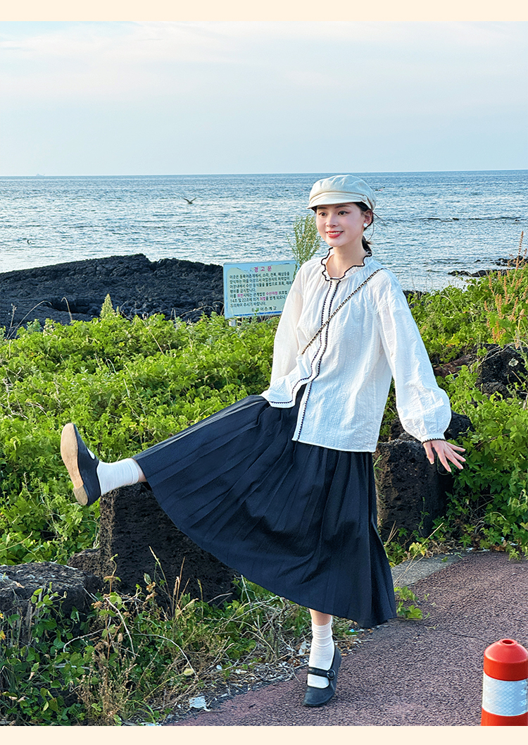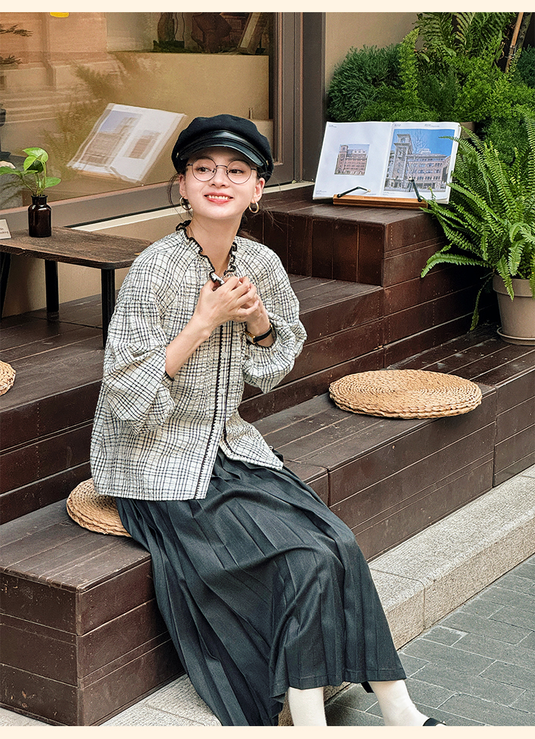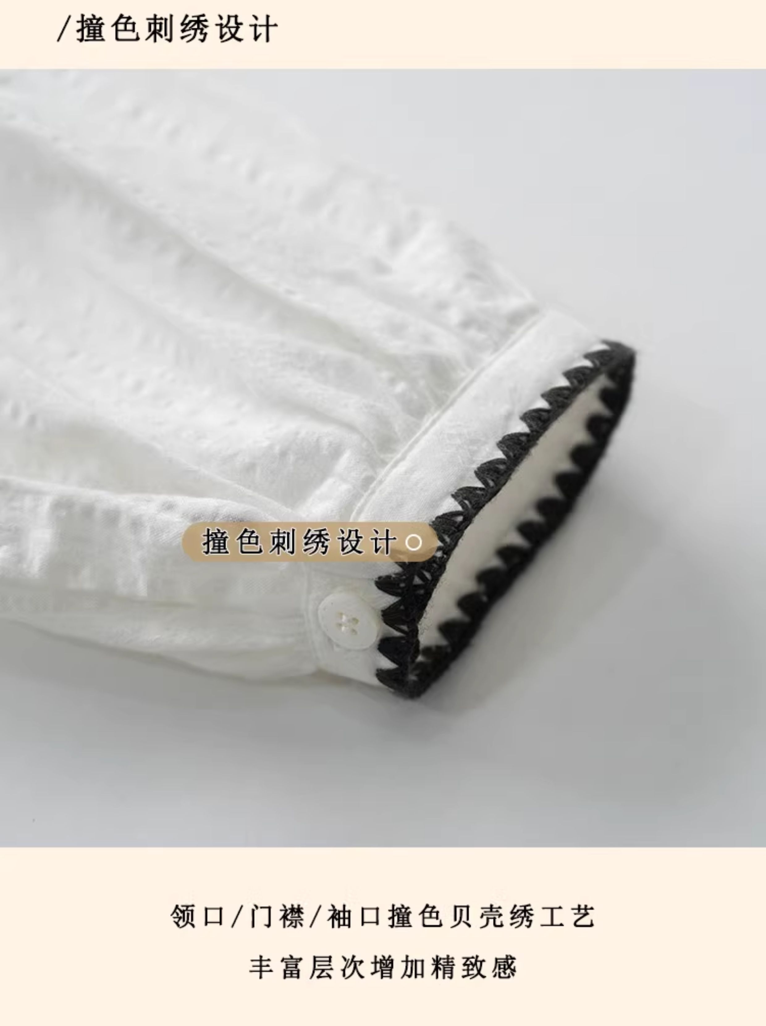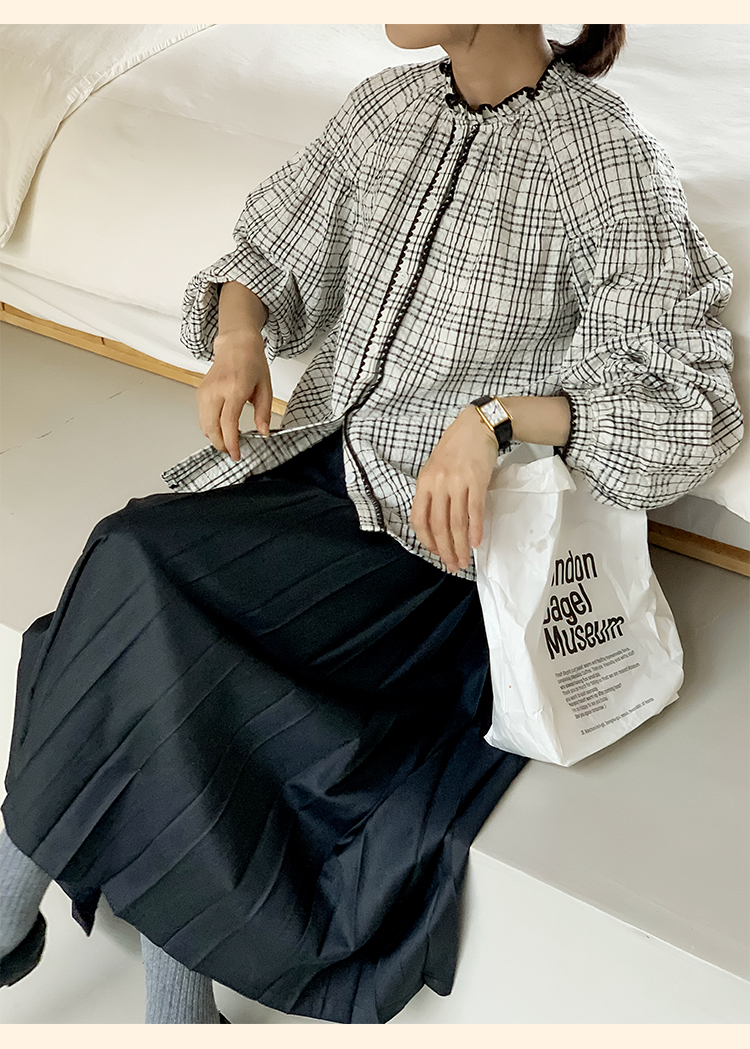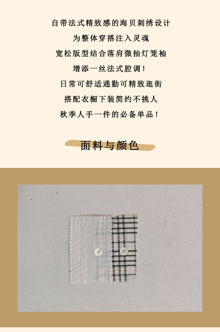 浮生八记/24B079/复古撞色贝壳绣抽褶木耳领插肩灯笼袖衬衣