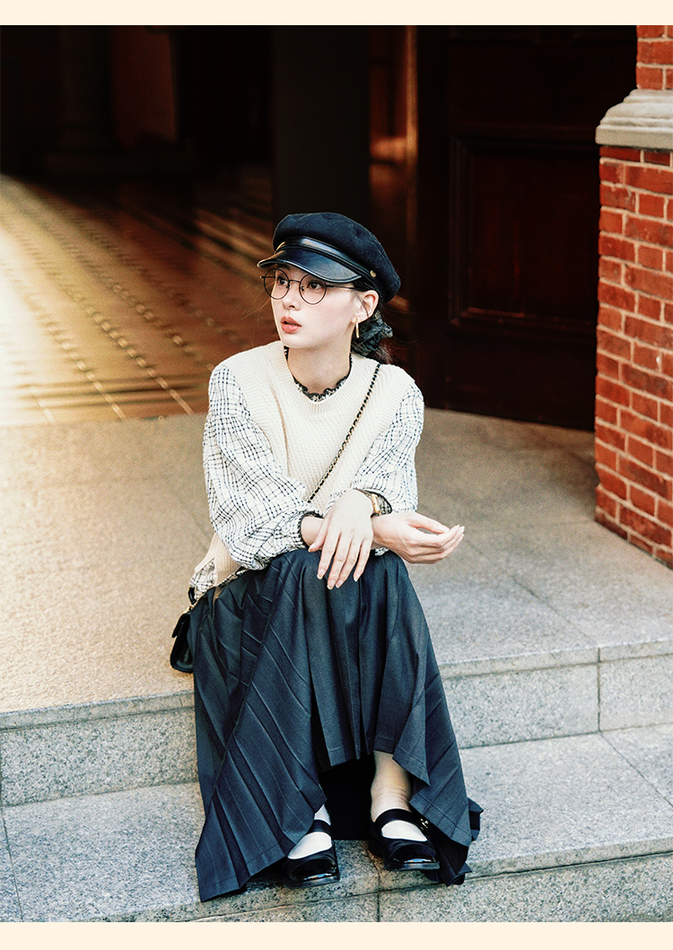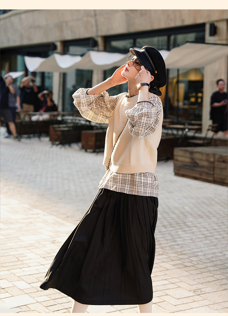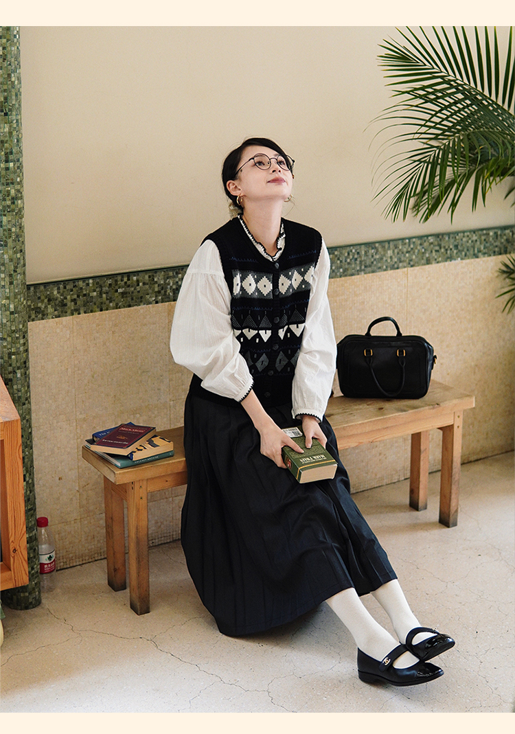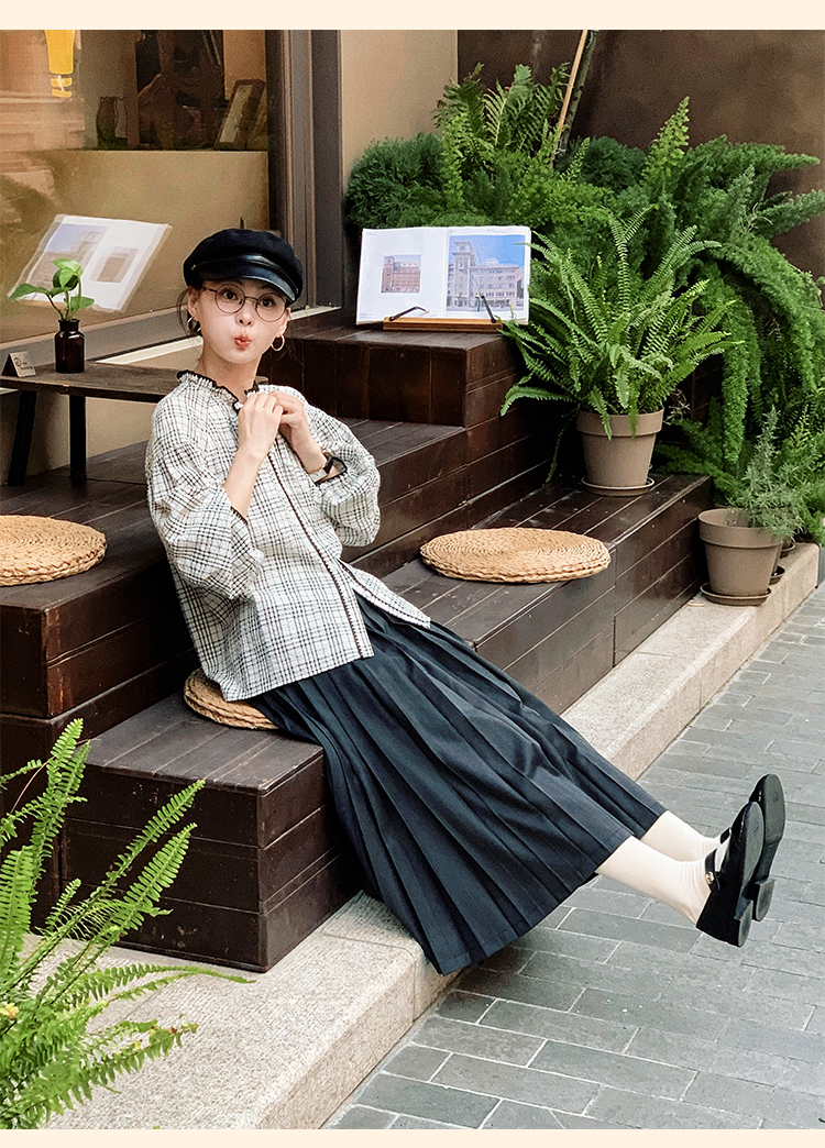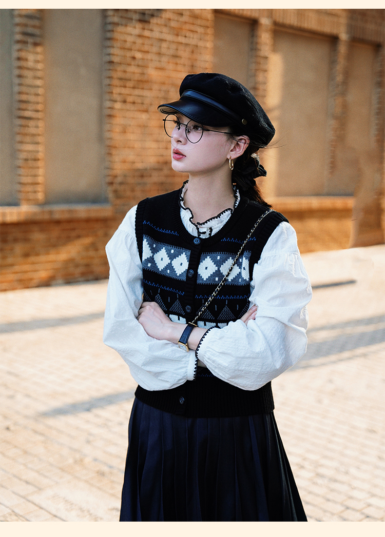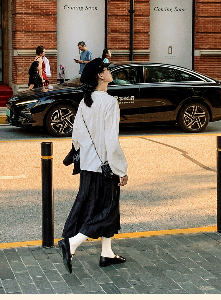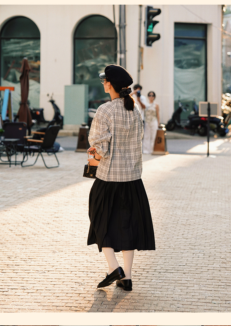 浮生八记/24B079/复古撞色贝壳绣抽褶木耳领插肩灯笼袖衬衣