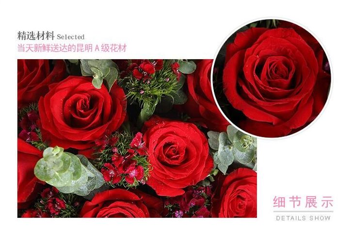 红玫瑰12枝,石竹梅7枝,尤加利适量
