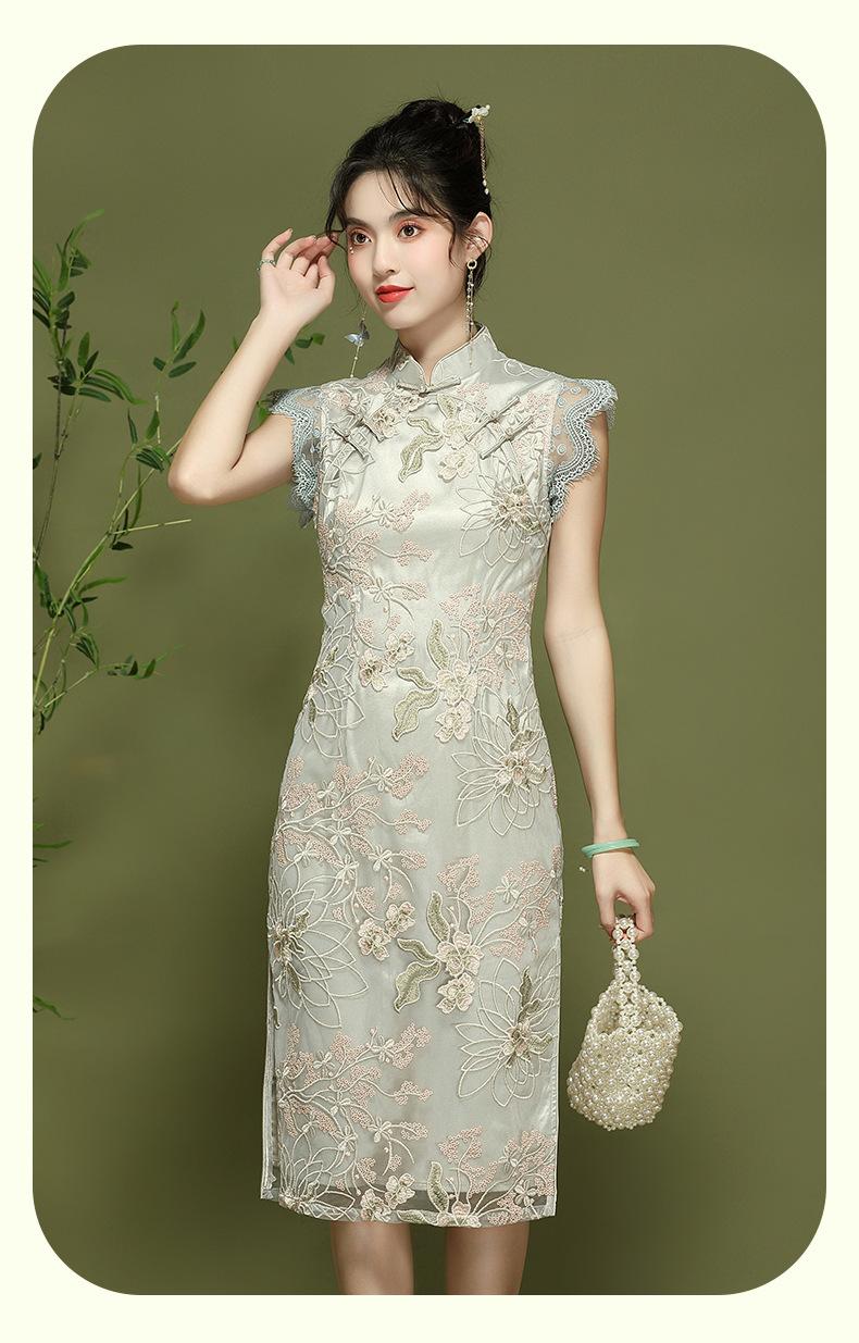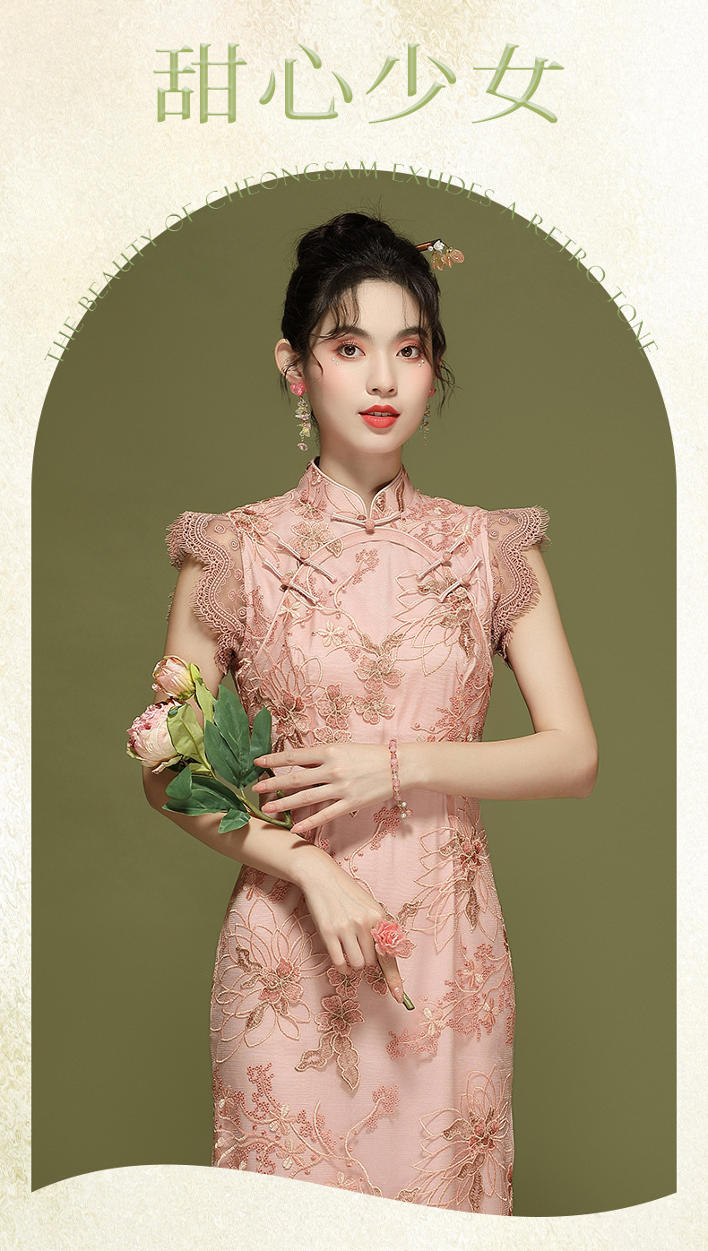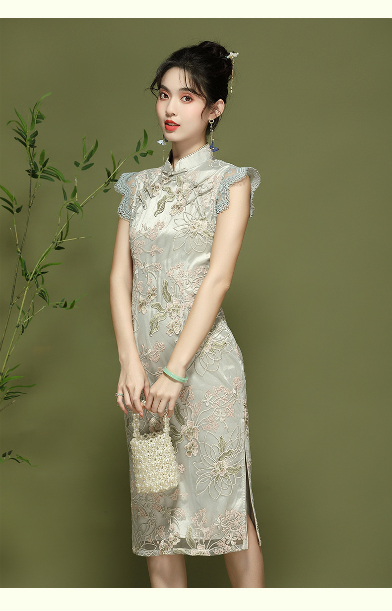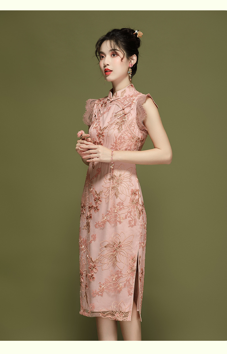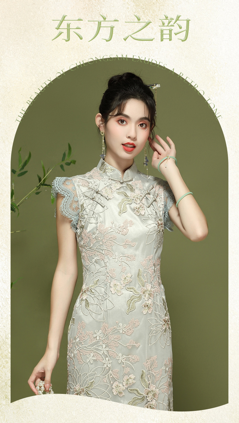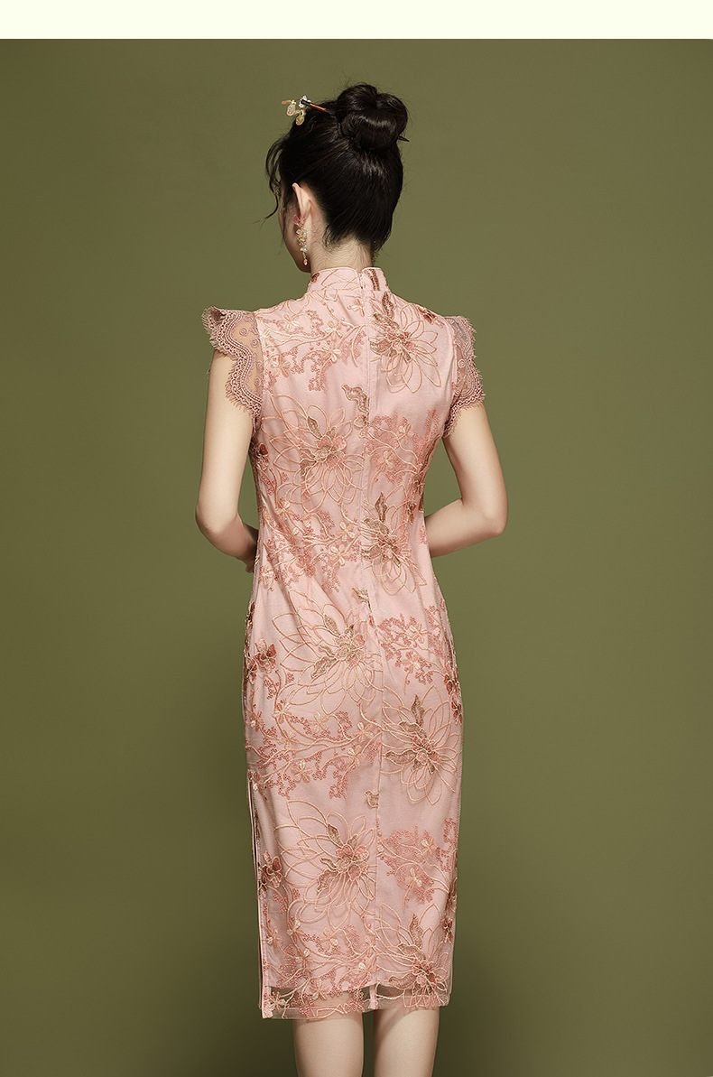 时尚新中式,蕾丝刺绣改良花边袖旗袍OY-24152