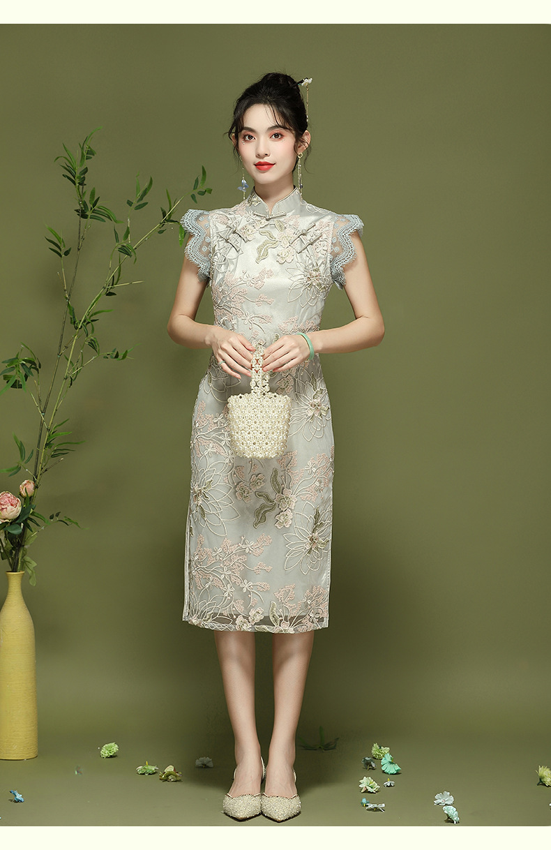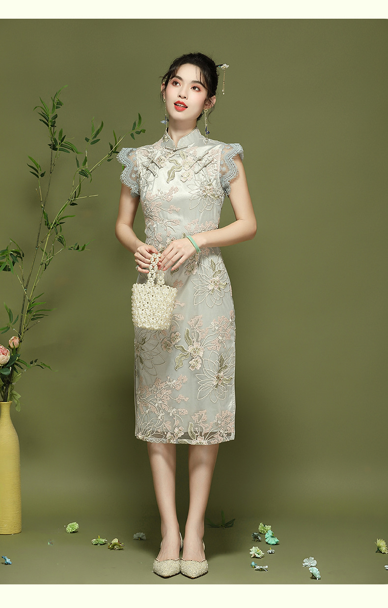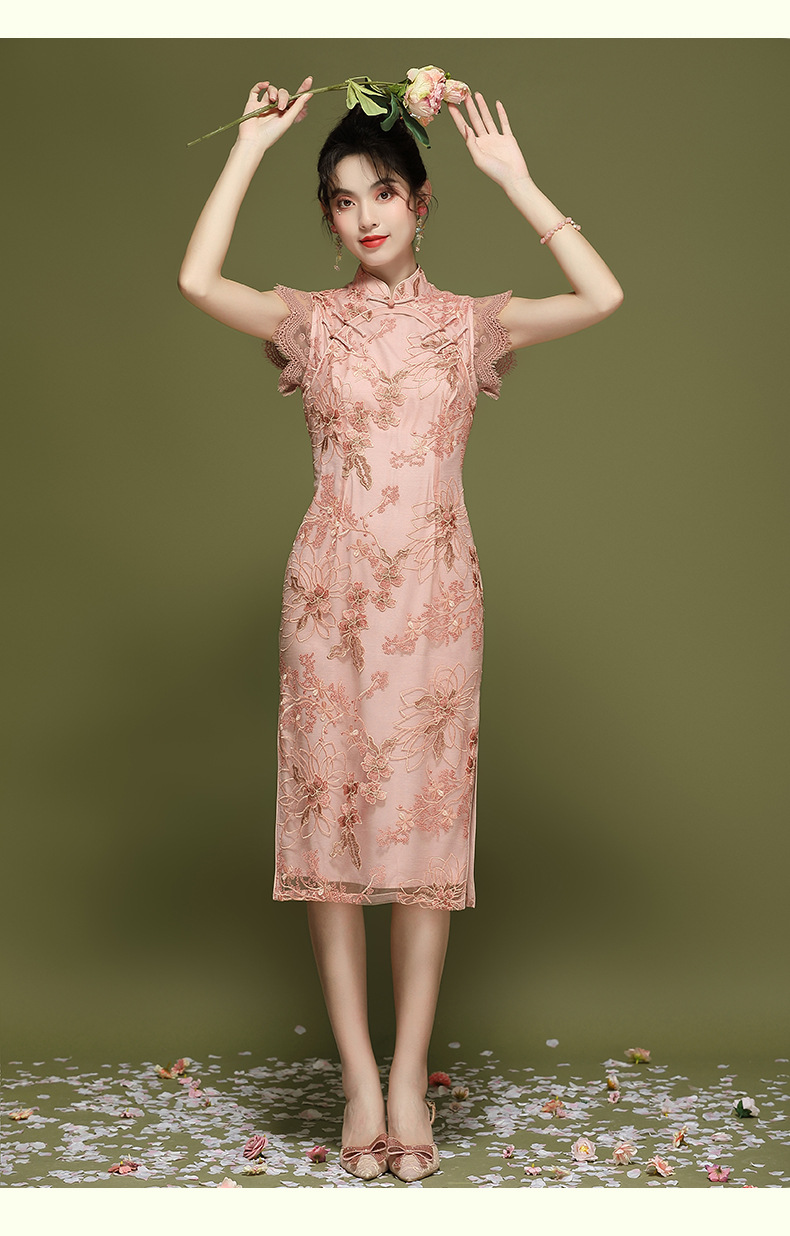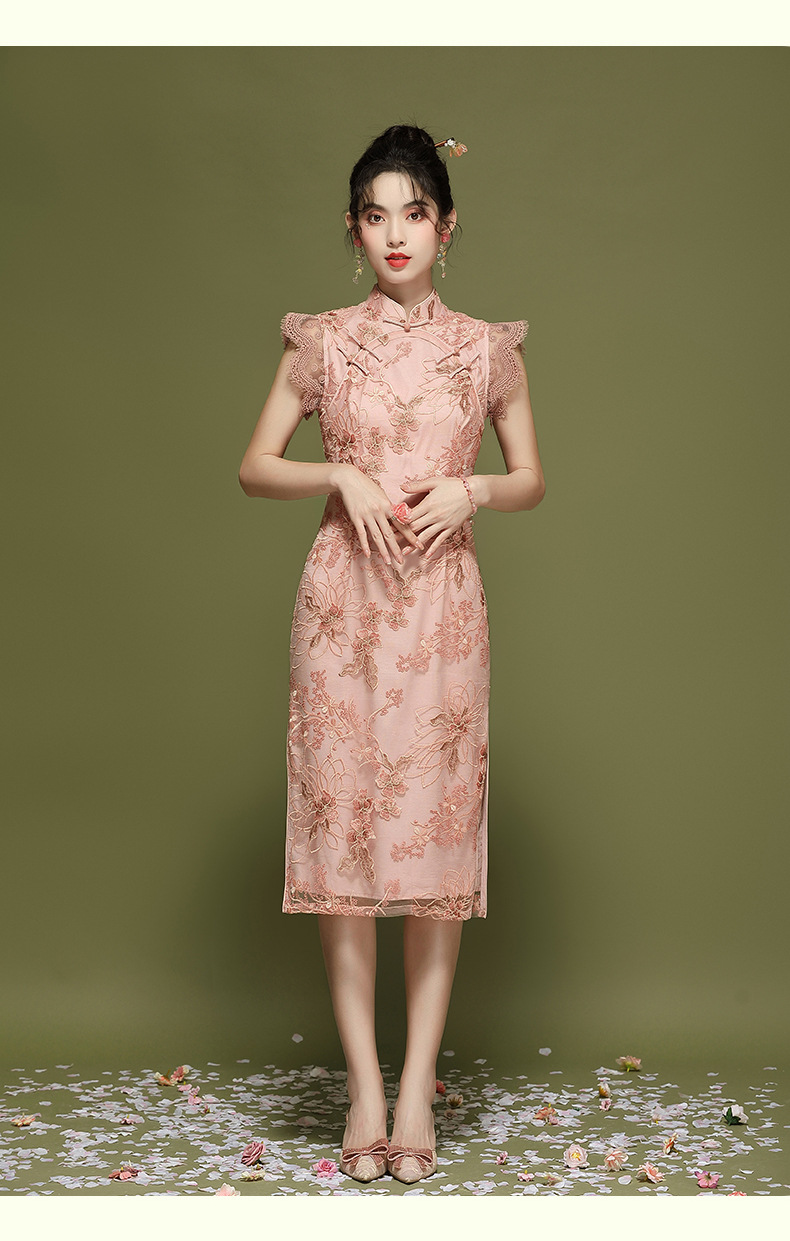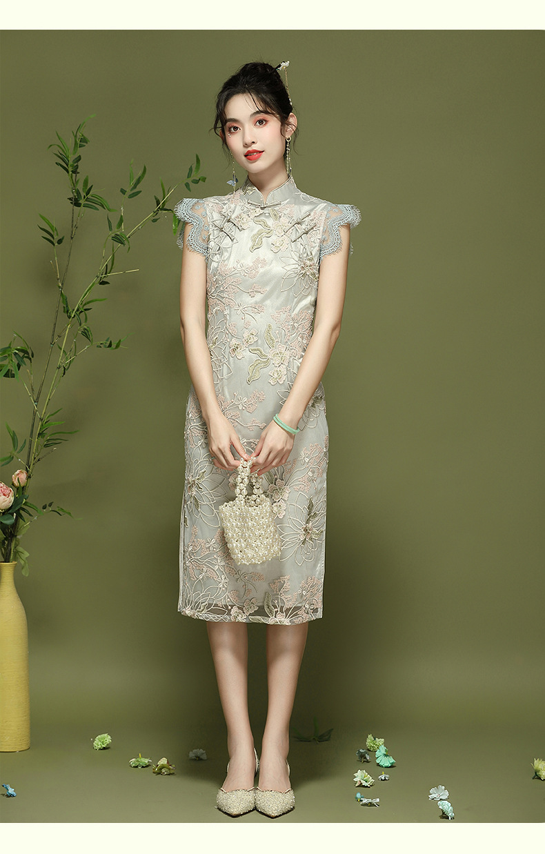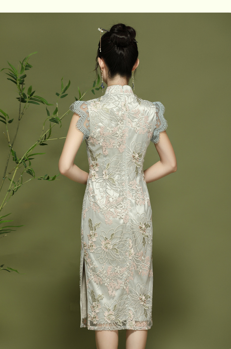 时尚新中式,蕾丝刺绣改良花边袖旗袍OY-24152