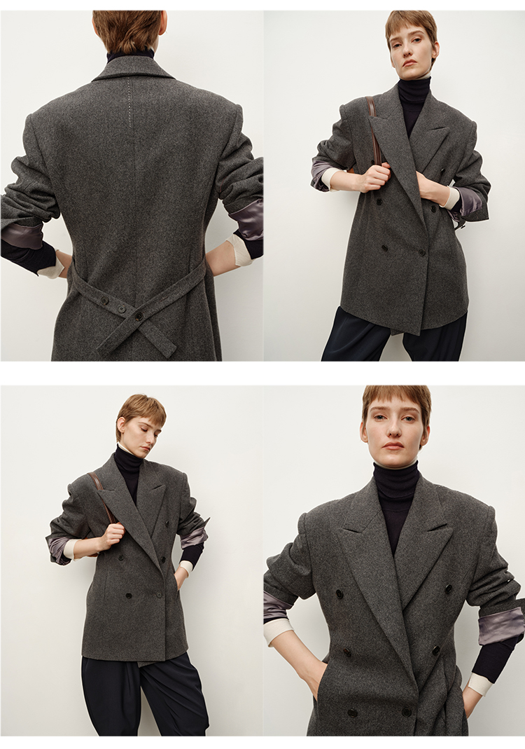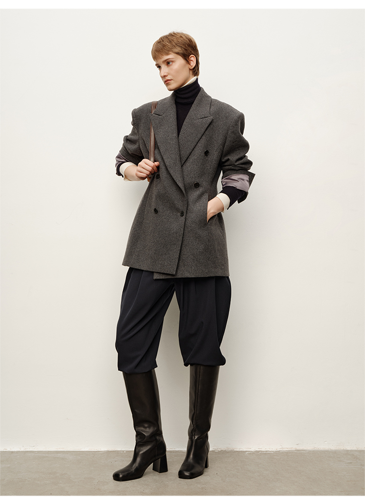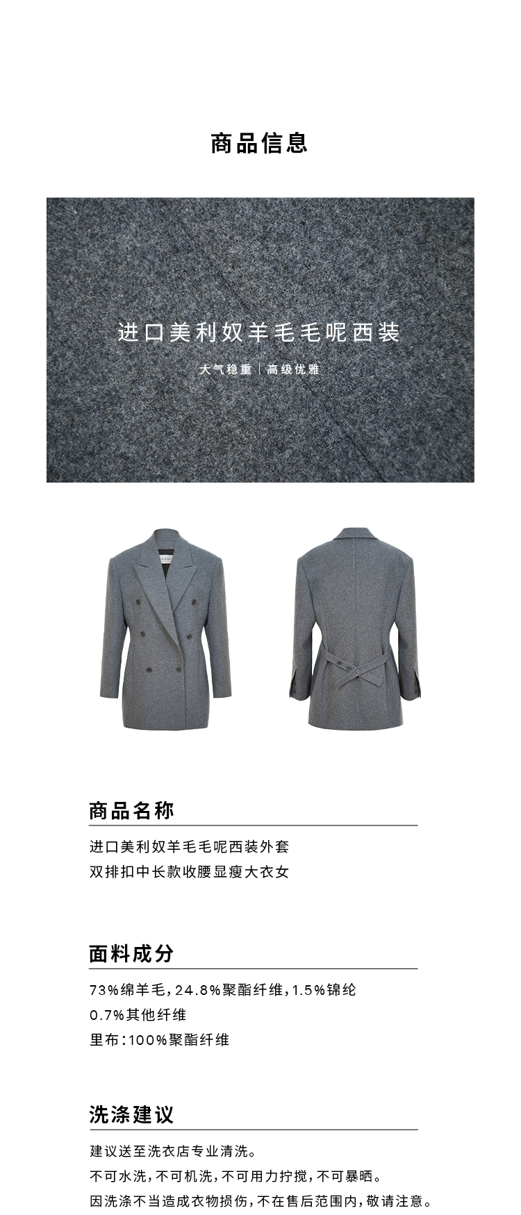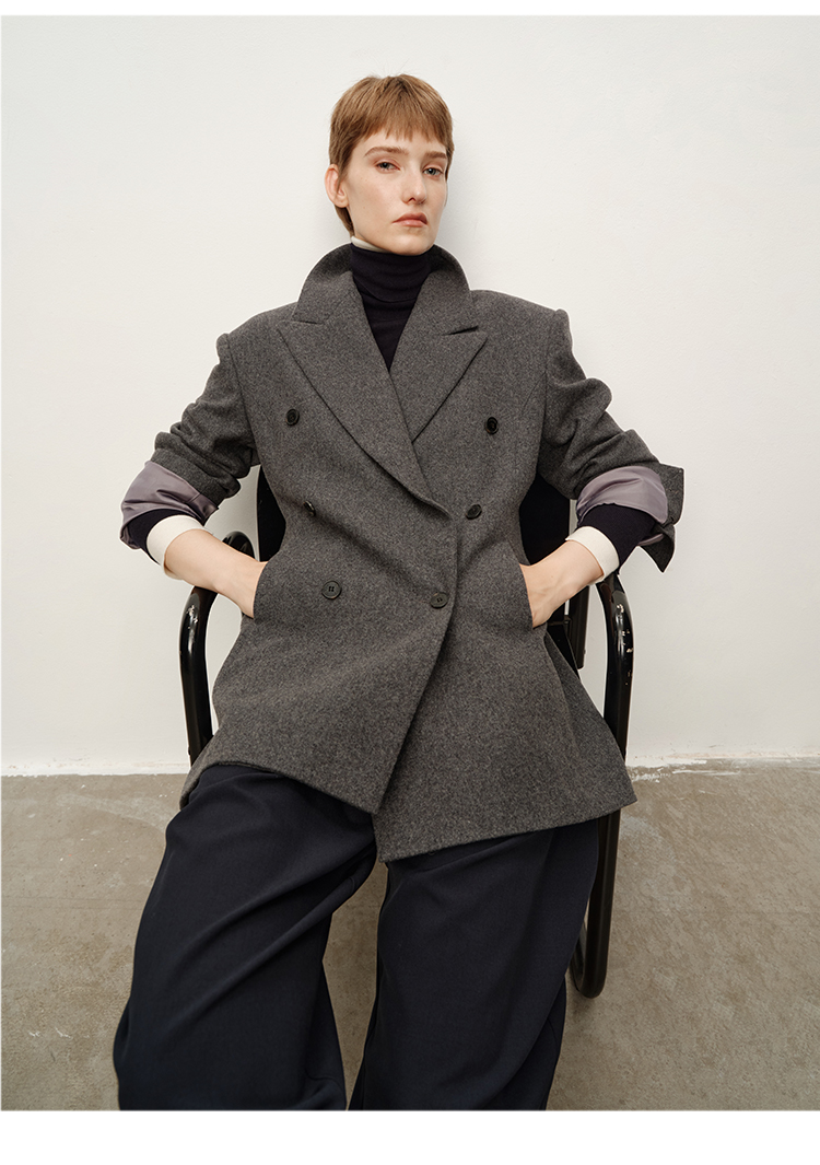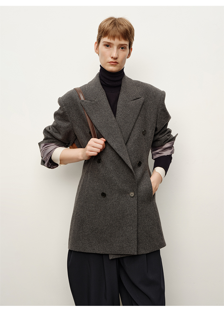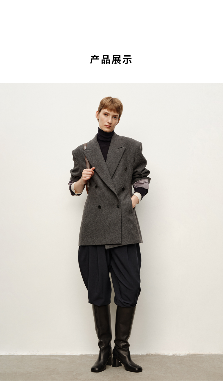 HIDEMI 进口美利奴羊毛毛呢西装外套双排扣中长款收腰显瘦大衣女