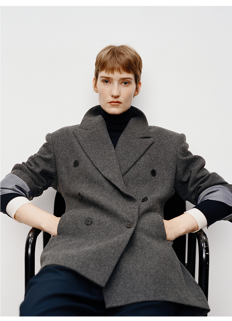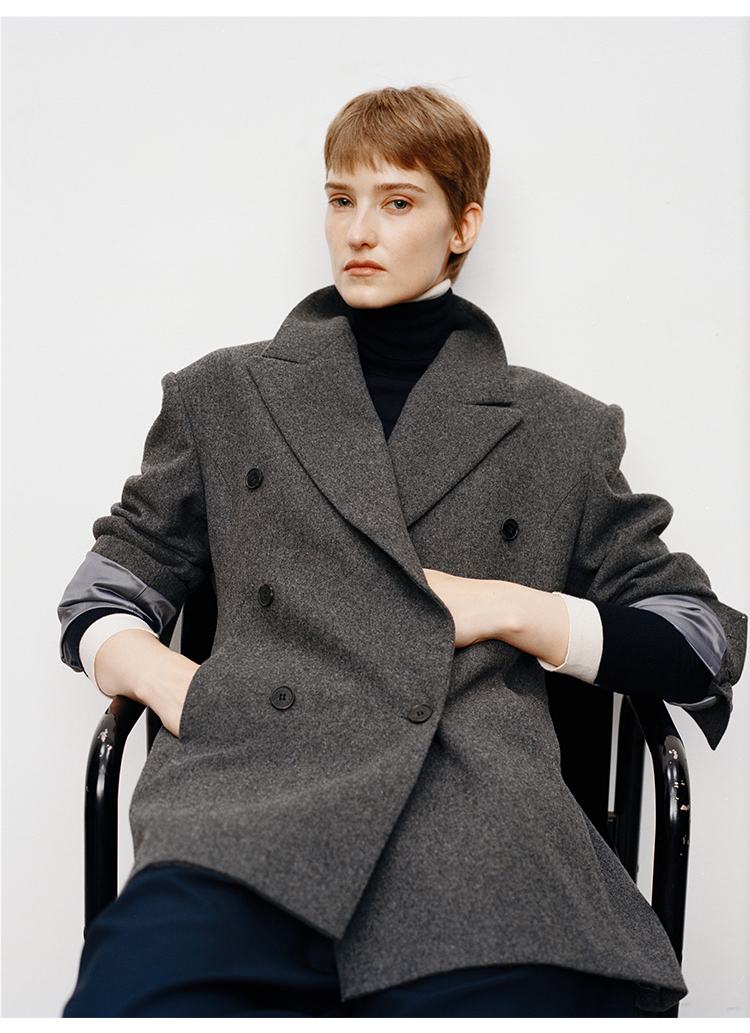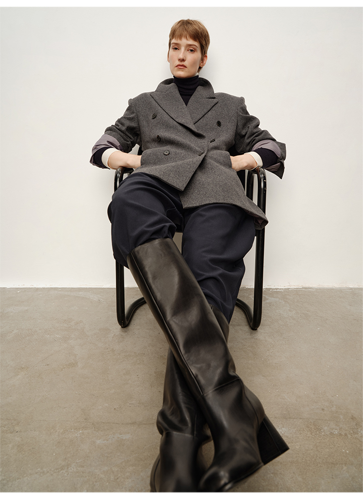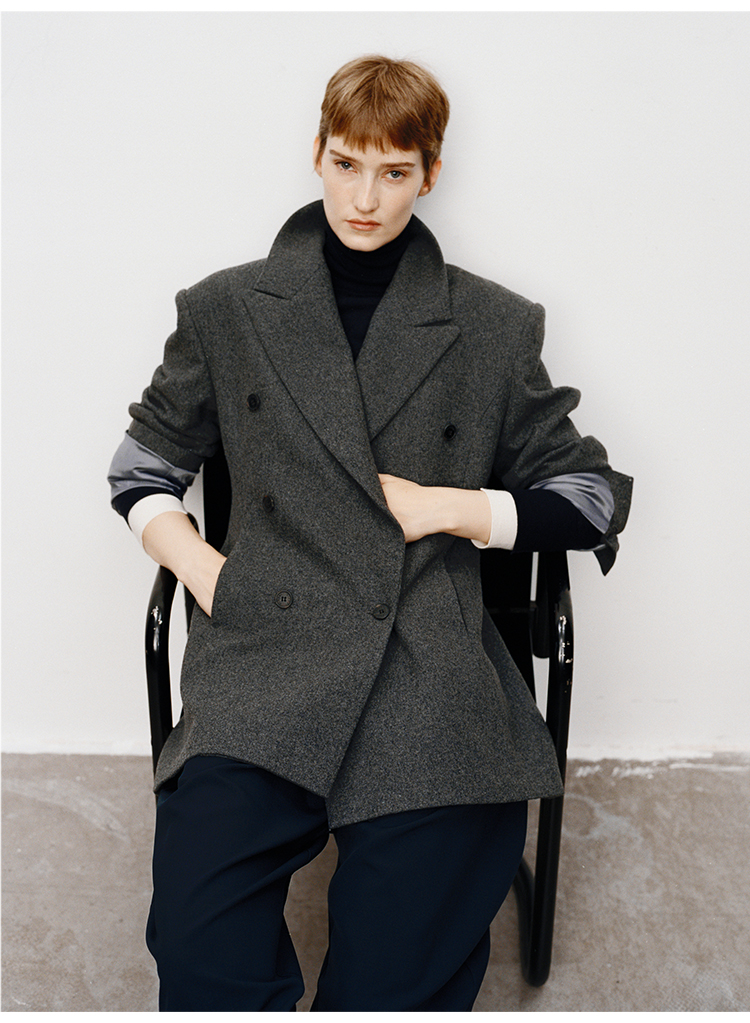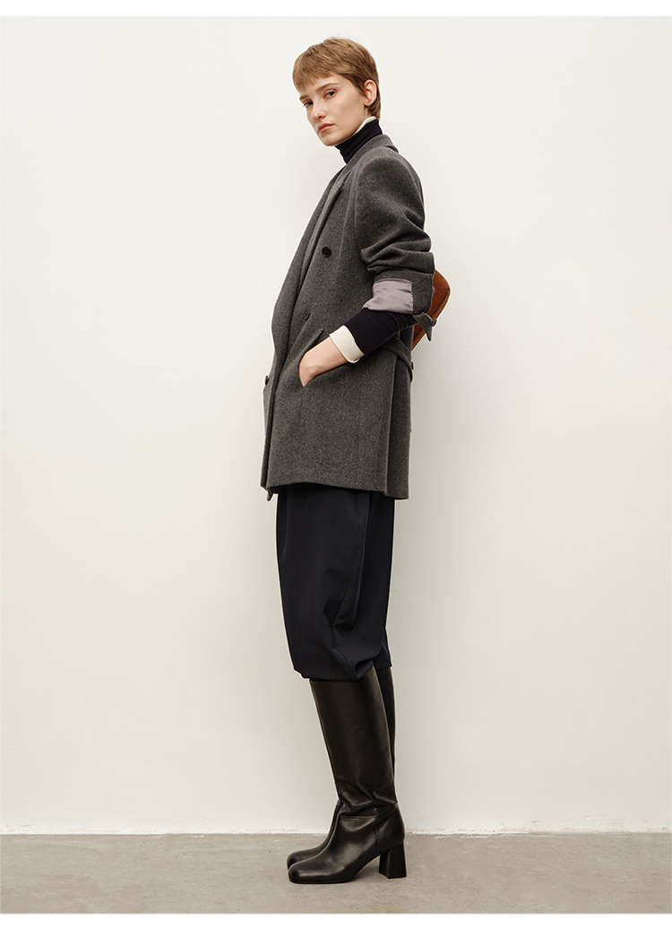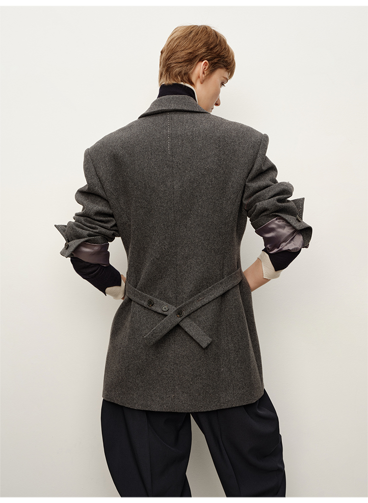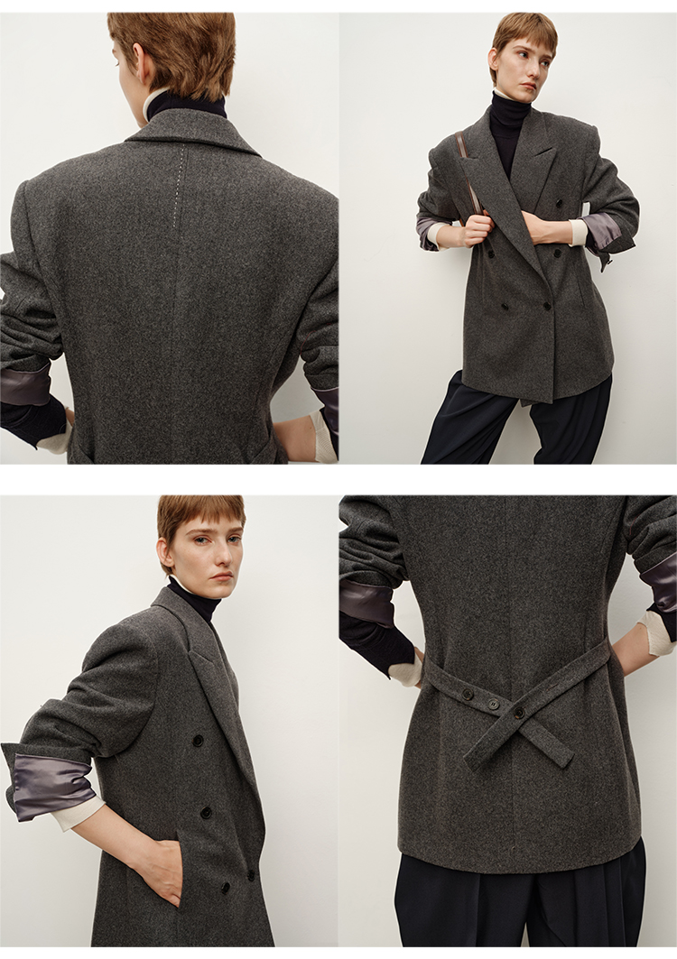 HIDEMI 进口美利奴羊毛毛呢西装外套双排扣中长款收腰显瘦大衣女