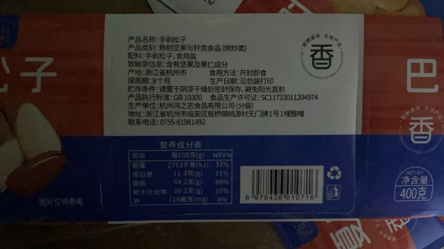 【生产商】杭州鸿之志食品有限公司(分装)