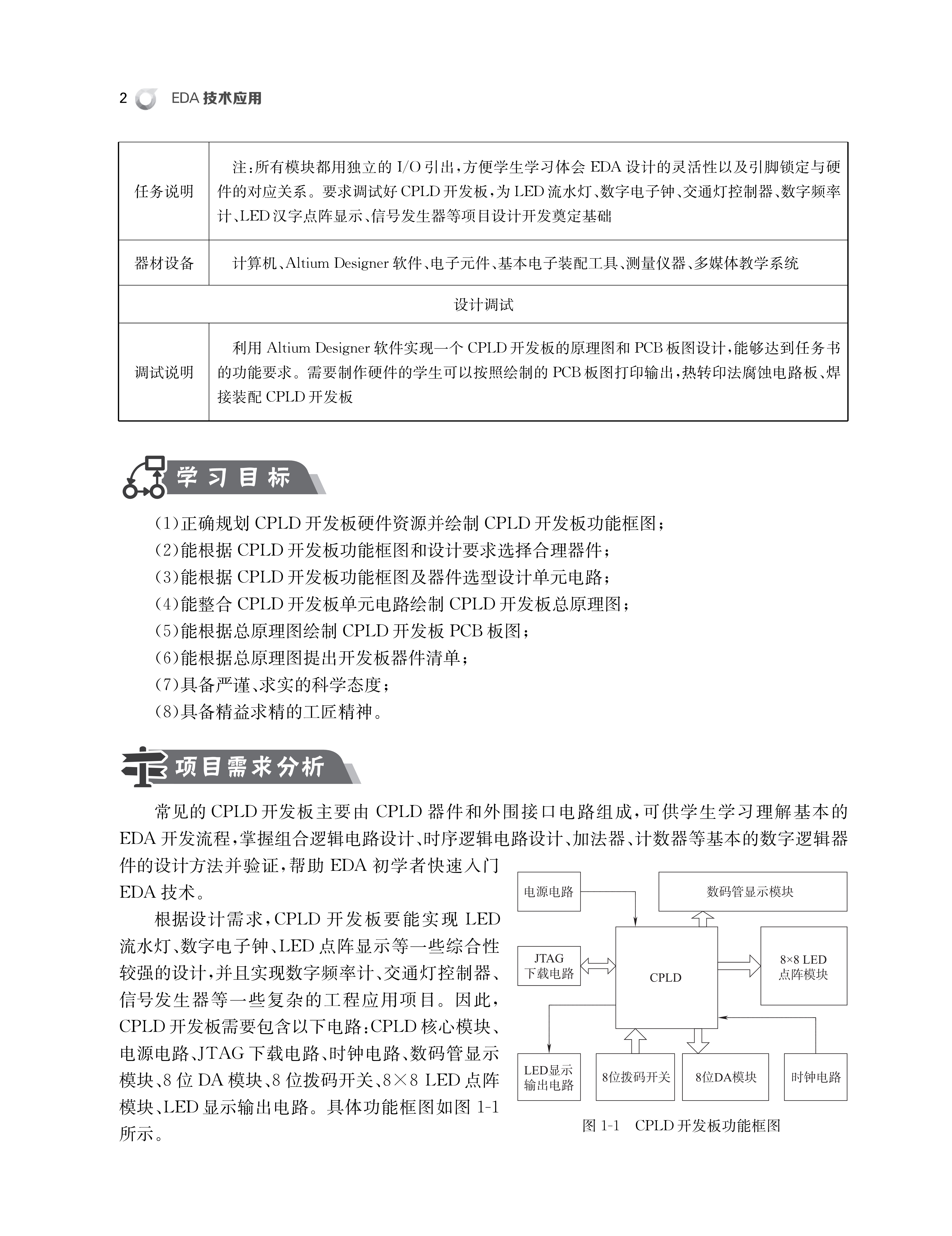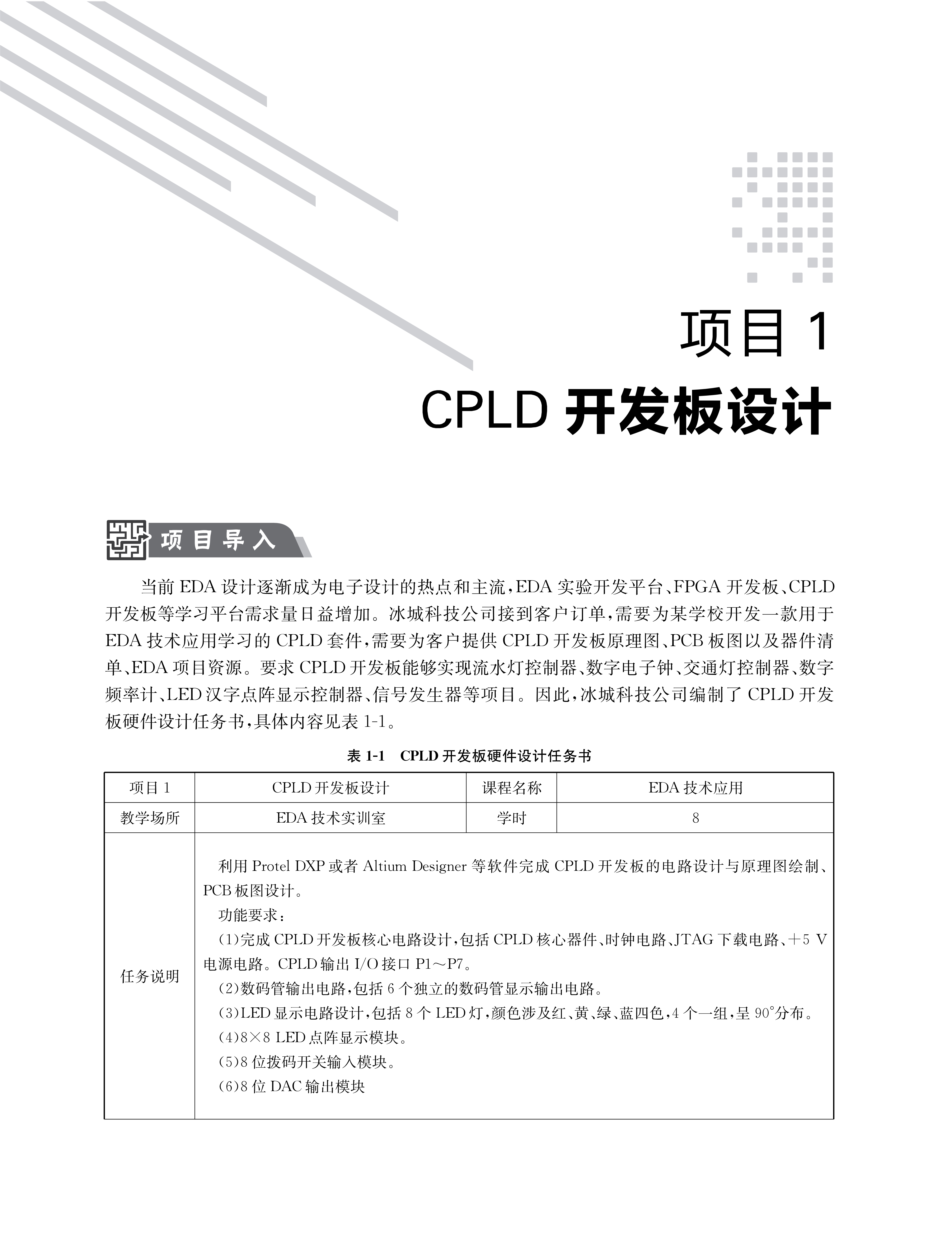 全书共分为7个学习项目,首先由硬件平台 CPLD 开发板的设计和 PCB板图绘制入手,以流水灯控制器、数字电子钟、交通灯控制器、数字频率计、汉字点阵显示控制器、信号发生器6个 EDA 应用开发项目,共16个任务展开。使学生能够从零基础,不具备 EDA 实验开发系统知识开始,自己动手制作CPLD开发板;从EDA 工具软件使用入手,通过各个教学项目的设计实现过程,逐渐掌握 EDA 技术基本知识、VHDL硬件描述语言程序编写技巧、EDA 开发设计流程,提升项目开发过程中解决问题的能力,获得 EDA 项目开发经验,提升 EDA 技术应用实践能力。