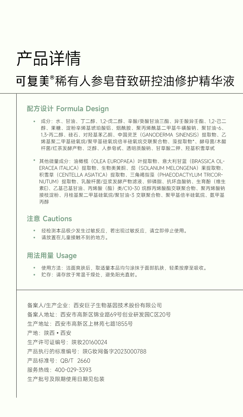 可复美秩序精华稀有人参皂苷致研控油修护舒缓保湿精华液5mL/瓶