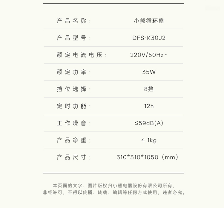 小熊/Bear 电风扇(空气循环扇) DFS-K30J2-P01 白色 电子式