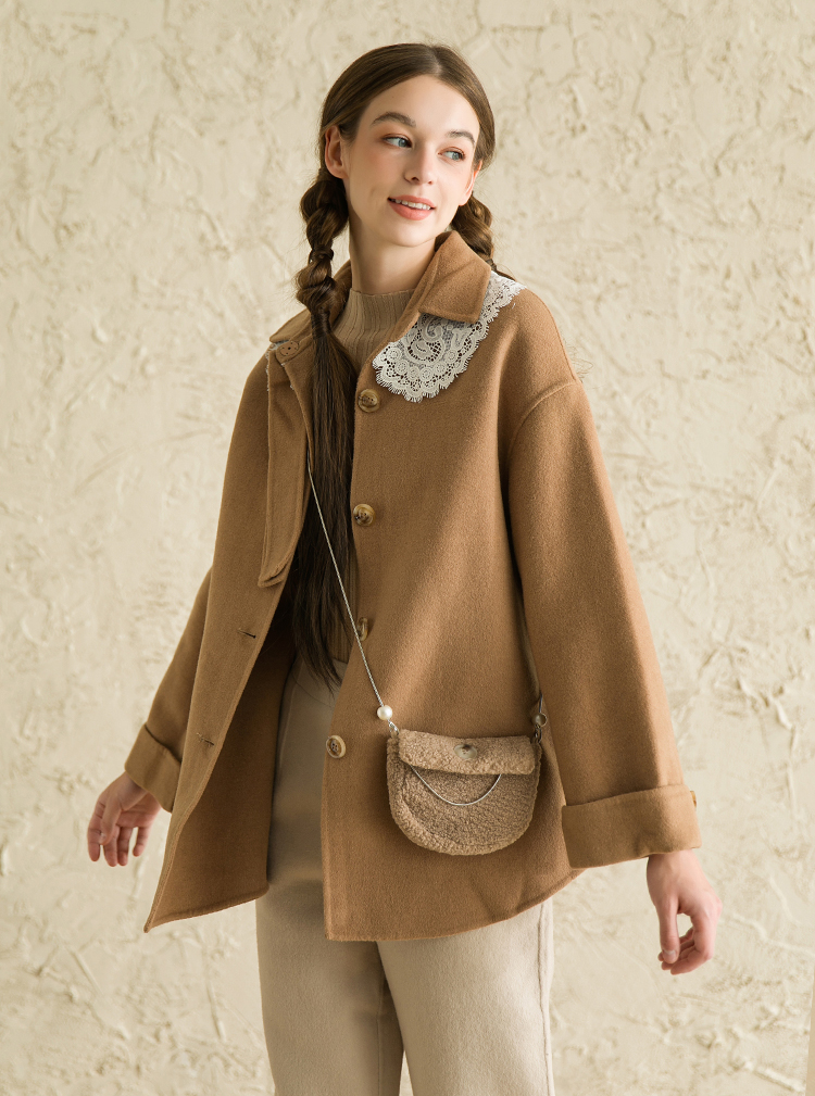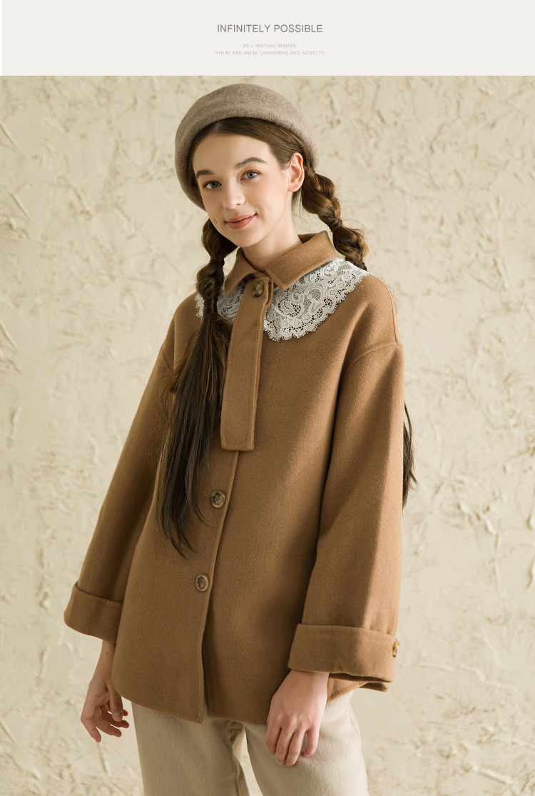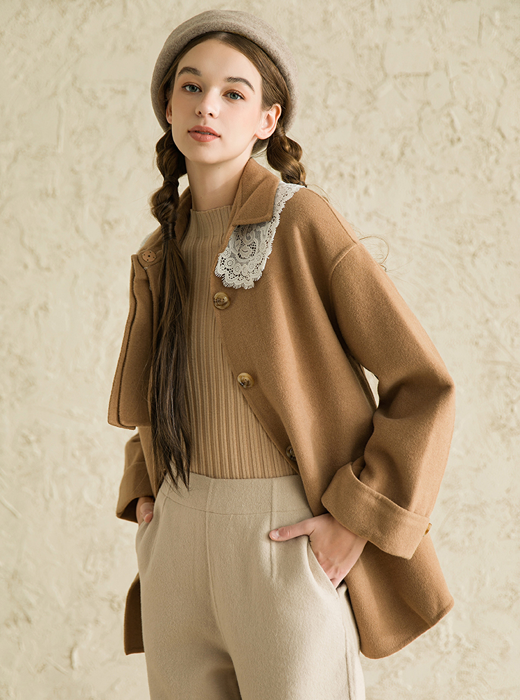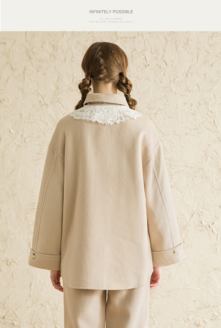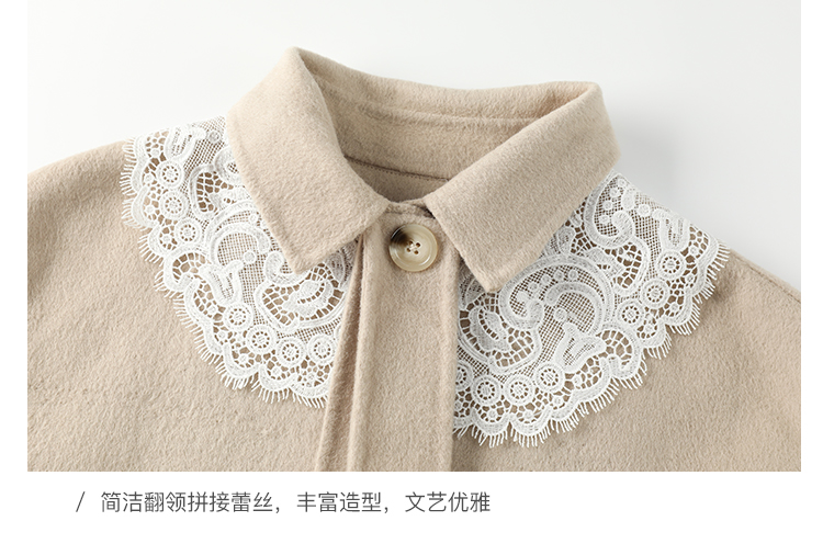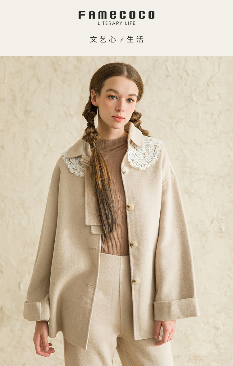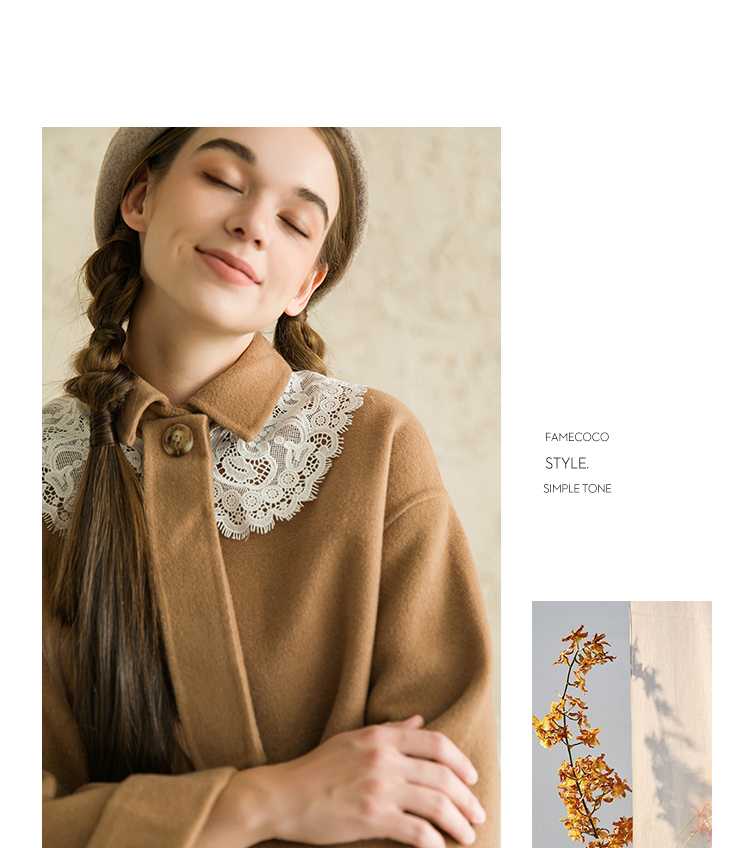 Famecoco范可儿气质百搭毛呢大衣冬季蕾丝花边娃娃领外套F198AC042