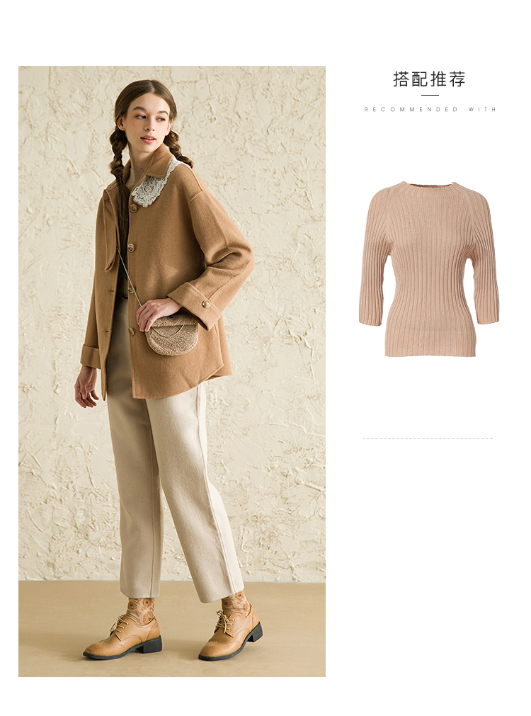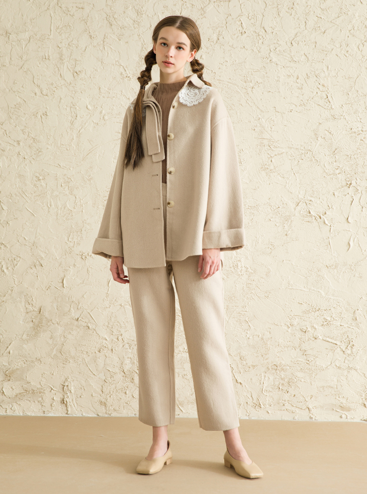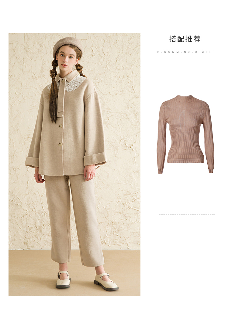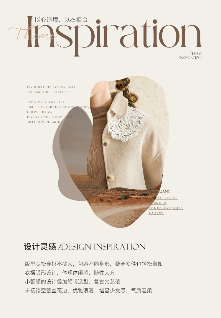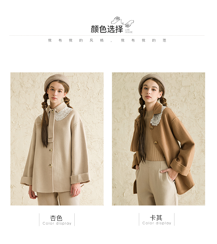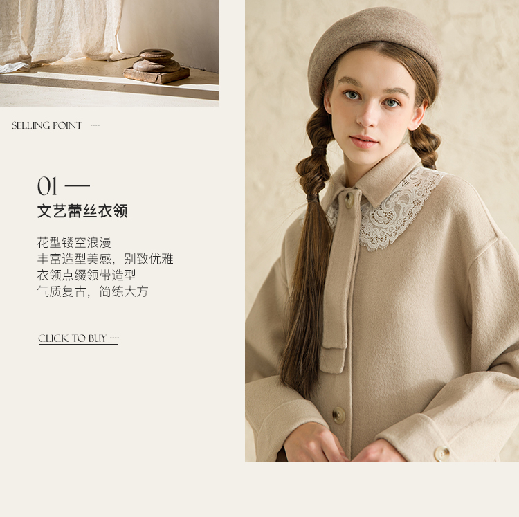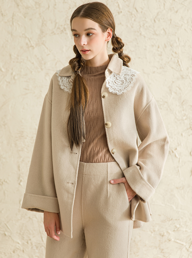 Famecoco范可儿气质百搭毛呢大衣冬季蕾丝花边娃娃领外套F198AC042