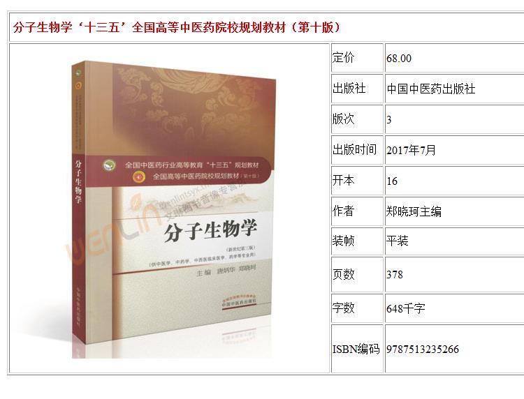 分子生物学 新世纪第3三版 全国高等中医药院校规划教材 第十10版 本科教材 郑晓珂主编 中国中医药出版社供中医学中药学等专业用