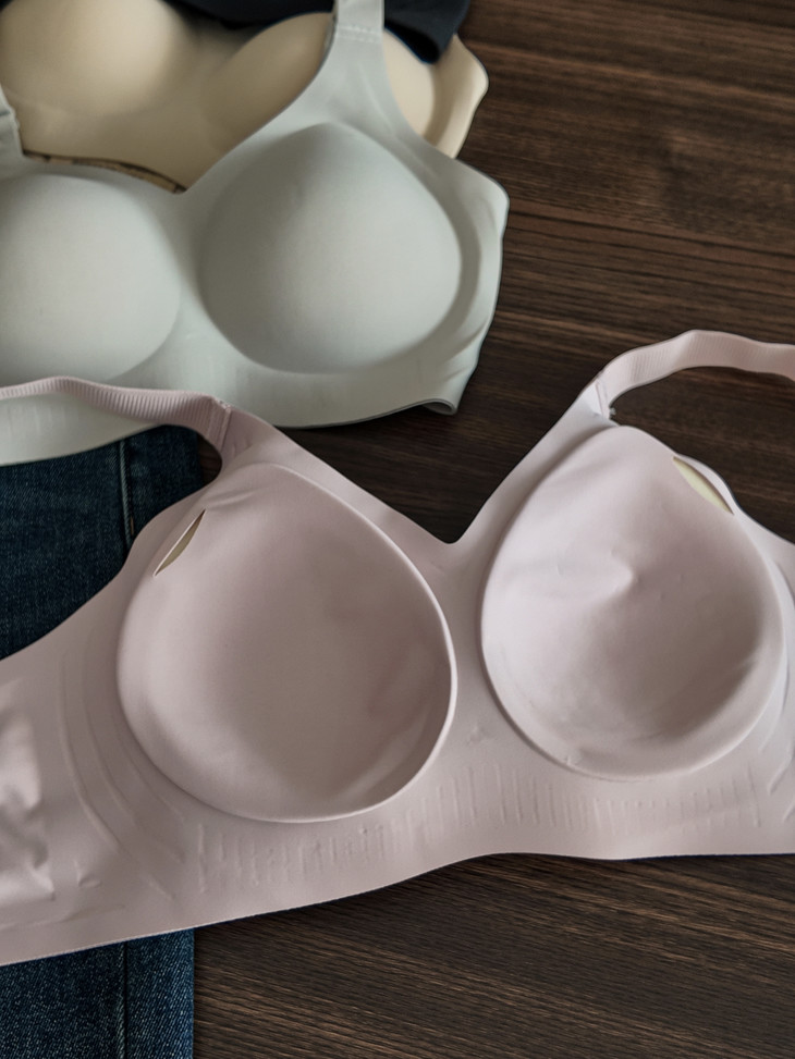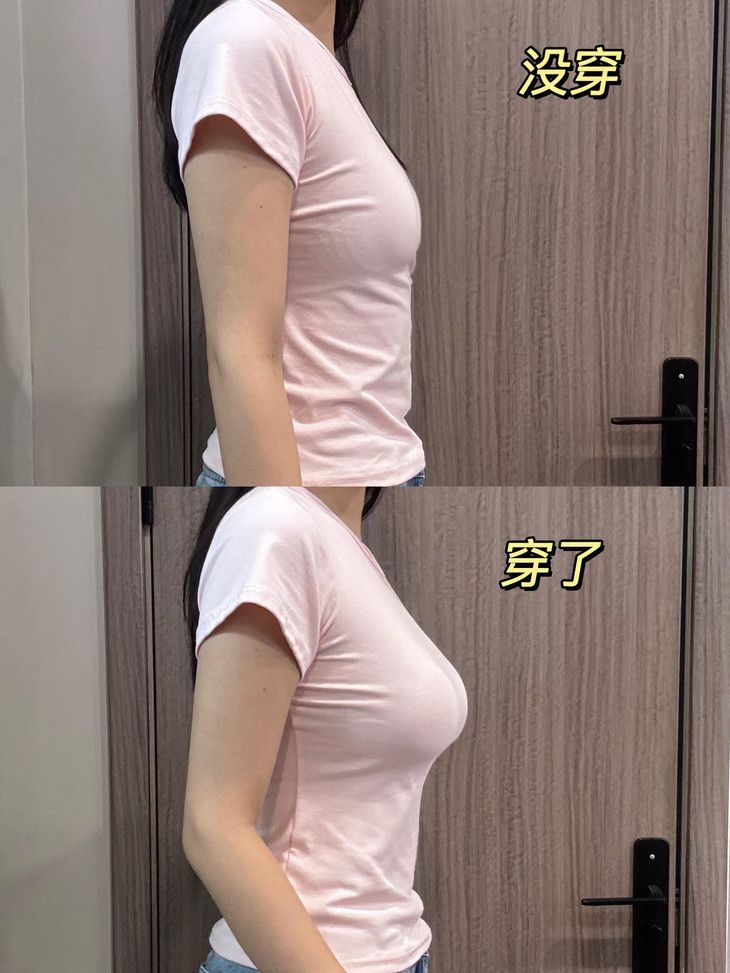 再就是它的全方位支撑我是真的爱了 弹力很大,包裹性很强 整个胸部直接就被牢牢包裹住了 而且两侧还有果冻胶条 把副乳都能聚拢到一起 就连小胸都能直接变成润挺饱满 穿上平A都成C了