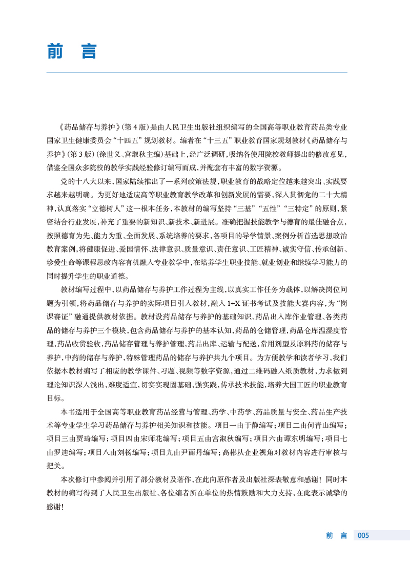 本次修订的重点:一是内容上要传承创新,同时根据新出台的国家政策法规、《中国药典》等对教材进行更新,并解决职业教育聚焦的新问题,以保证教材内容的先进性;二是继续坚持“三基”“五性”“三特定”的原则,进一步优化主体框架设计,做到固基础,打破升学“天花板”,强实践,传承技术技能,培养大国工匠;三是丰富栏目模块,切实做到课证融合;四是体现理实一体,提高学生实践能力;五是优化版式设计,兼容不同学时需求,可以尝试活页式教材编写;同时将思想政治教育润物细无声地融入教材,激发学生的爱国主义情怀以及大国工匠精神。 在提高可读性方面采取以下措施:一是根据各门课程的特点,采用案例导入、问题引领等编写方式,使教材更加生动且更贴合岗位实际,增加学生的学习兴趣;二是多配图表,形象直观,便于教师讲授与学生理解;三是采用纸质教材为载体的融合教材形式,运用二维码技术将教学需要的补充内容做成数字资源,形成线上线下的多维学习模式。