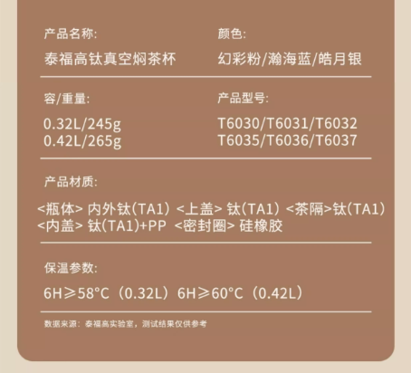 泰福高钛真空焖茶杯320mlT6030/T6031/T6032