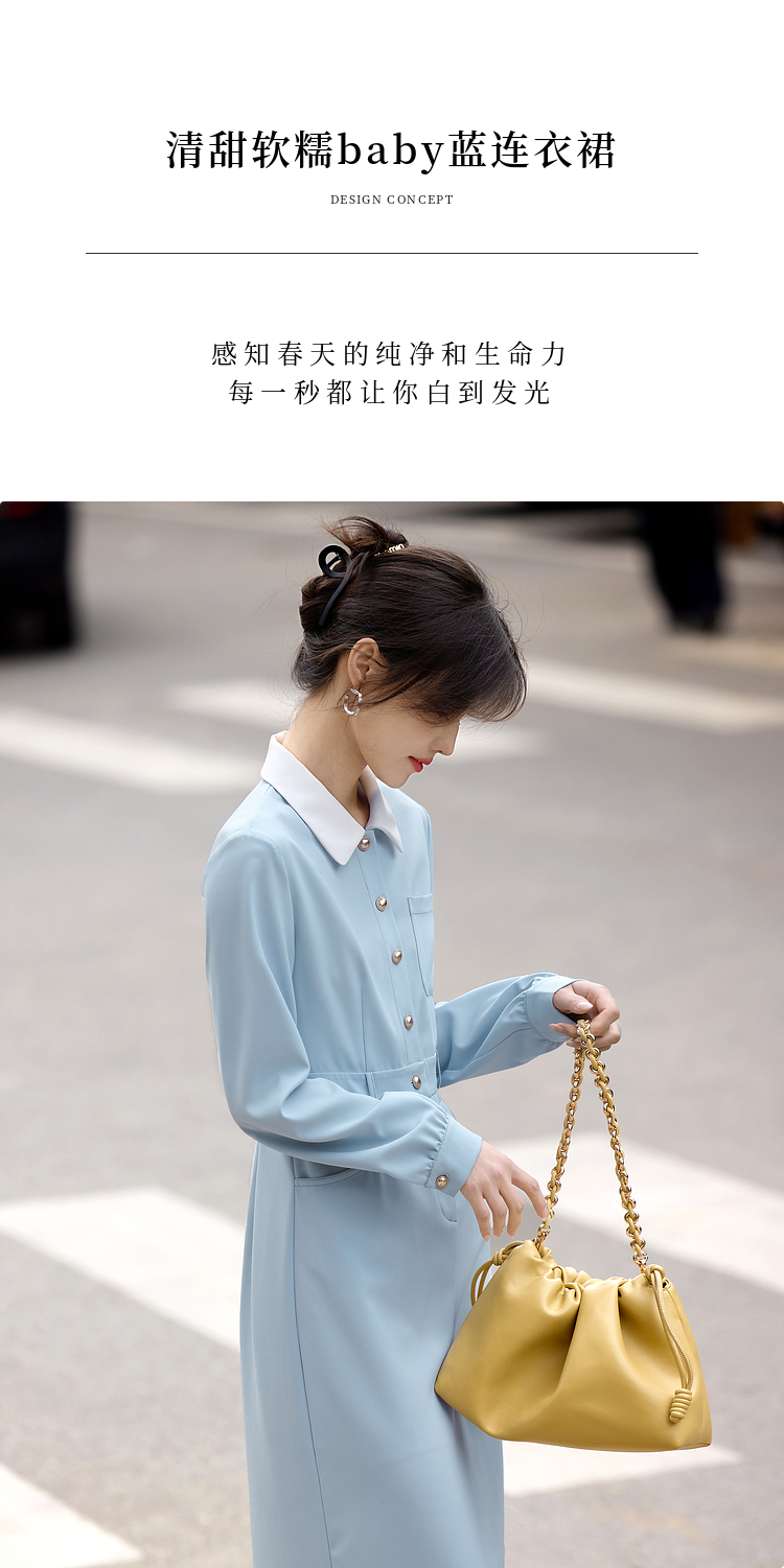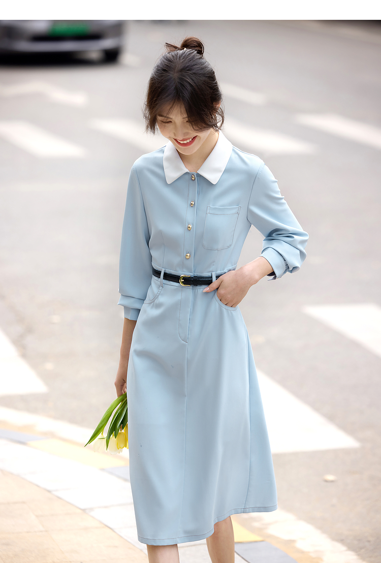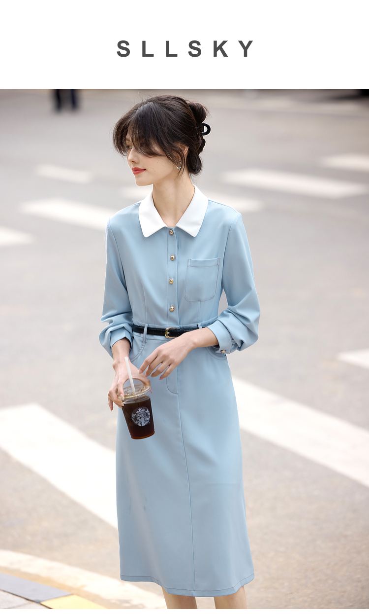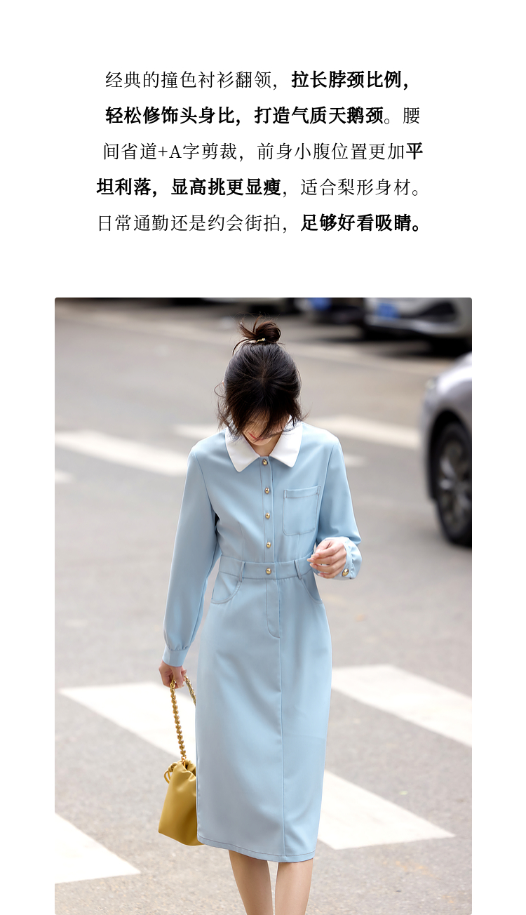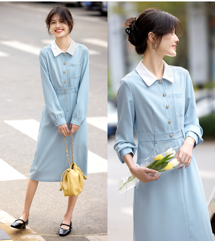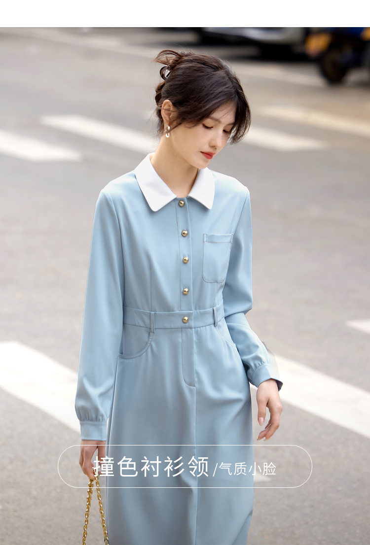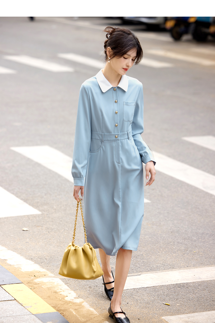【五折购】熙世界法式polo领蓝色连衣裙女2025春秋新款长袖通勤收腰衬衫裙子