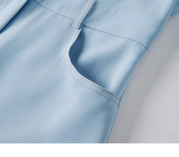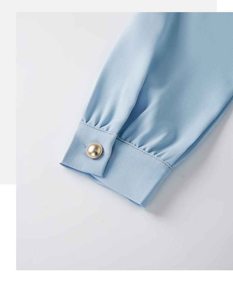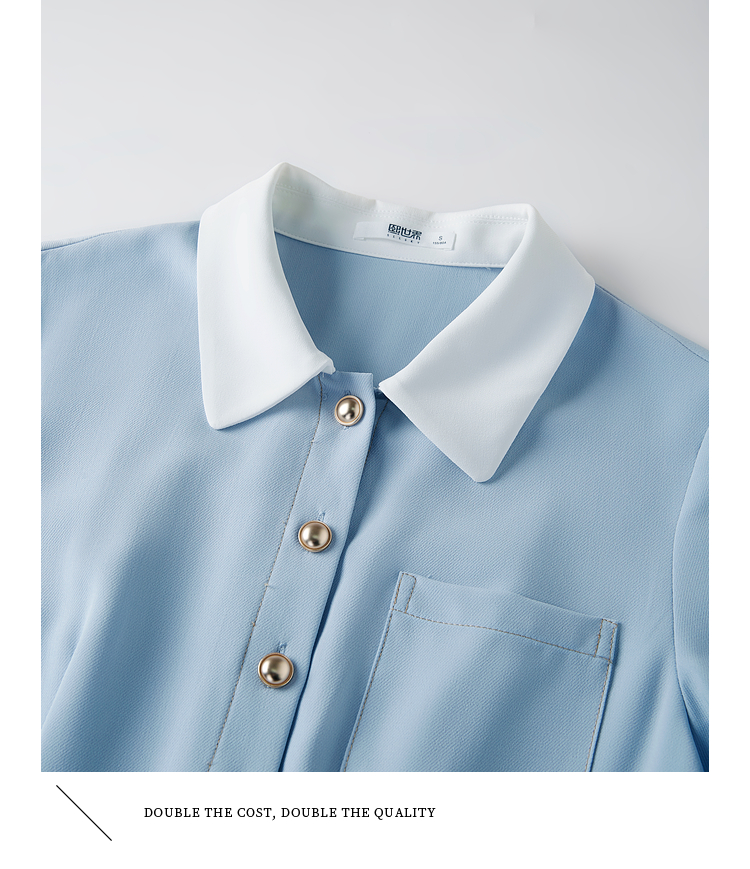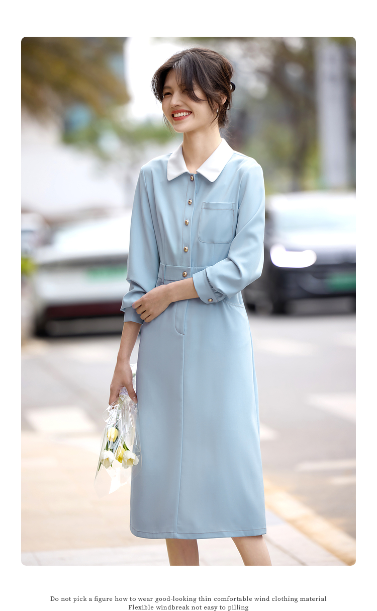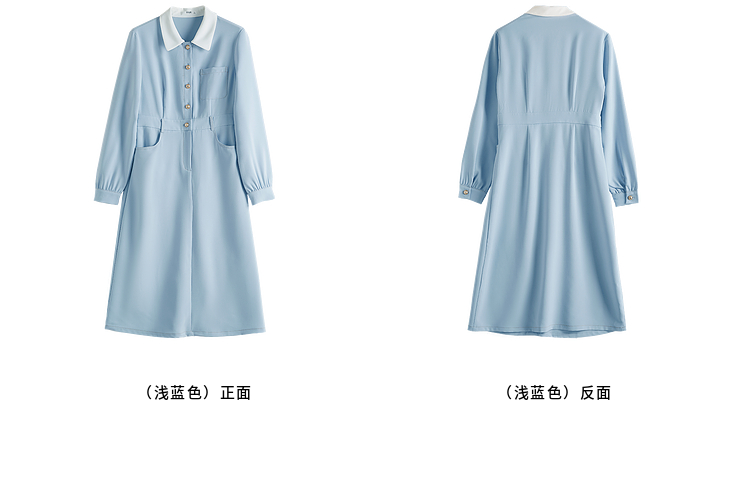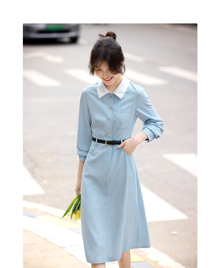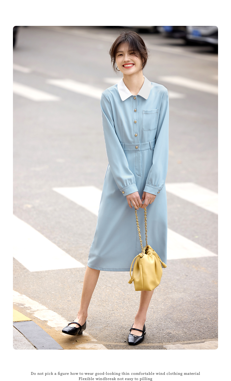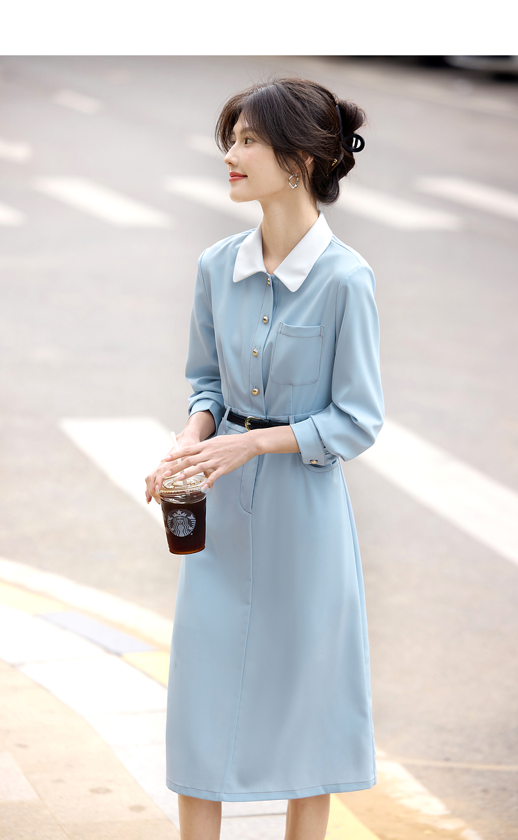 【五折购】熙世界法式polo领蓝色连衣裙女2025春秋新款长袖通勤收腰衬衫裙子