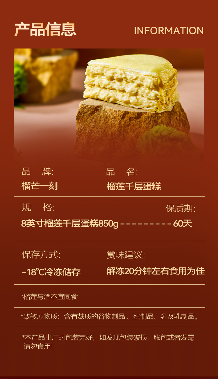【家庭分享装】榴芒一刻 8英寸泰国金枕榴莲千层蛋糕850g办公室下午茶