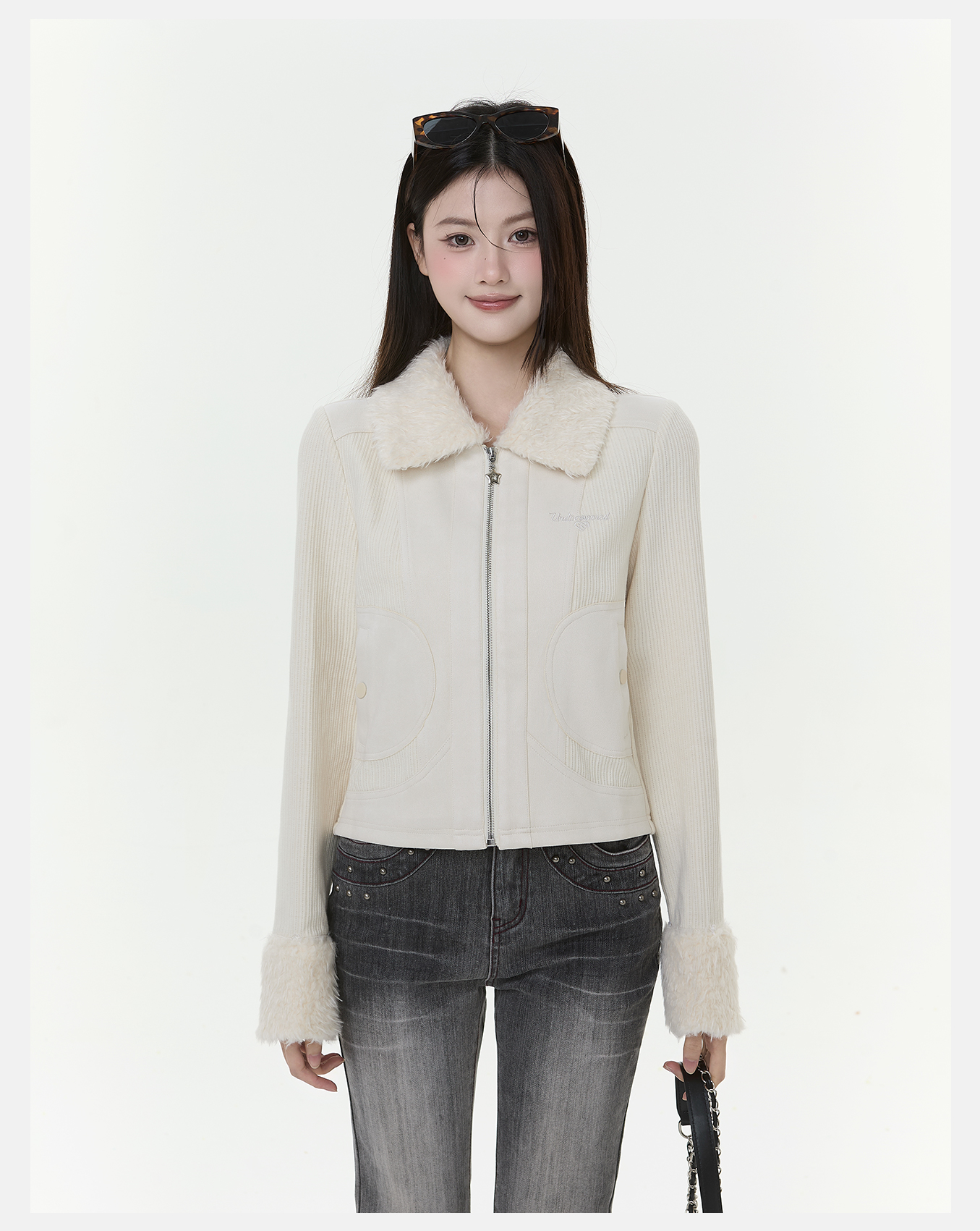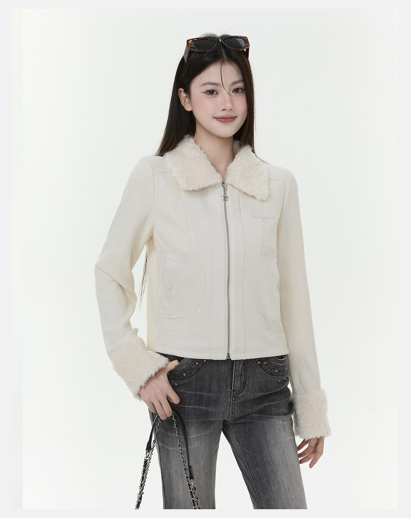 P&X设计师女装2025冬季时尚拉链长袖梭织短款外套825413243 杏色