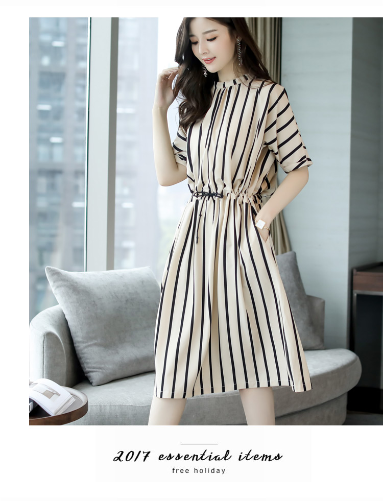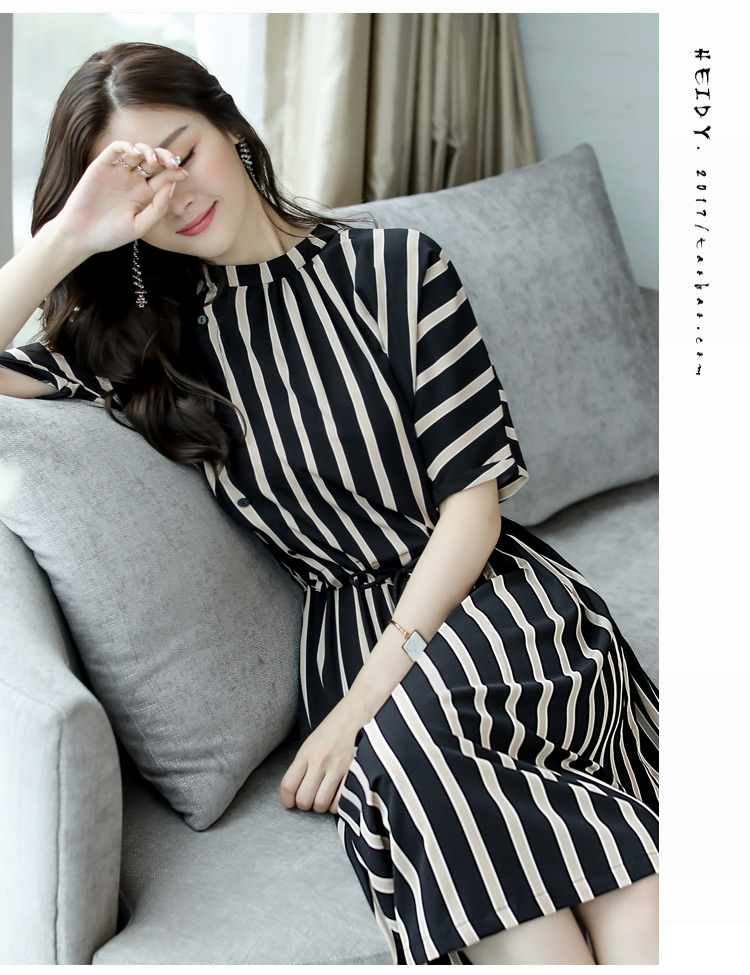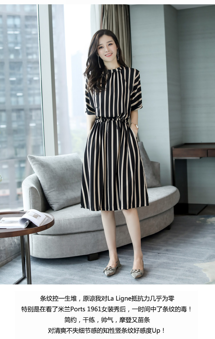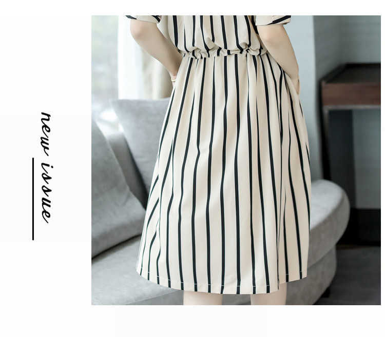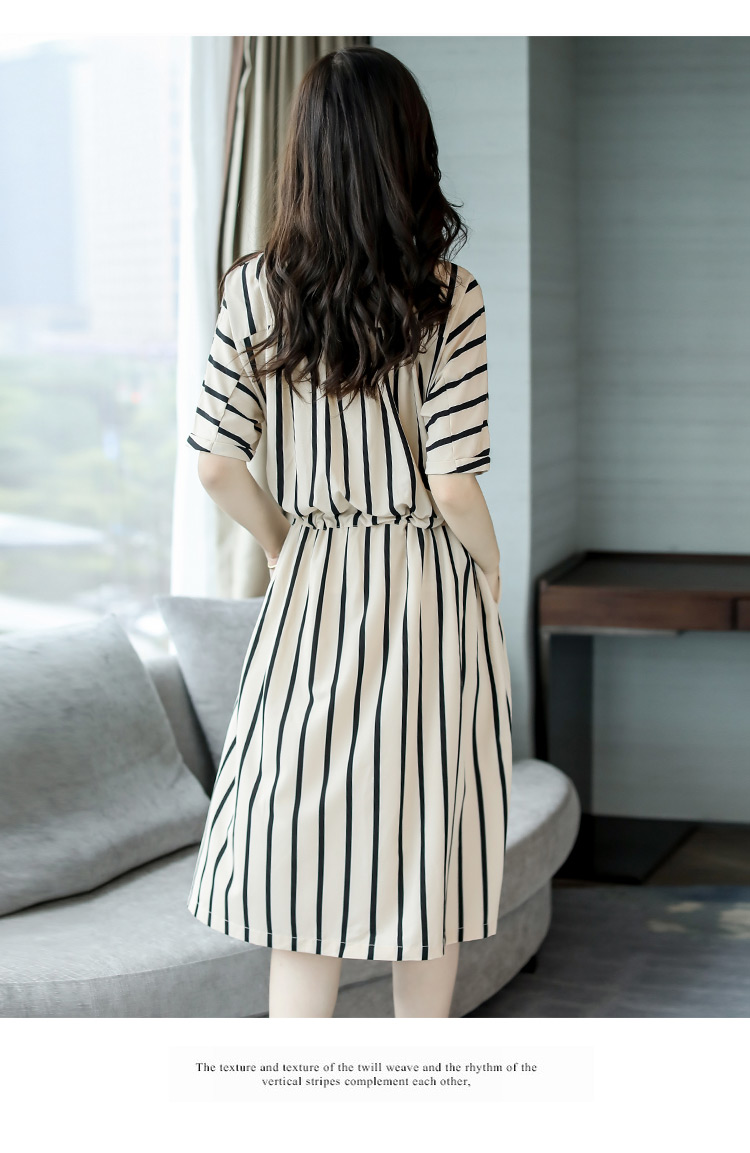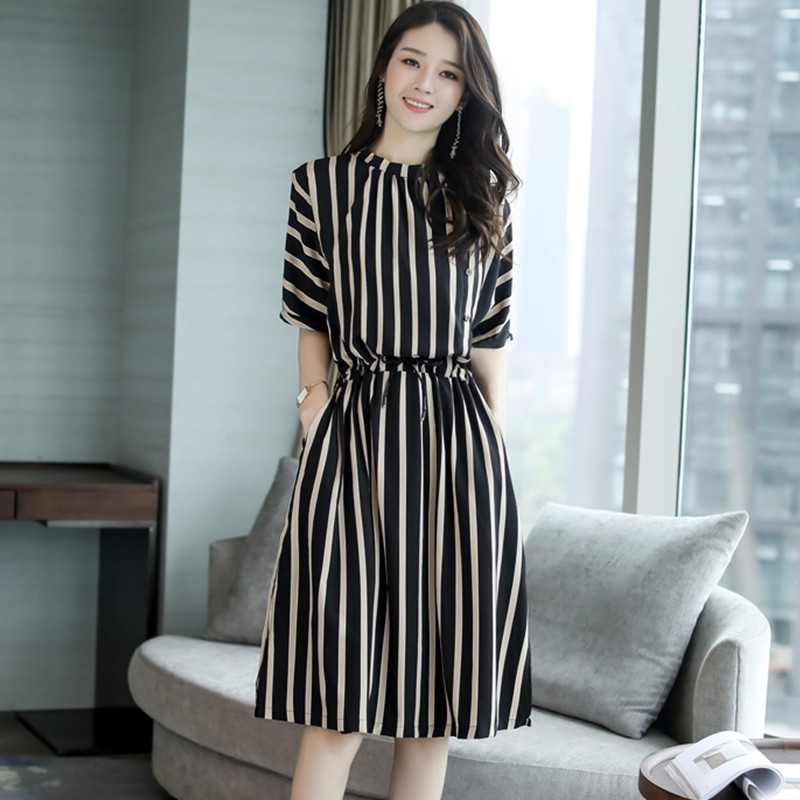 夏季新款气质条纹连衣裙女短袖原宿风宽松直筒松紧腰中长裙女装服饰七夕情人节
