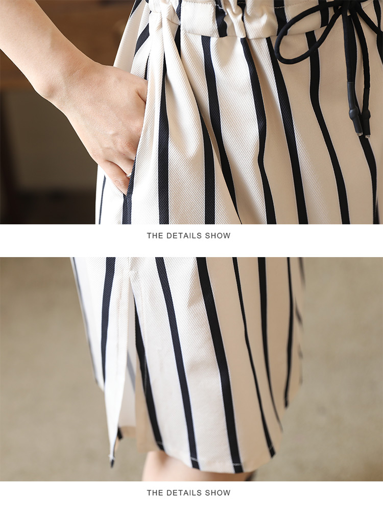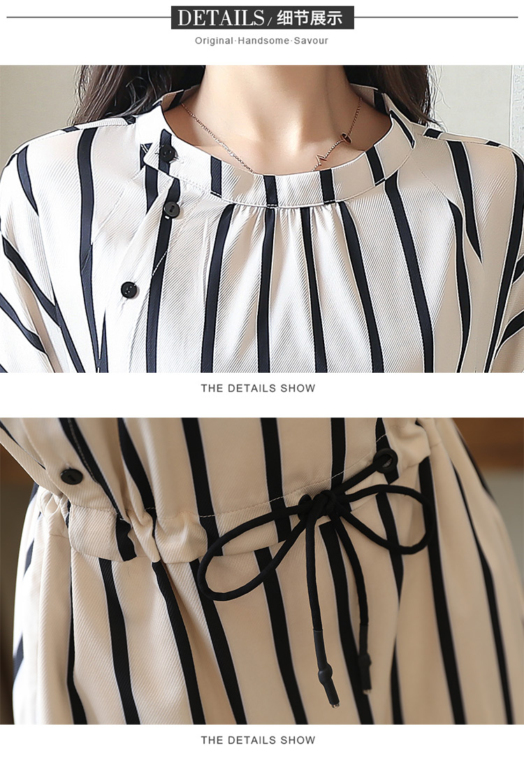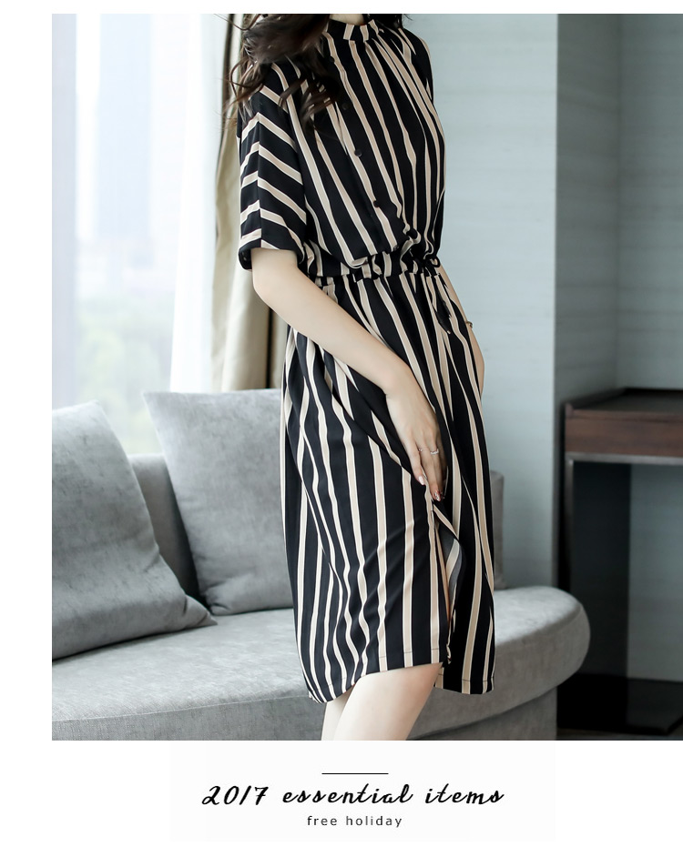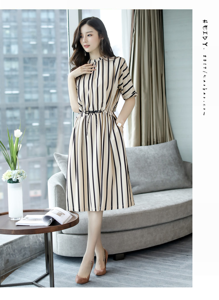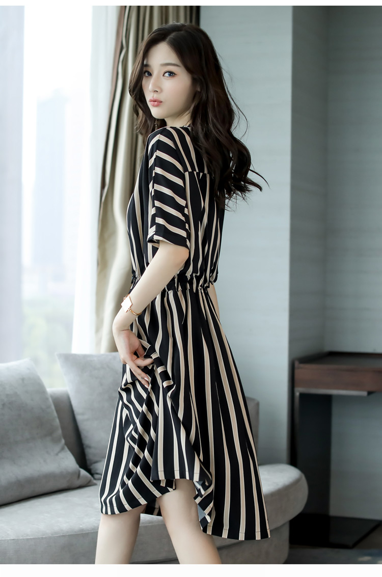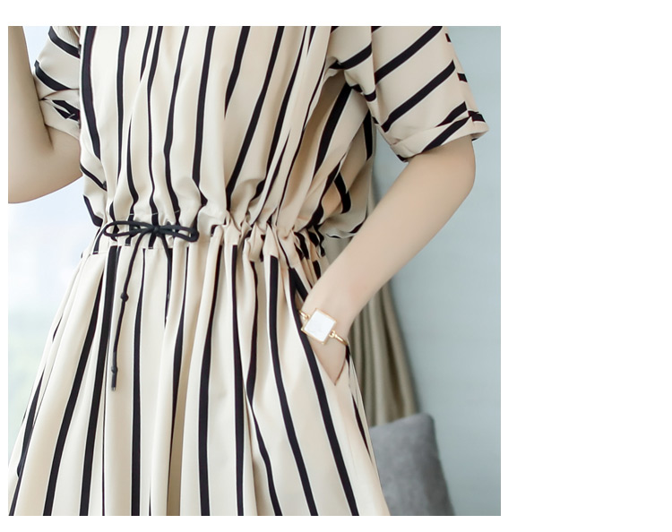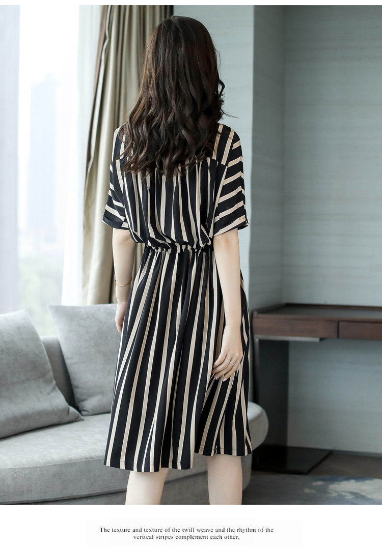 夏季新款气质条纹连衣裙女短袖原宿风宽松直筒松紧腰中长裙女装服饰七夕情人节