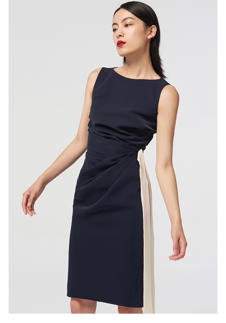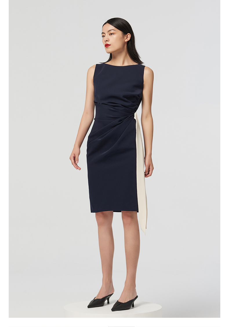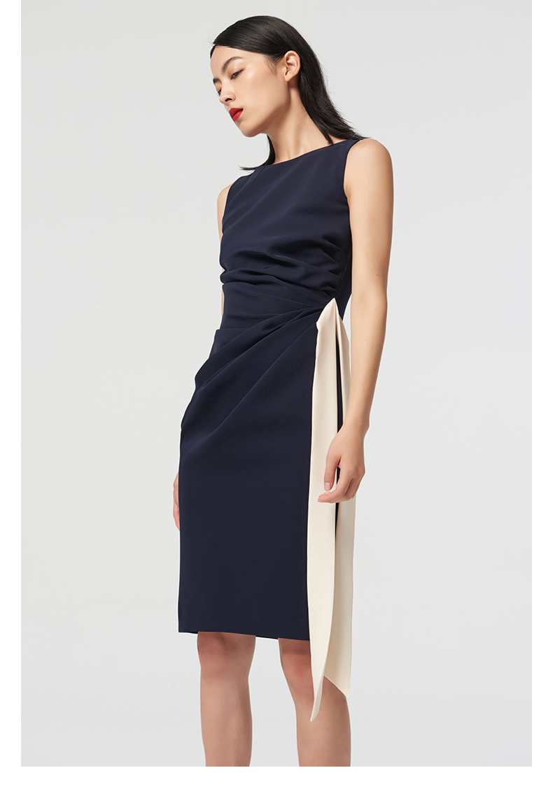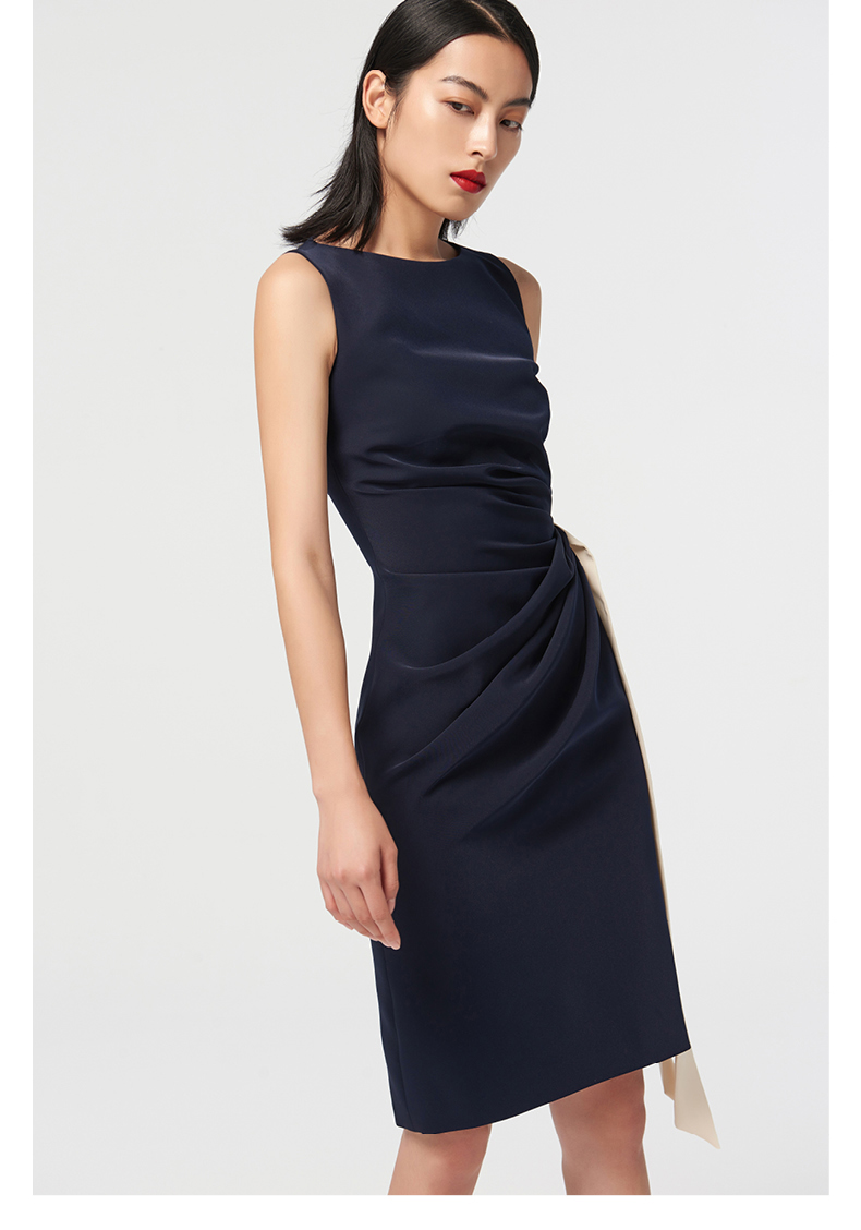 【蓝调多瑙河】AtelierMissLu设计师褶皱藏蓝微光泽修身连衣裙/0000465D