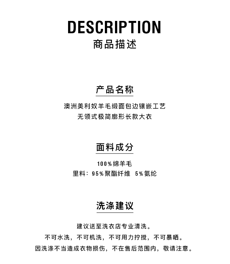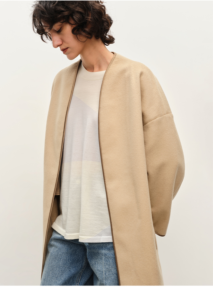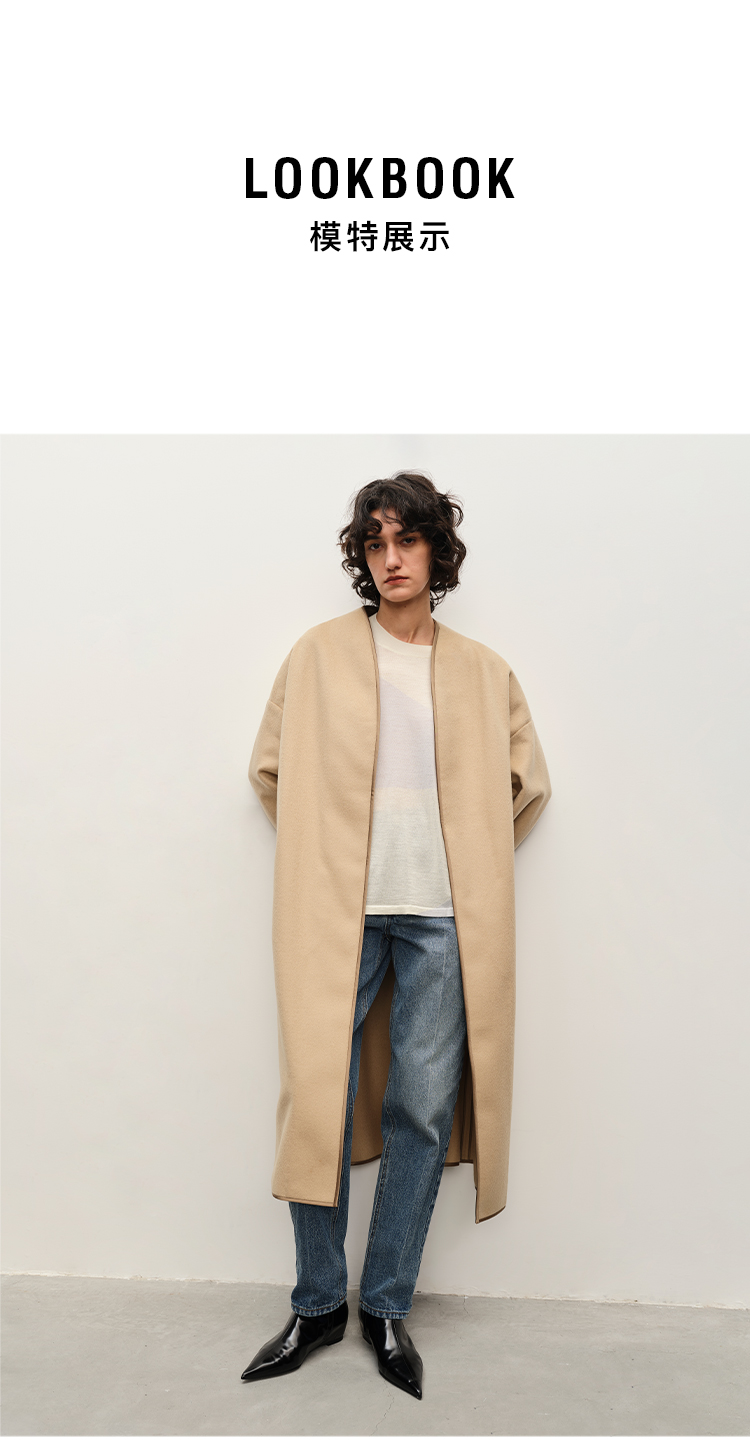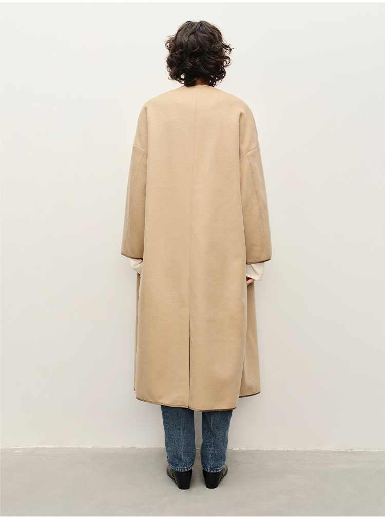 HIDEMI进口澳洲美利奴羊毛缎面包边镶嵌工艺无领式极简廓形长款大衣