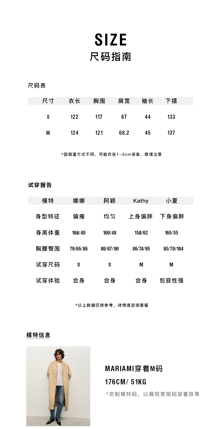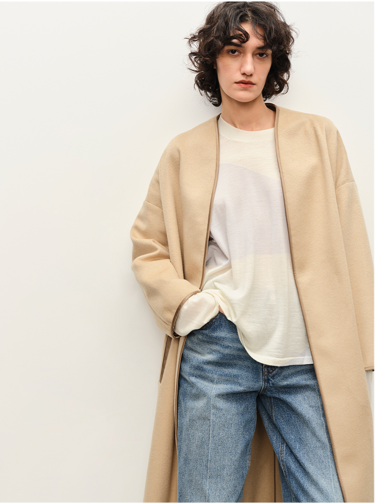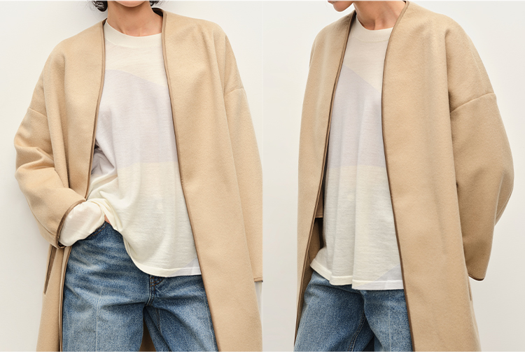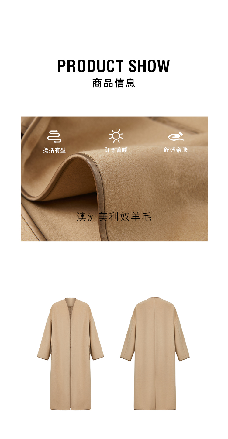 HIDEMI进口澳洲美利奴羊毛缎面包边镶嵌工艺无领式极简廓形长款大衣