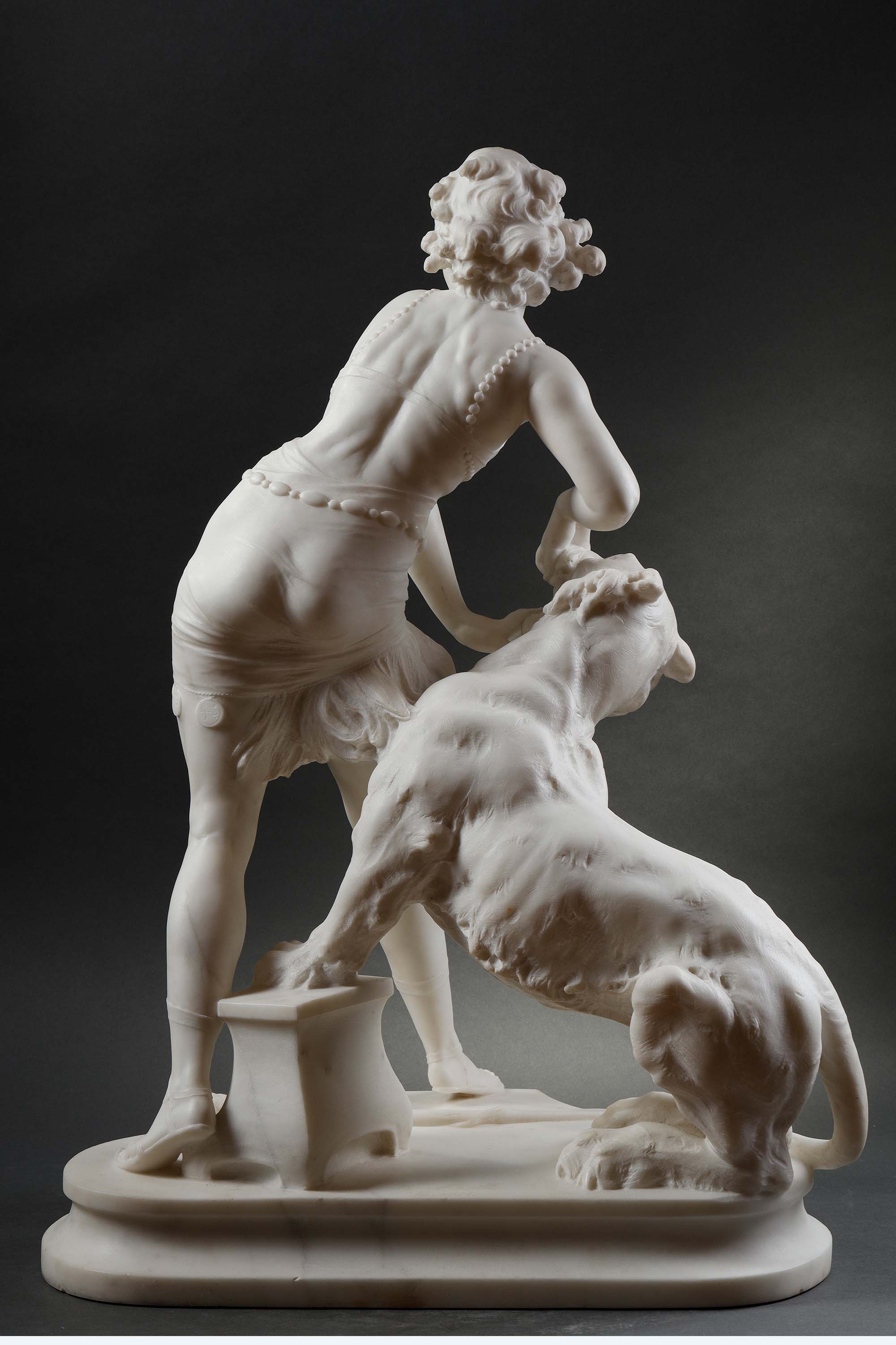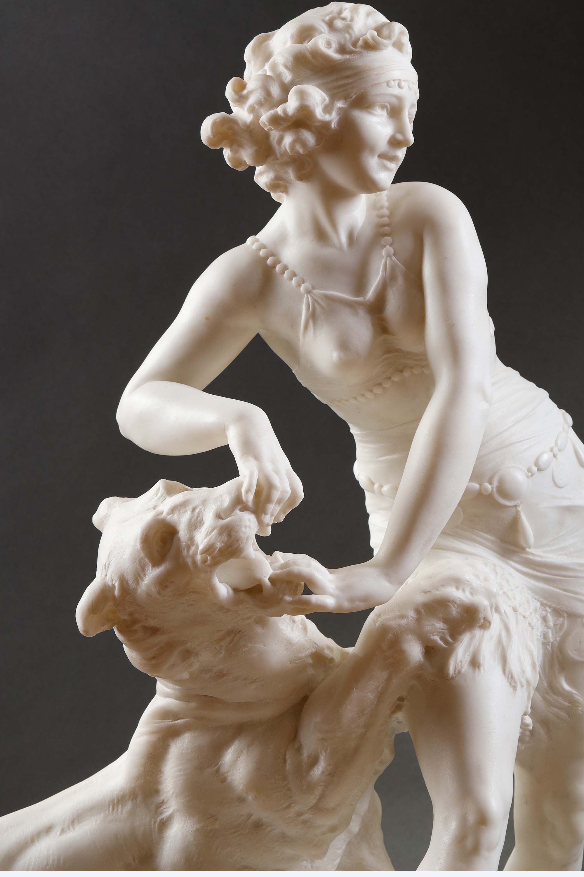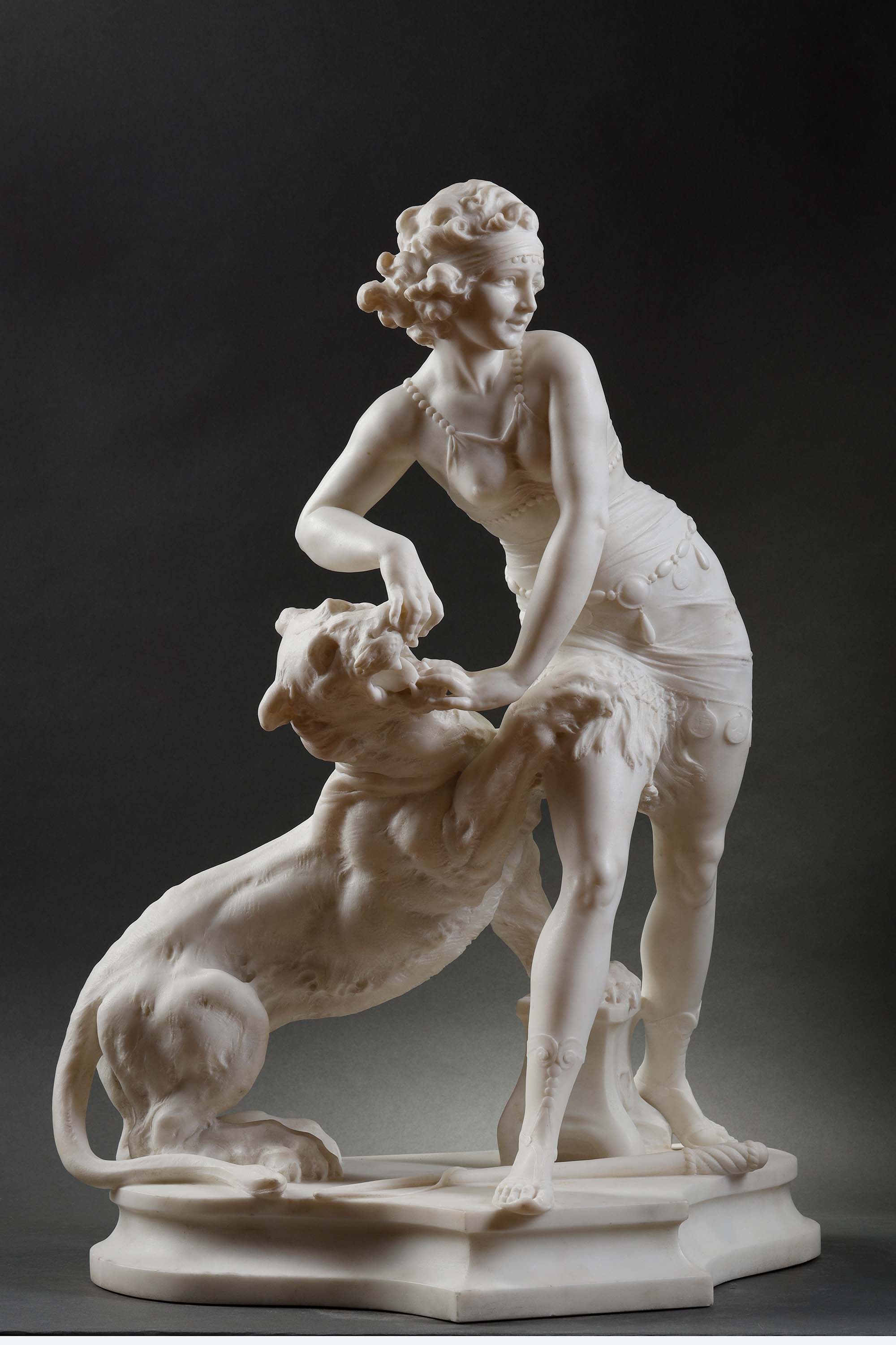 1925年代意大利雕塑家Alfredo Morelli签名创作装饰艺术风格人物主题卡拉拉大理石雕塑作品《驯虎女神》
