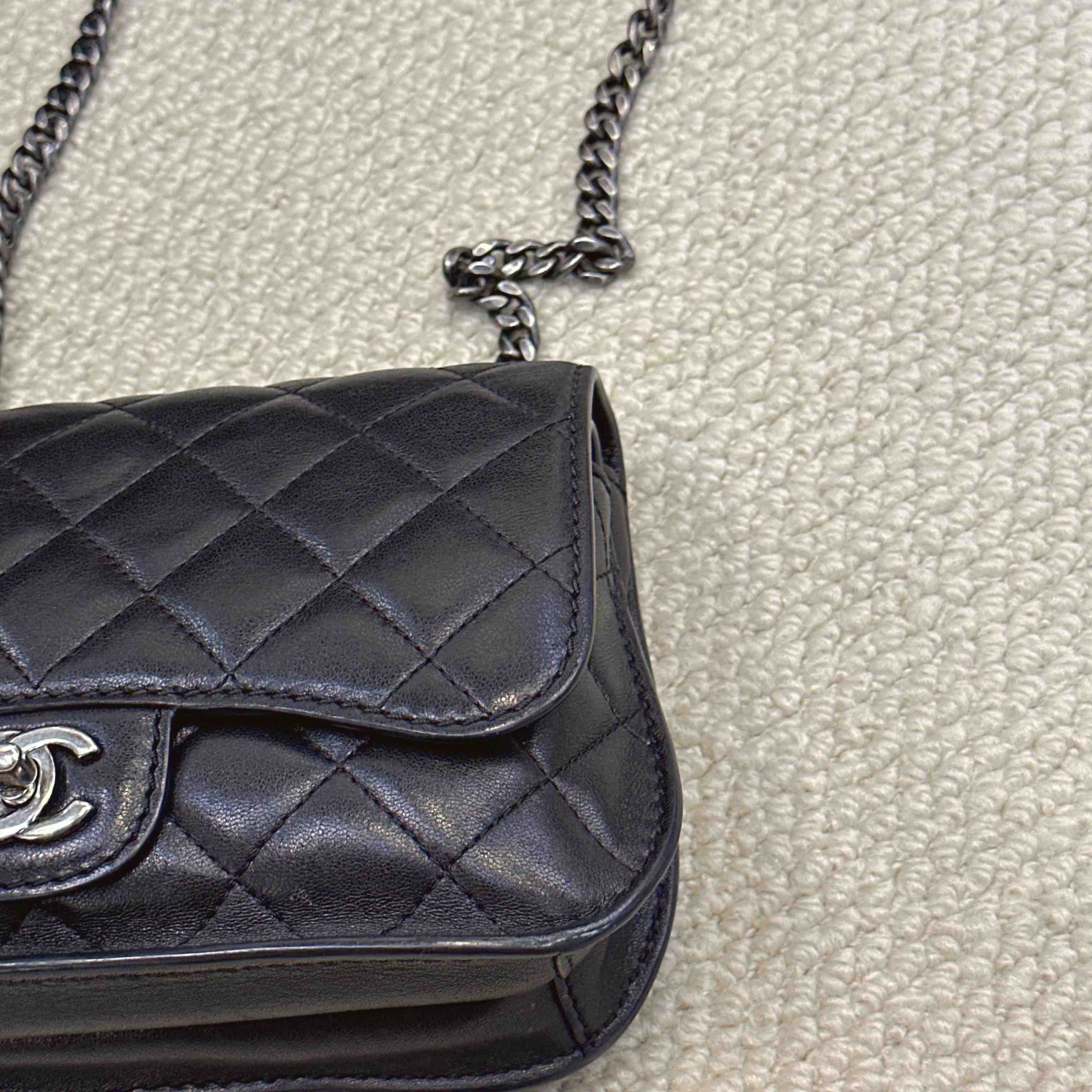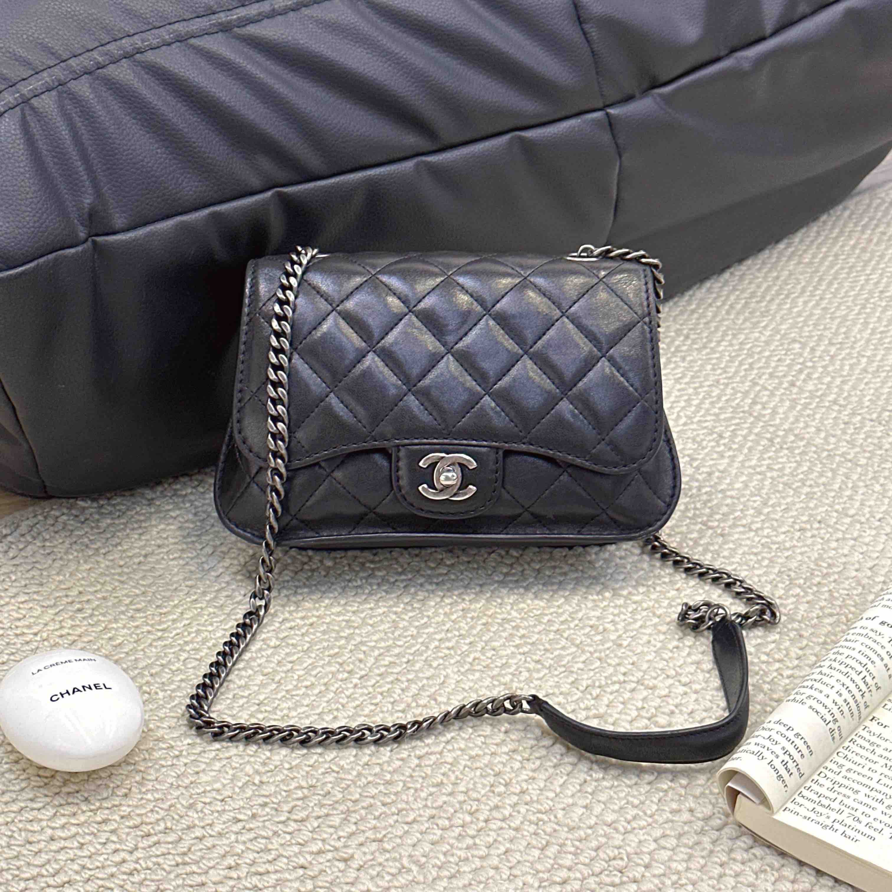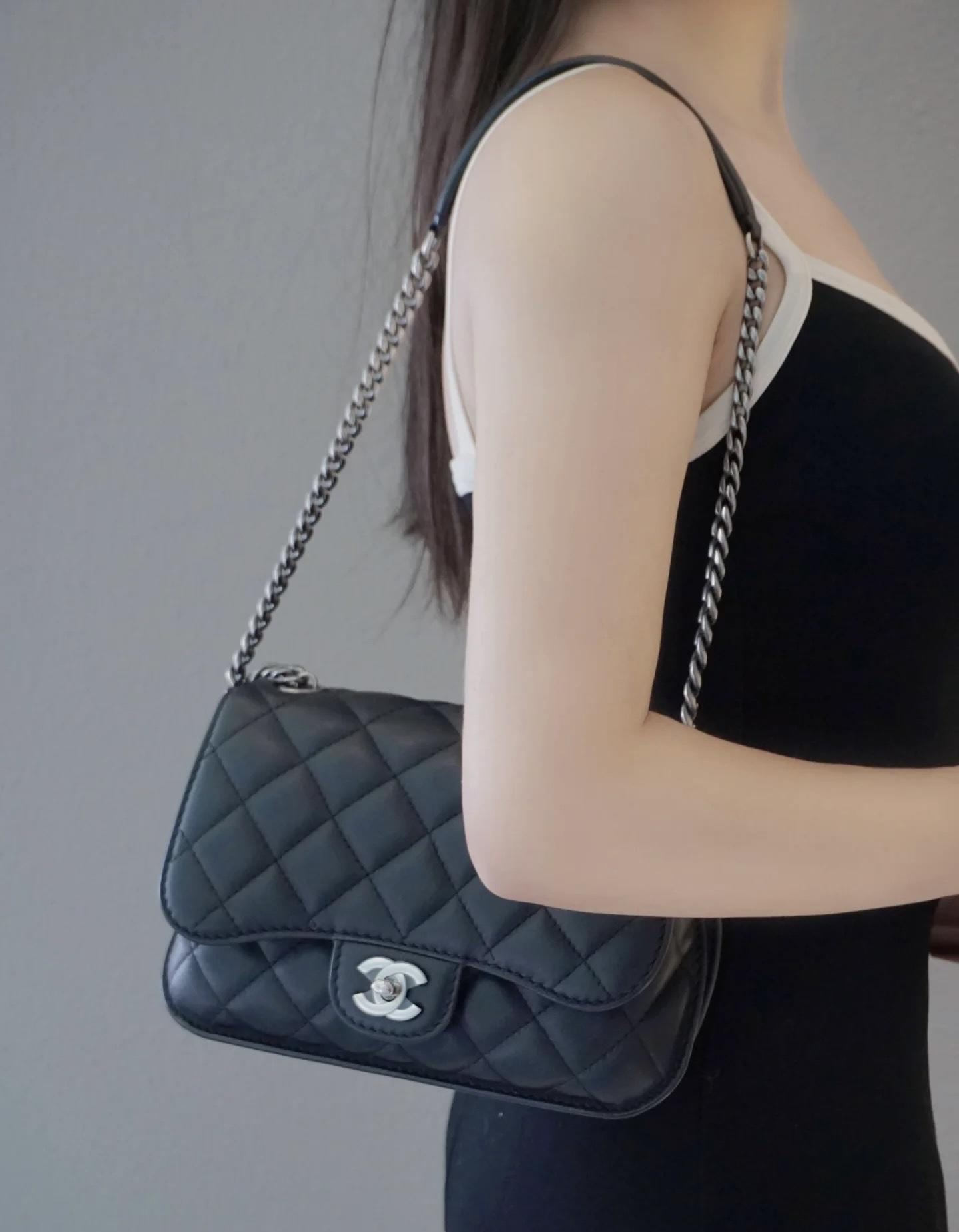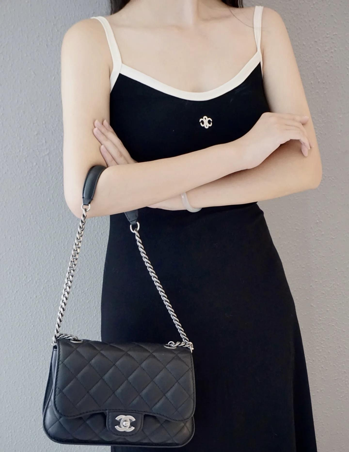 【商品详情】正品二手 chanel cf 方胖子 季节款 黑银 牛皮 斜挎包 🧚🏻♀️95新 25x14 镭射21开 配件:说明书、防尘袋、卡。 肩带和内翻盖有正常使用感 后包口有使用磨损 时尚百搭小包
