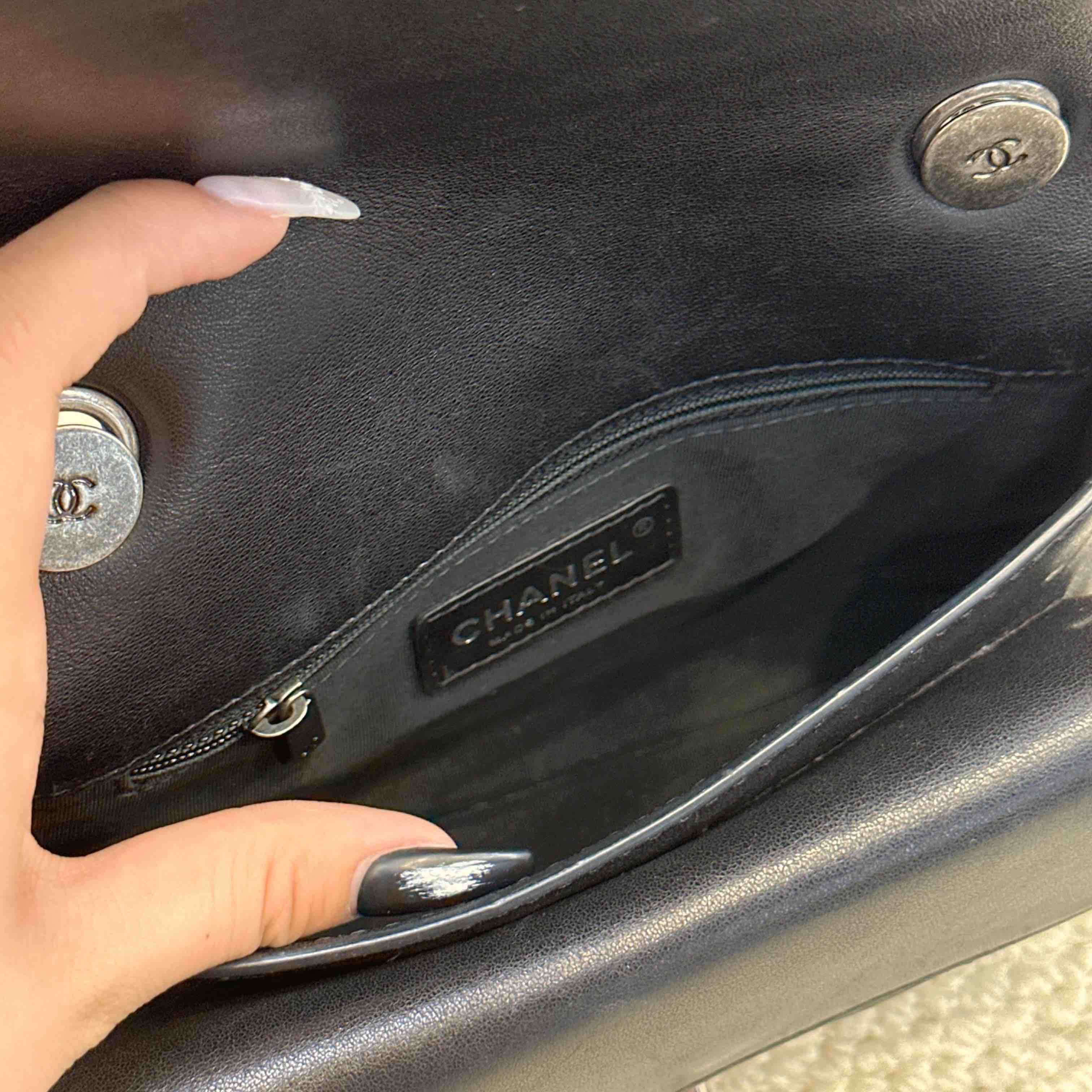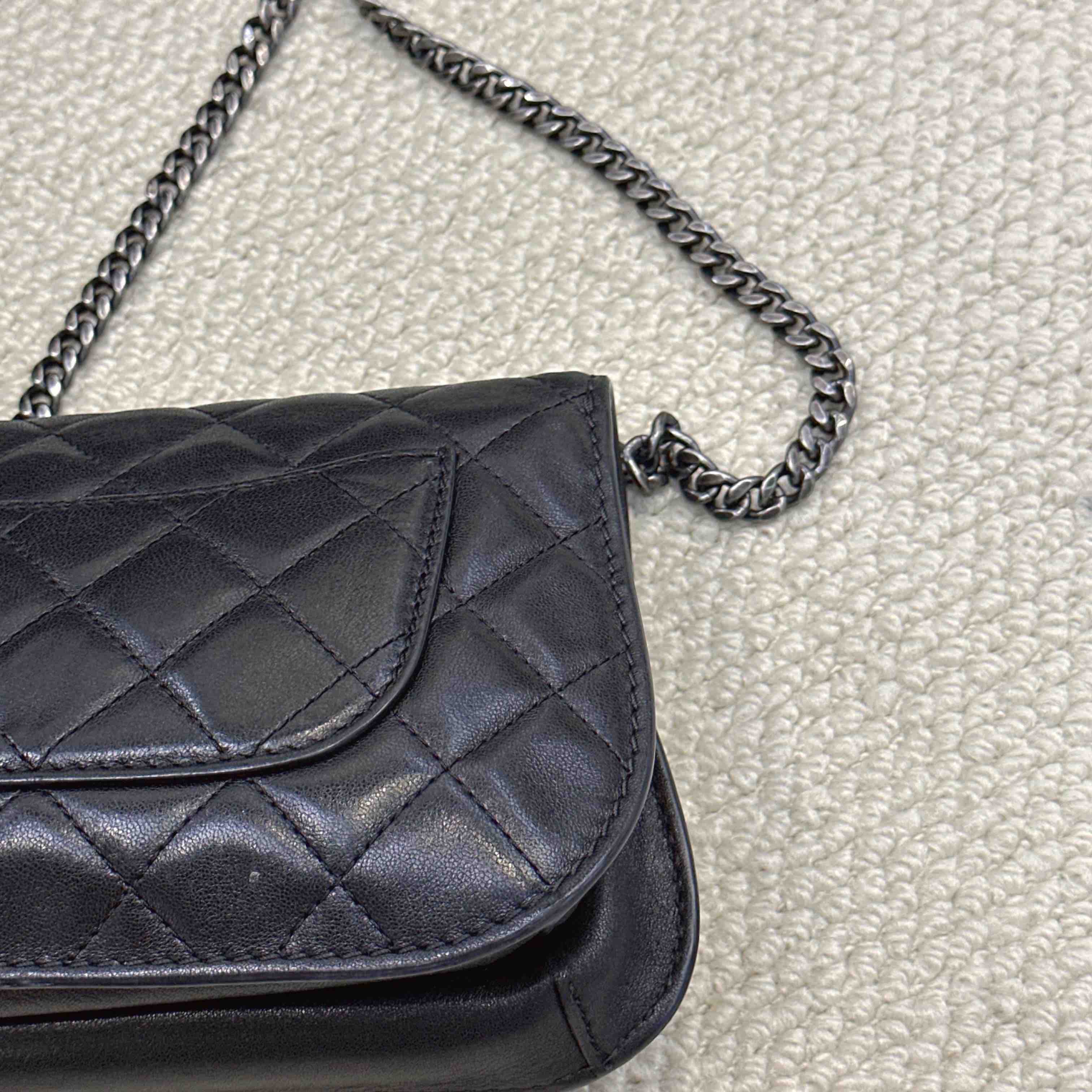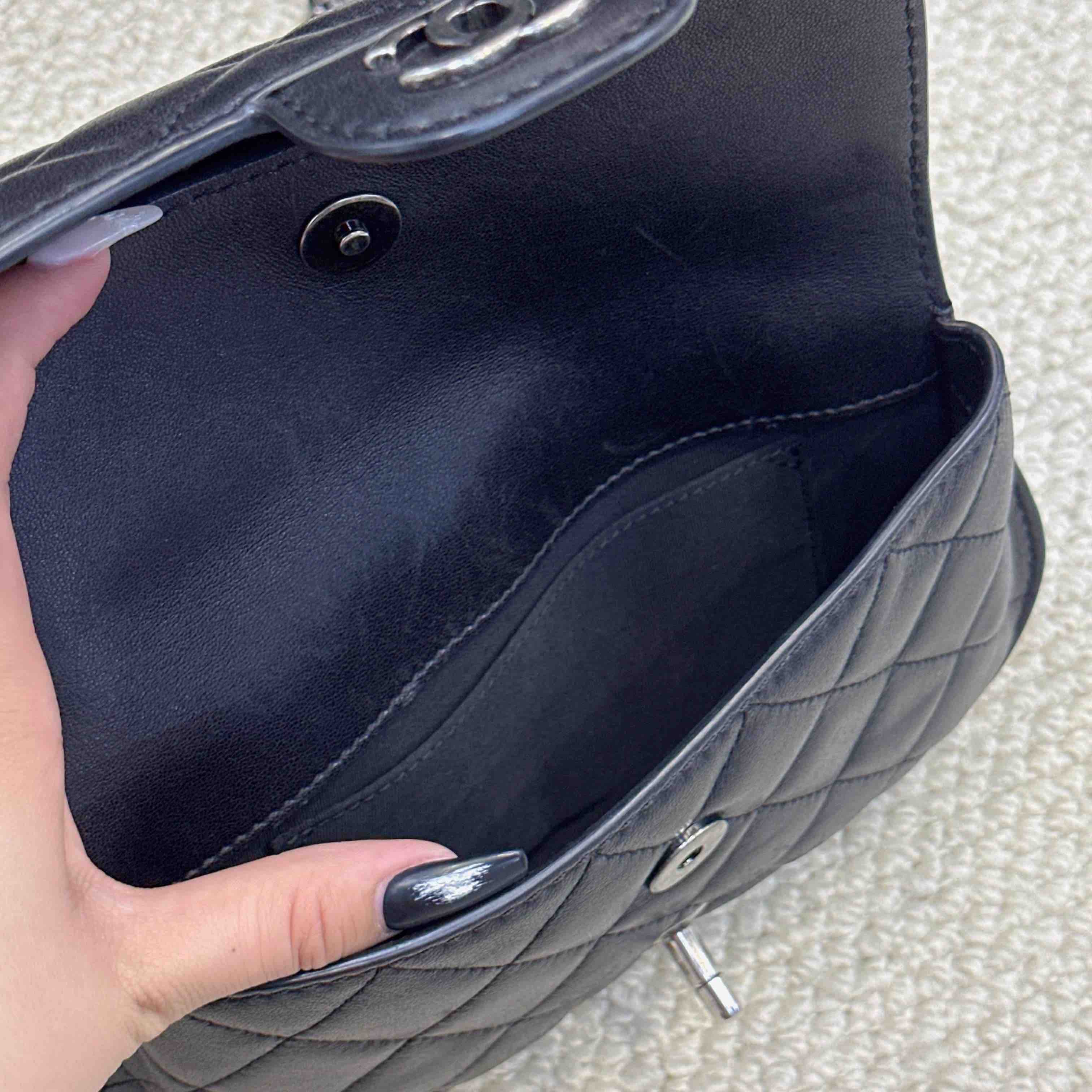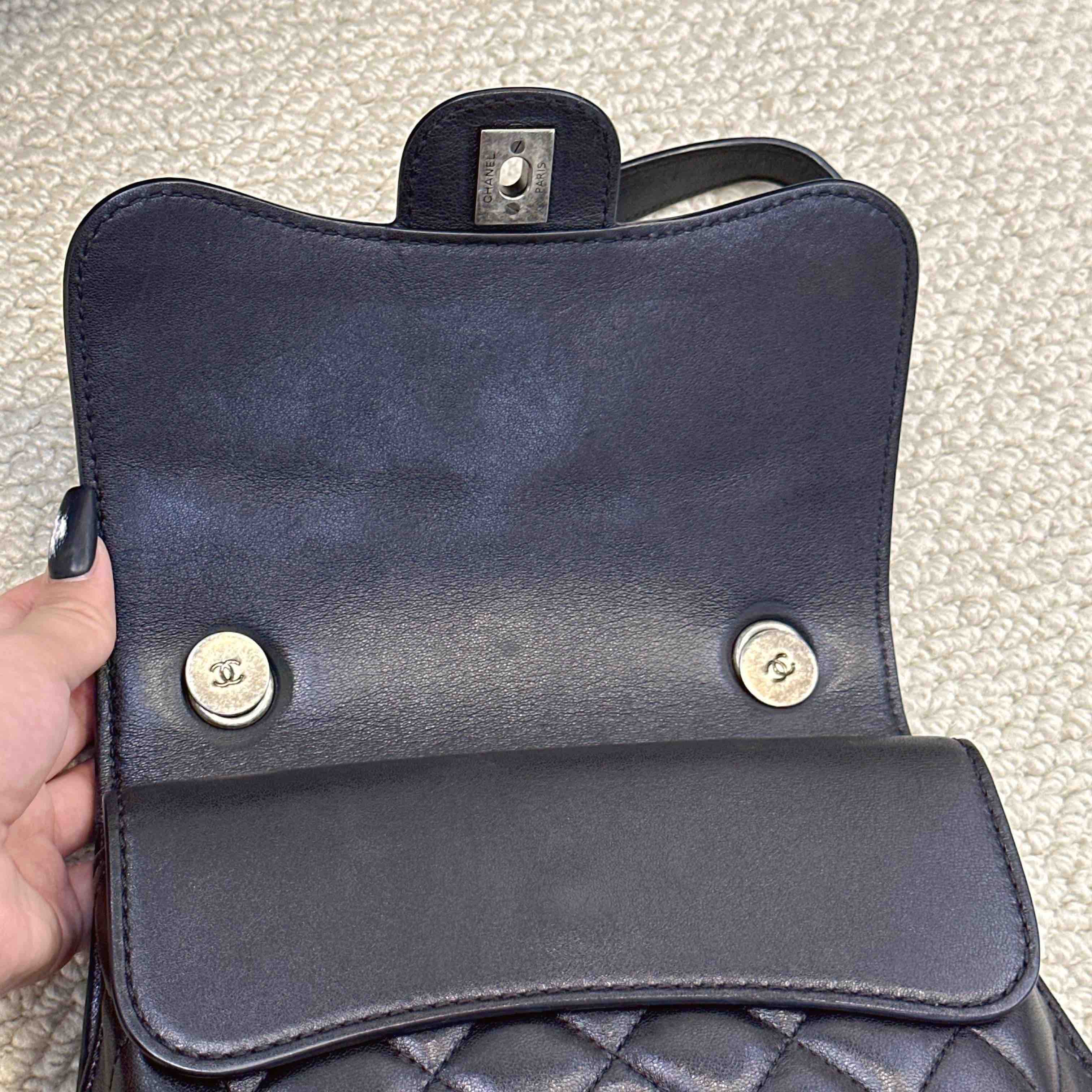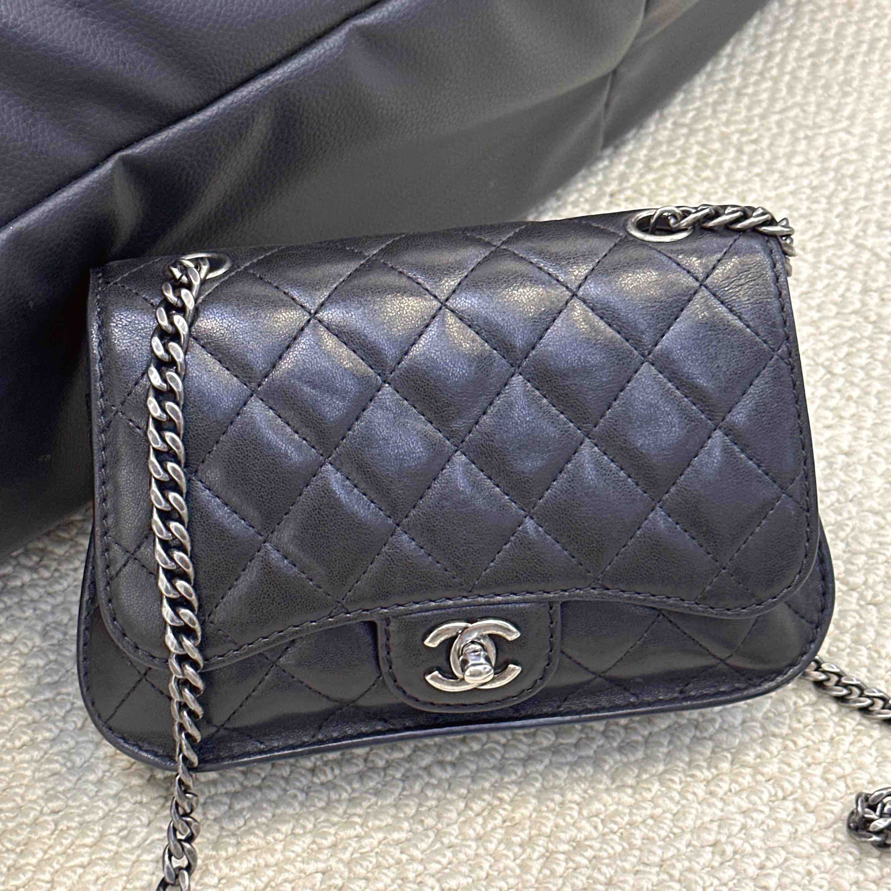 【商品详情】正品二手 chanel cf 方胖子 季节款 黑银 牛皮 斜挎包 🧚🏻♀️95新 25x14 镭射21开 配件:说明书、防尘袋、卡。 肩带和内翻盖有正常使用感 后包口有使用磨损 时尚百搭小包