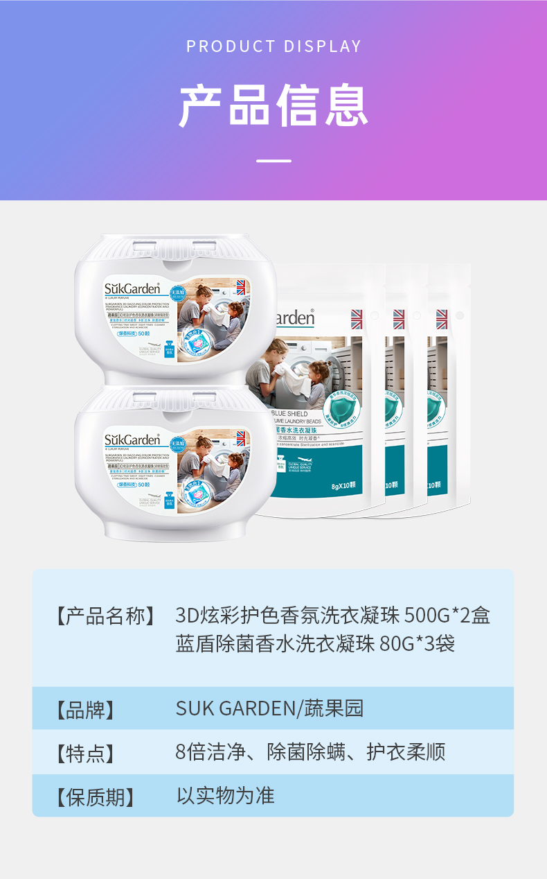蔬果园3D洗衣凝珠(浓缩强效型)-10g*50颗*2盒+蔬果园蓝盾除菌香水洗衣凝珠-8g*10颗(袋装)*3袋