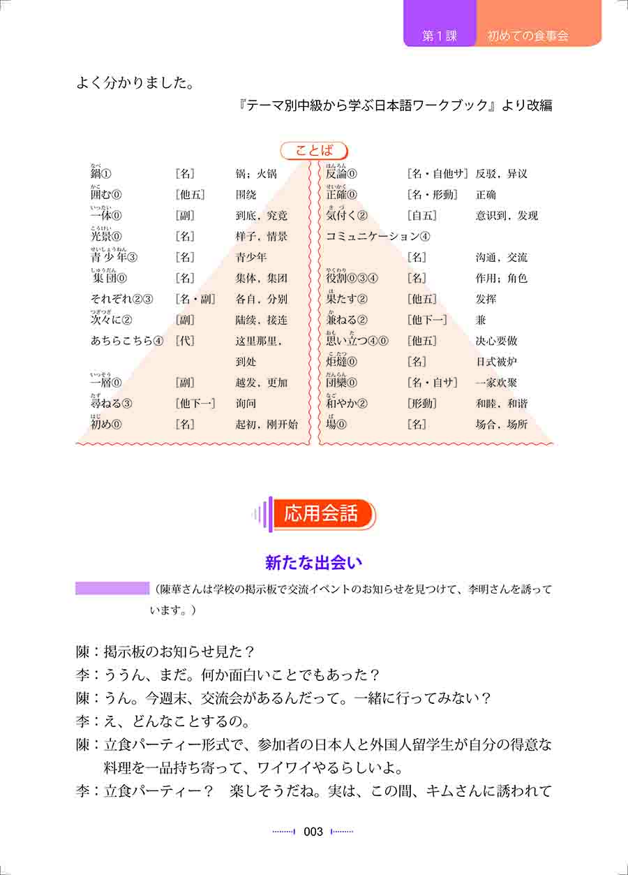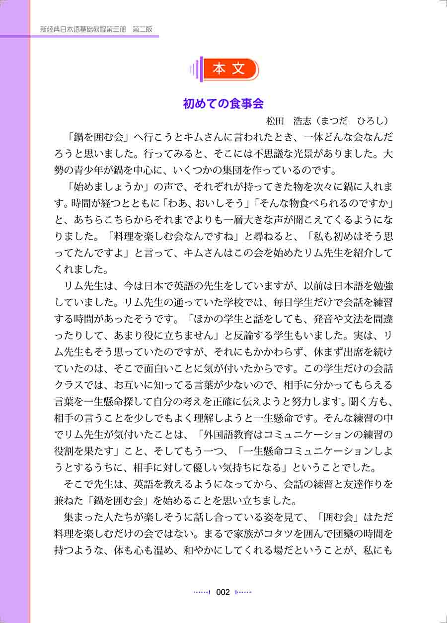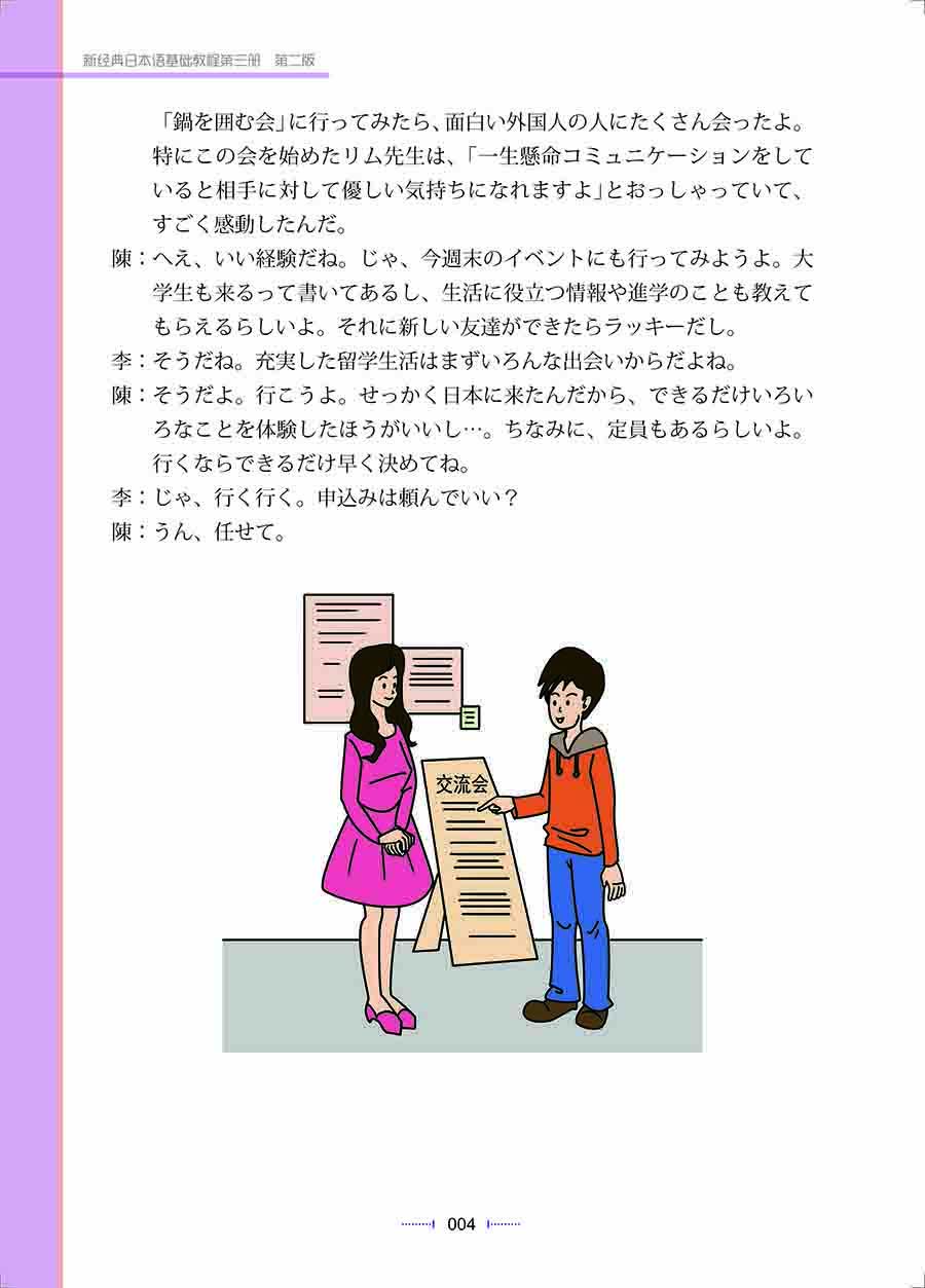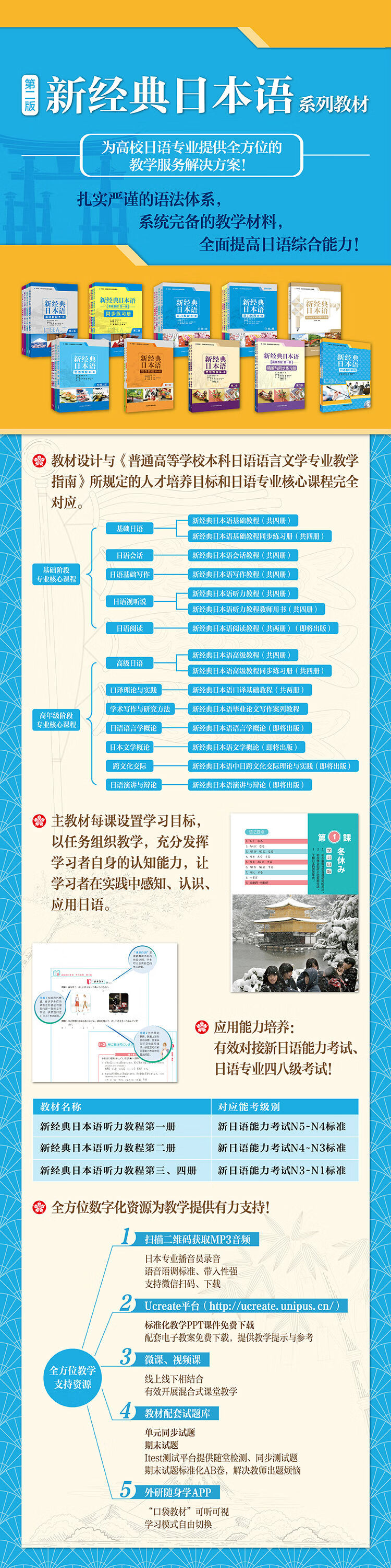 《新经典日本语基础教程第三册:第二版》为"新经典日本语--基础教程"系列的第3册教材,含有16课,包括"气候和日本人的居住环境""日本东西差异""血液和性格""日本的饮食文化"等主题。本教材的会话场景设在日本。内容综合全面,既强化学生语言能力的学习,有涉及小说、散文、演讲、议论文等各类载体;阅读课文的选取既考虑到学习者的学习特点,也考虑到教师的教学需要,做到了趣味性、知识性、实用性、科学性的统一。