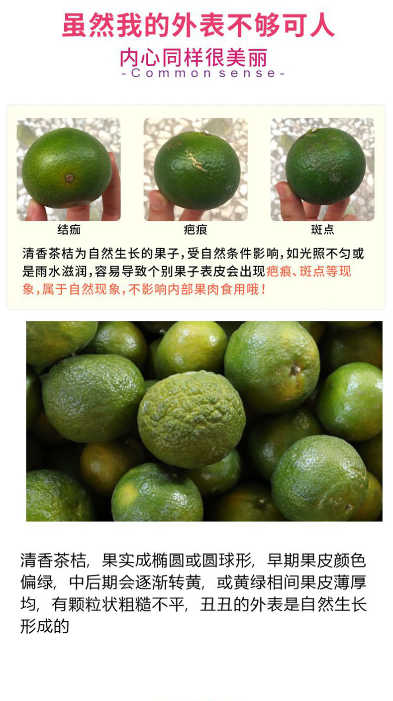1.茶桔属于自然生长,受环境影响,部分果子表皮带有花皮、斑点、颗粒状粗糙不平、带有果籽等情况,属于正常现象,不影响食用,介意者慎拍!