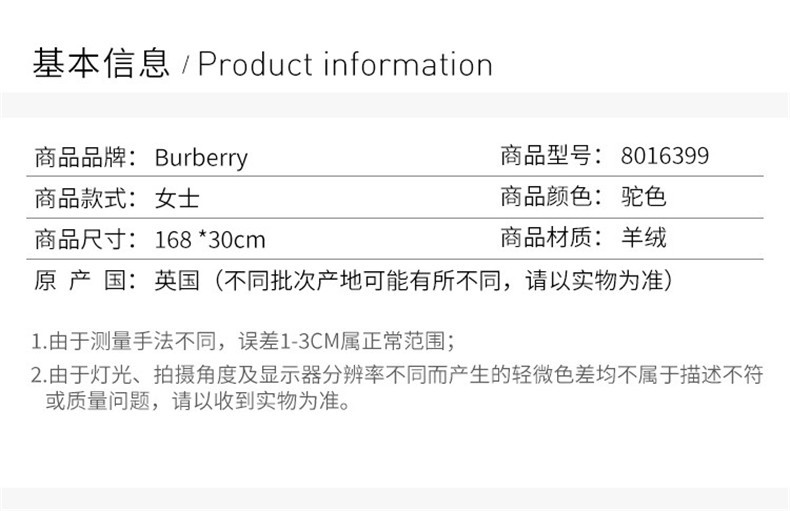 BURBERRY/巴宝莉 女士驼色羊绒围巾 8016399JPY带授权招加盟代理