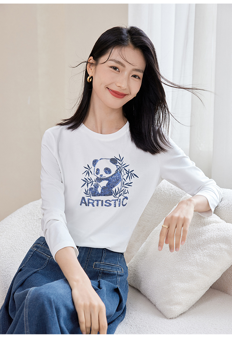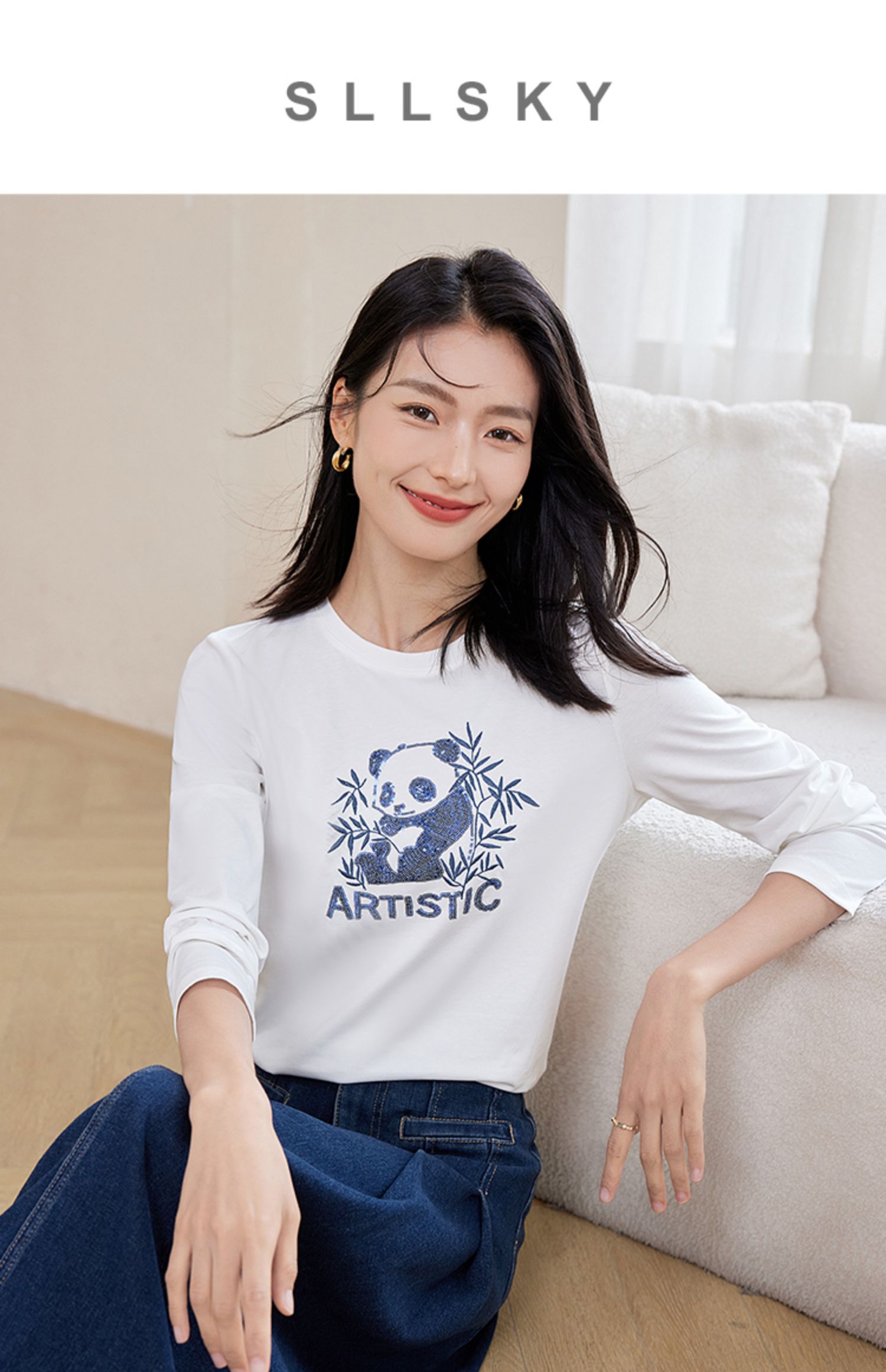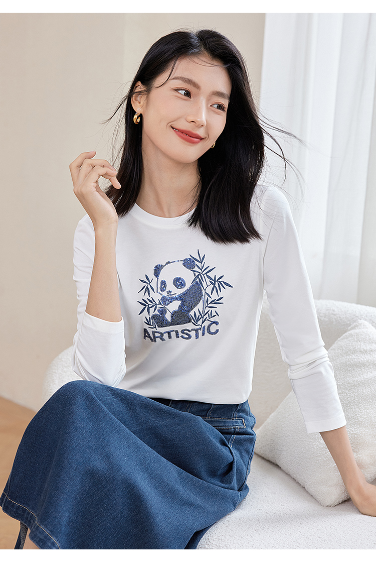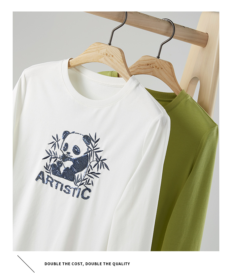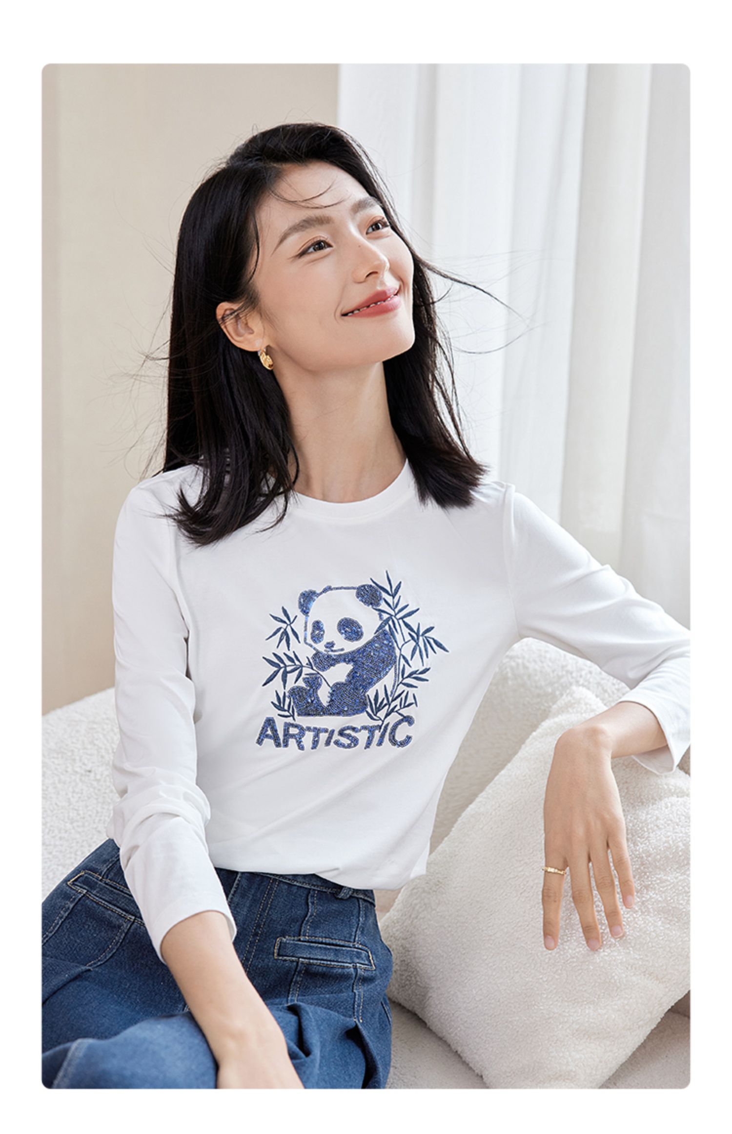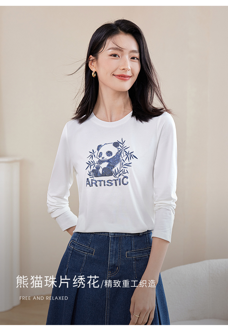 【年终特卖】熙世界2025春秋新款国潮熊猫珠片白色T恤长袖休闲圆领体恤上衣